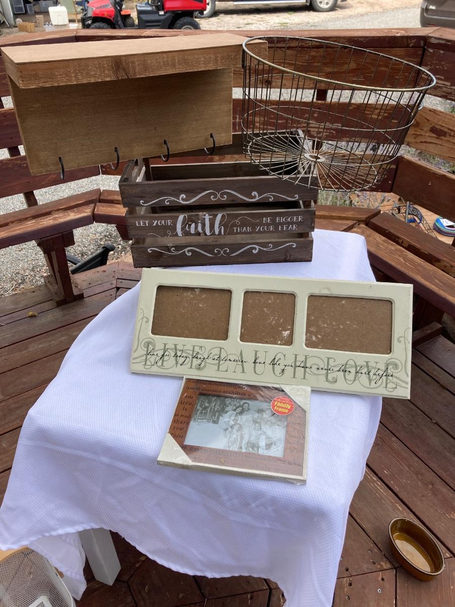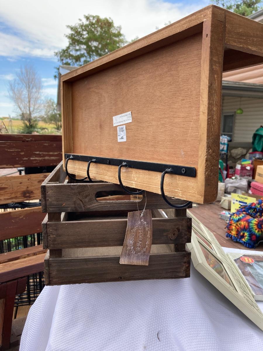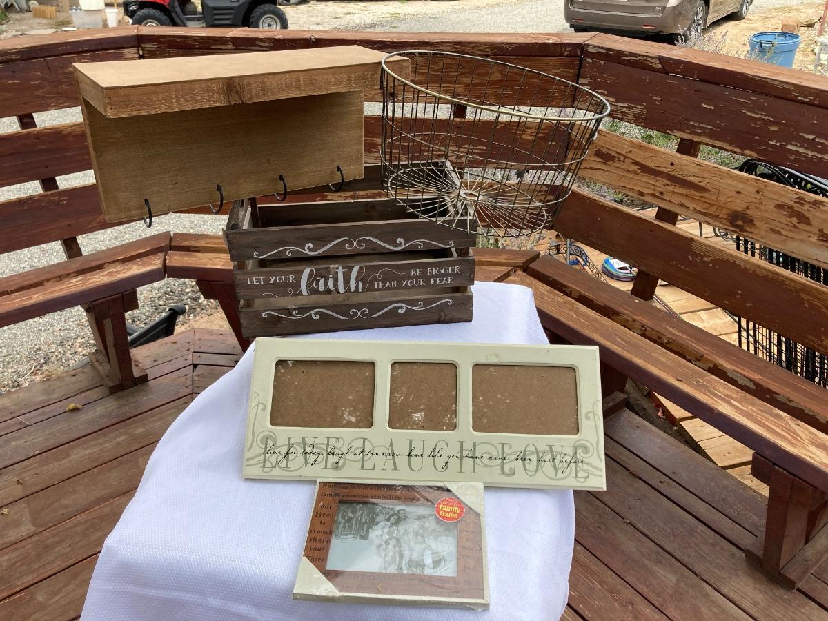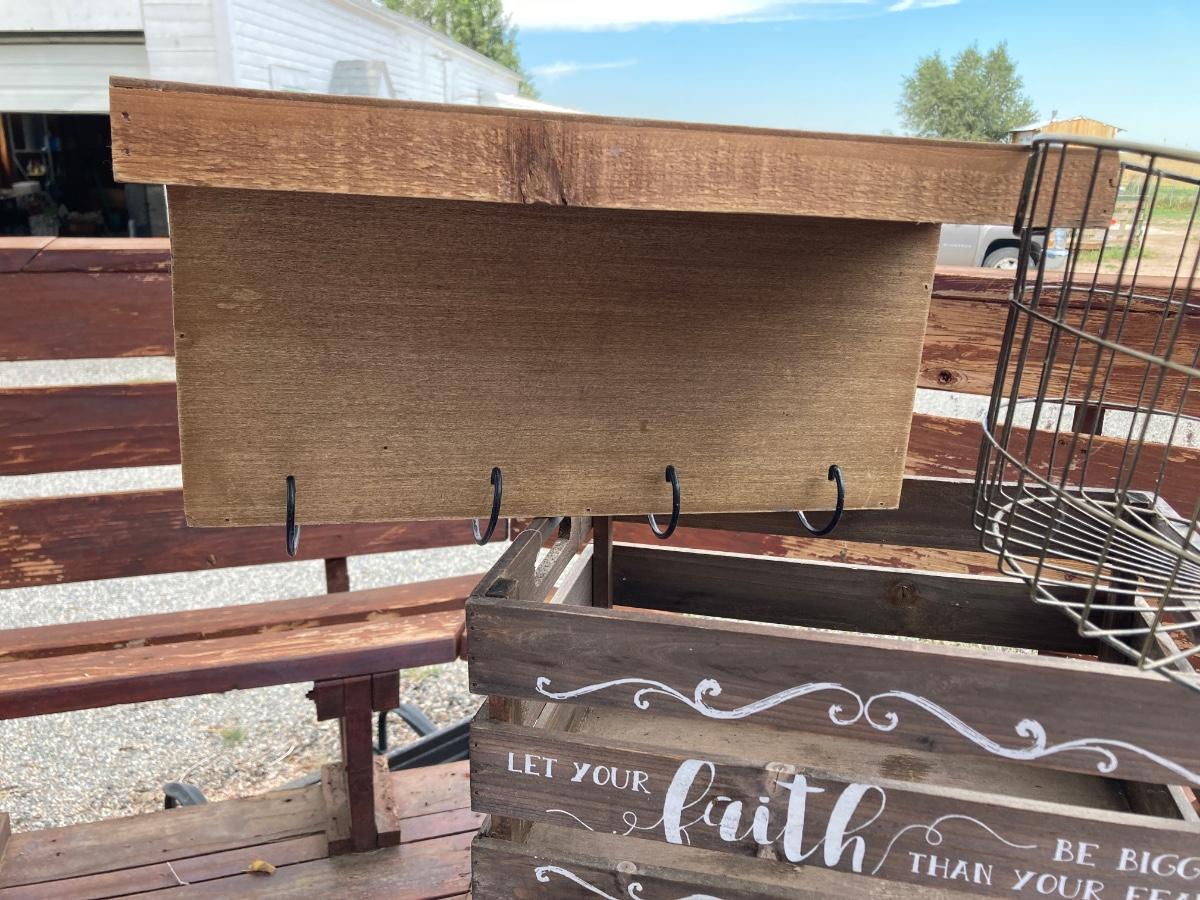 WALL SHELF WITH COAT HOOKS, PICTURE FRAMES, WOODEN CRATE BOX, WIRE BASKET
