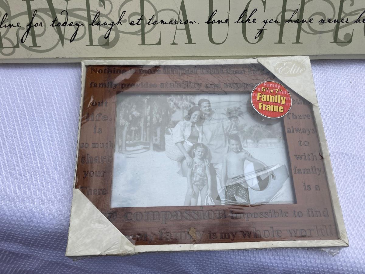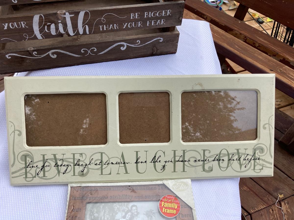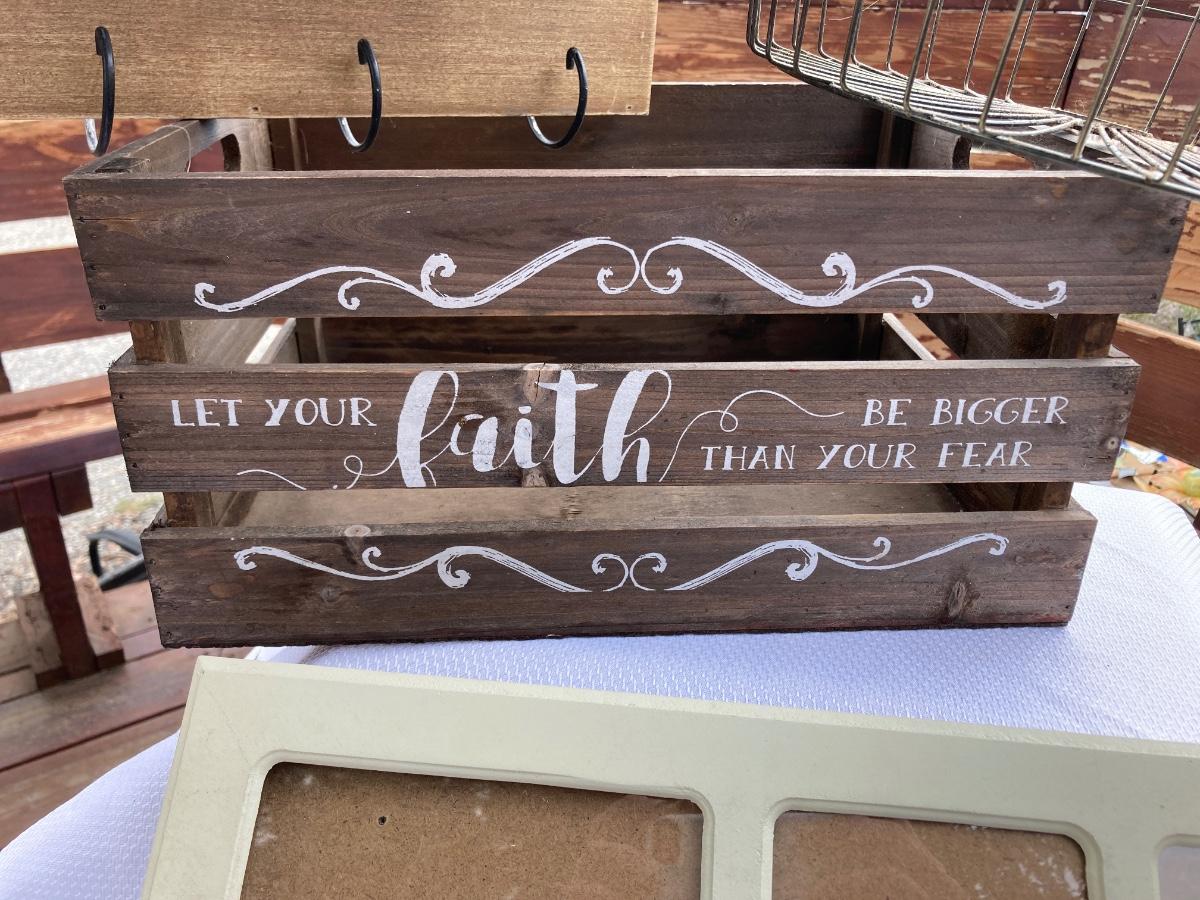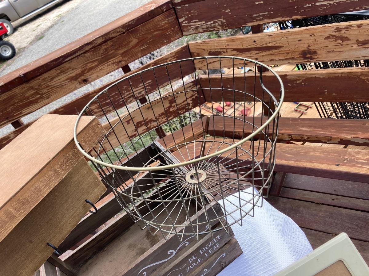 WALL SHELF WITH COAT HOOKS, PICTURE FRAMES, WOODEN CRATE BOX, WIRE BASKET