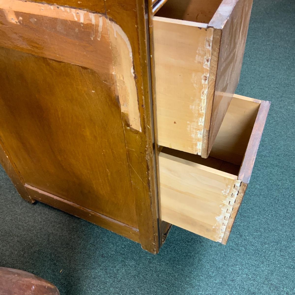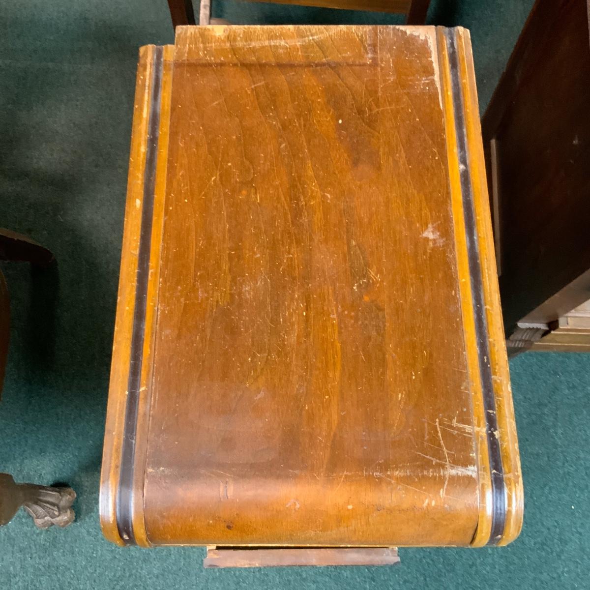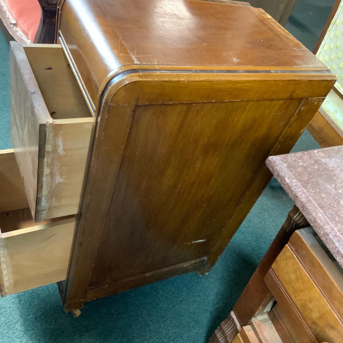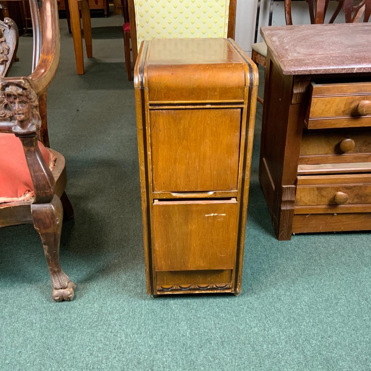 Art deco night stand with incredibly convenient wheels on the base. //::\\ Please see photos for details and condition. No attempt has been made to hide any imperfections. All items listed in this auction are warehouse items, and need to be cleaned. A majority of the items need restoration as well. All items are sold AS IS and WITHOUT GUARANTEE. If you are uncertain about an item, DO NOT BID. Due to the nature of this online auction in-person inspection is HIGHLY recommended. All Sales are FINAL. Pick Up Times are FIRM. Please confirm with your own schedule that you can pick up in the scheduled times listed in the Terms and Conditions. Any questions please message the auctioneer. DO NOT Contact The Harp Gallery.