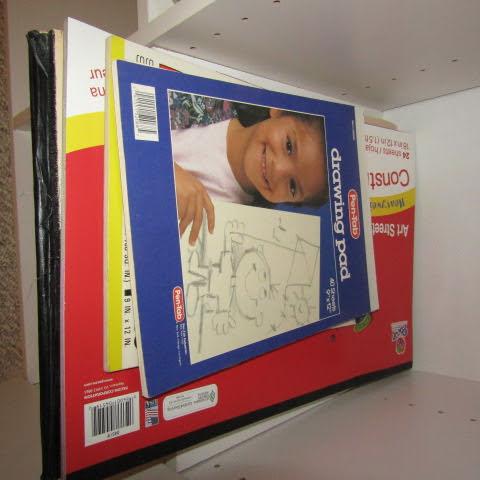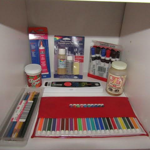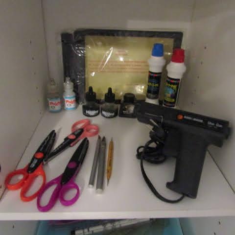 MISCELLANEOUS LOT OF ART SUPPLIES AND CRAFTING MATERIALS. PAINTS, SCISSORS, HOT GLUN, GUN, MARKERS, PAPER. SET OF BIRDHOUSES AND WOOD CRAFTS.