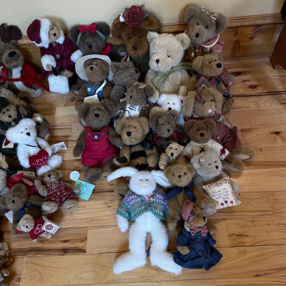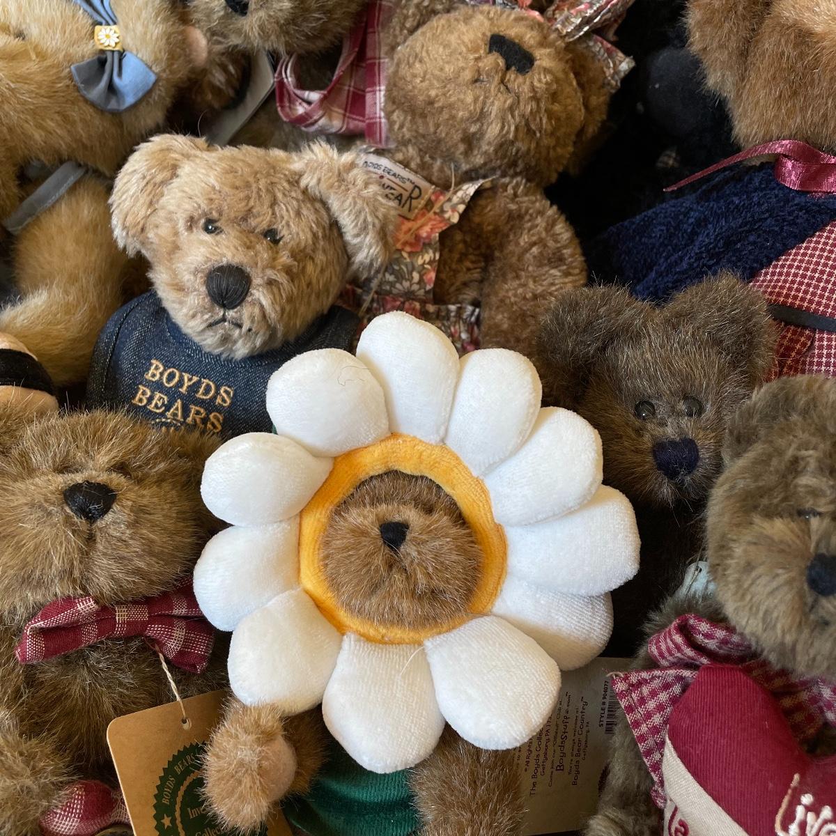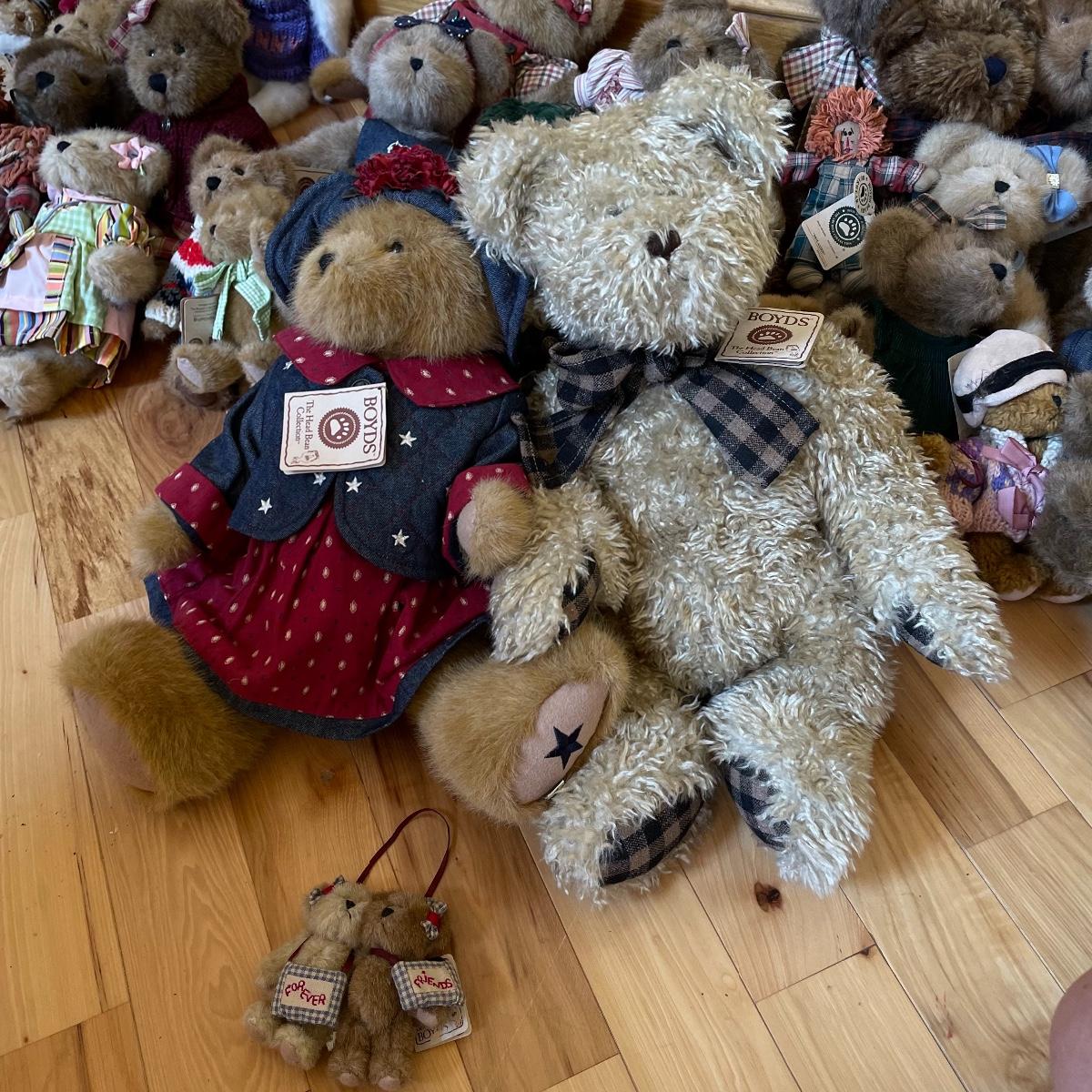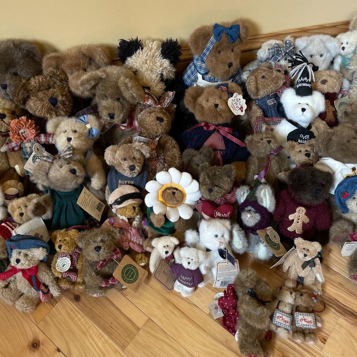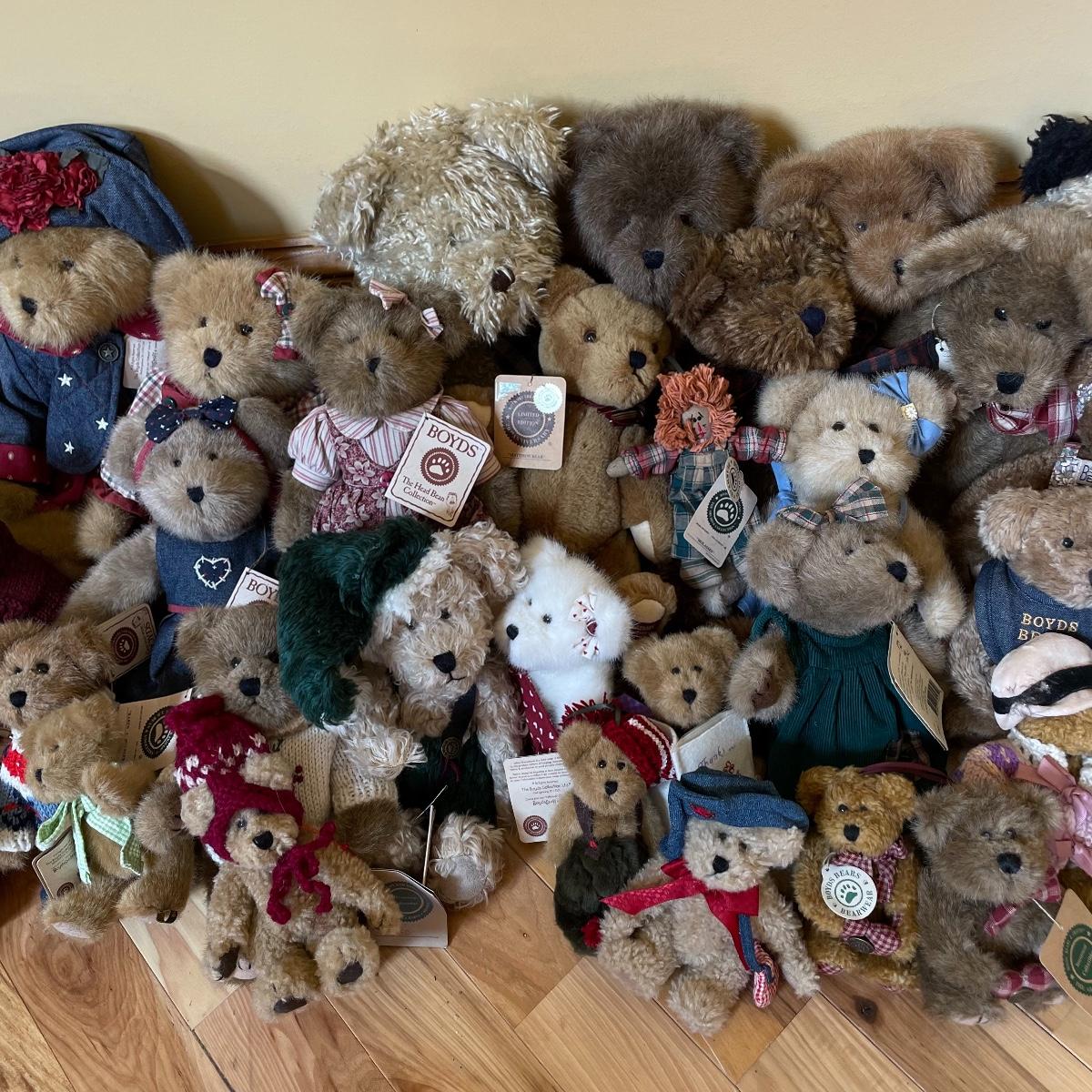 A beary great find for the Boyd’s collectors and teddy bear enthusiasts. These fuzzy friends are ready to be gifted or displayed in your home! Lot includes about 65 bears with the seller’s tags (almost all the bears and bunnies have Boyd’s tags sewn to their bodies). There are also about twenty more bears and bunny without the paper sale tag; these are shown to the right of the Santa bear on a maroon metal Boyd’s stand. All bears range in between about 3.5” to the largest at 18”. See images. Find some super cute Boyd’s accessories in lot 249. Local pick up only.