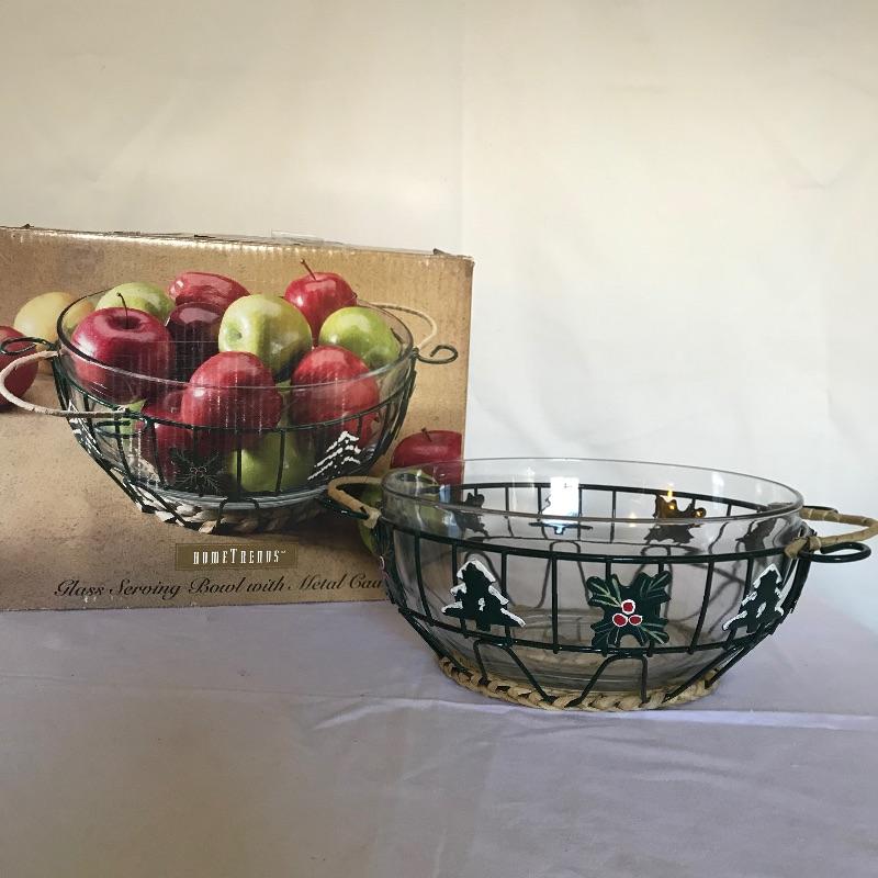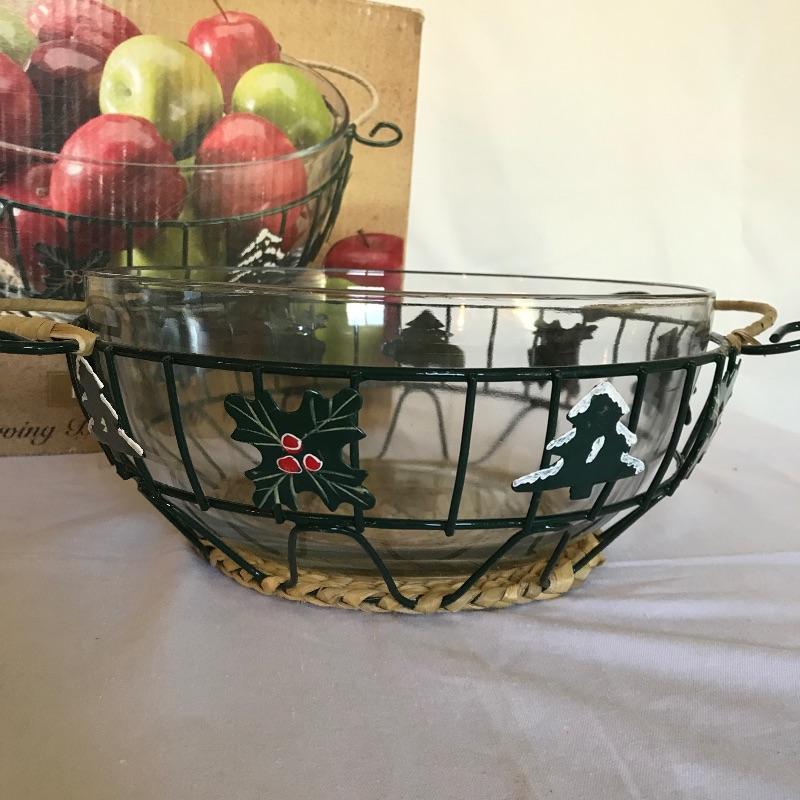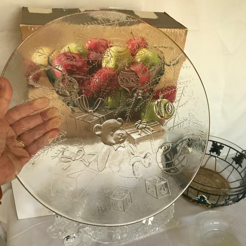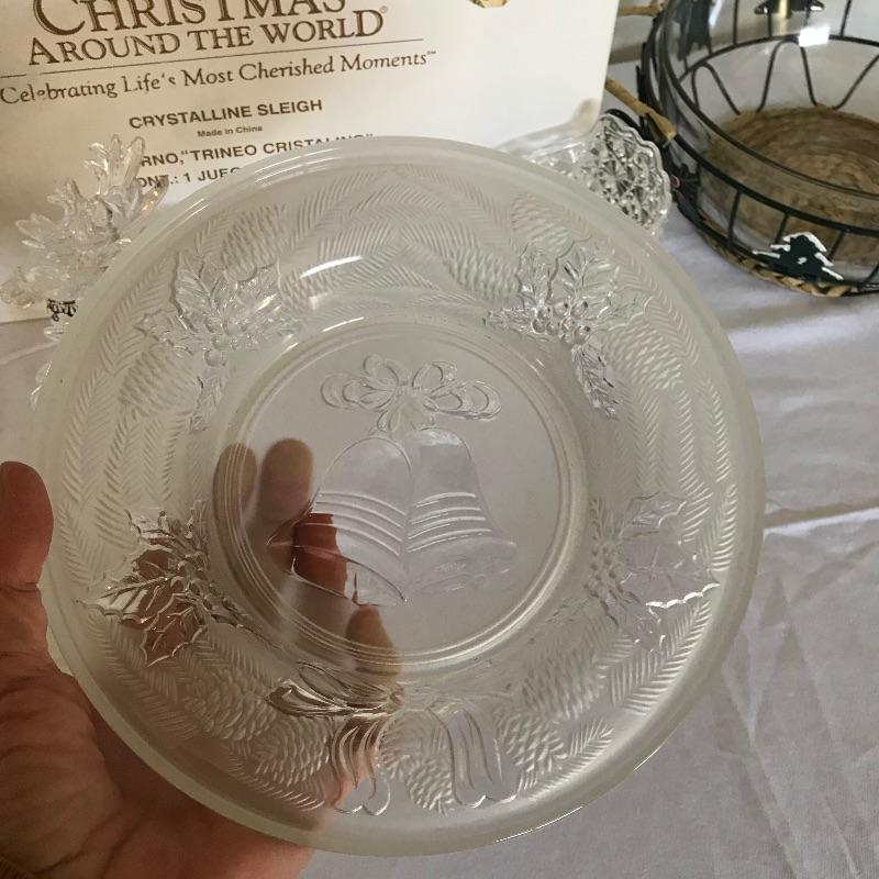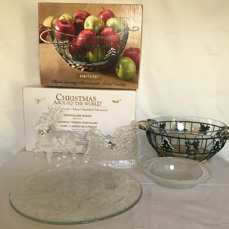 Lovely holiday selection of glass serving dishes with House of Lloyd decor. Lot includes large glass bear plate and smaller Christmas bell dish. A nice metal and woven basket with heavy glass 11”d bowl insert. Glass bowl is very nice and can be used outside holiday season. Lot also includes vintage 7.5” tall House of Lloyd Christmas Around the World crystalline sleigh. See photos. No shipping.