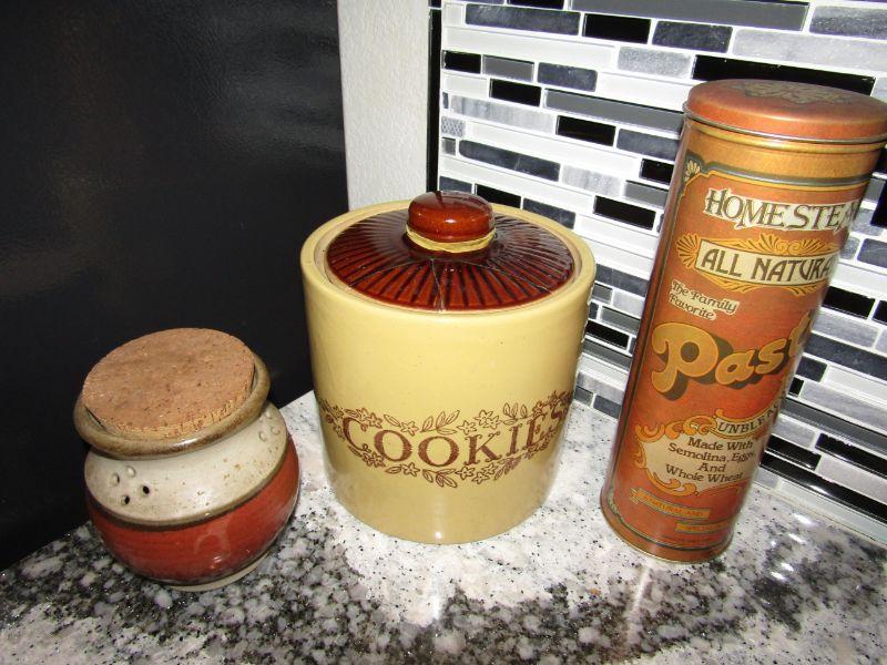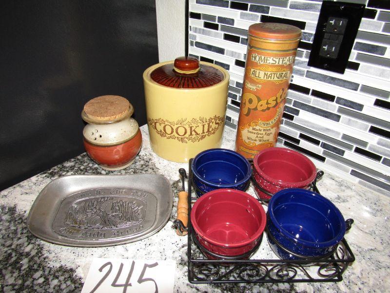 LOT 245 CLAY BOWLS, COOKIE JAR, PEWTER TRAY