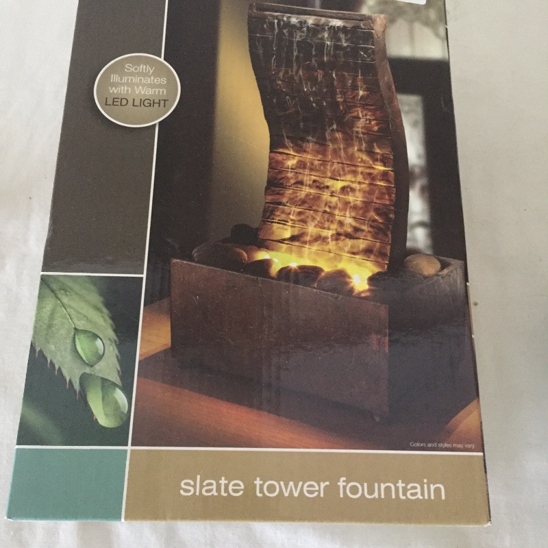 Tone up with this nice collection of exercise equipment that includes 9 hand weights that vary in weight from 1 to 5 pounds, a thigh toning kit, foot roller, exercise DVD’s and a contour whole body set of wedges that offer support and comfort whilst sitting, laying down or stretching. Lastly a slate tower fountain still in the box.