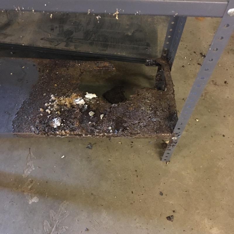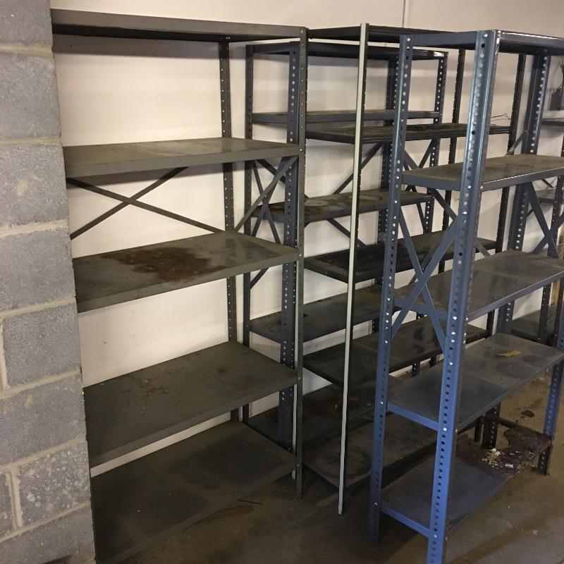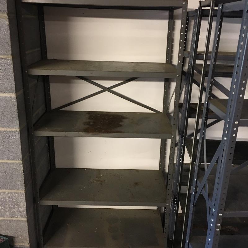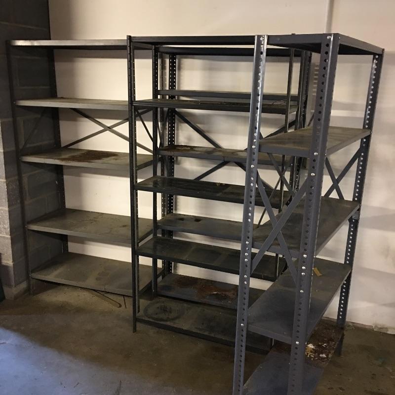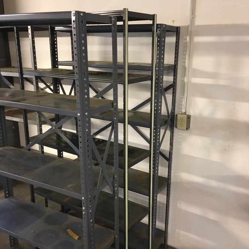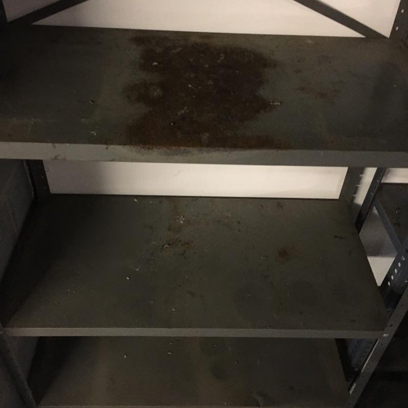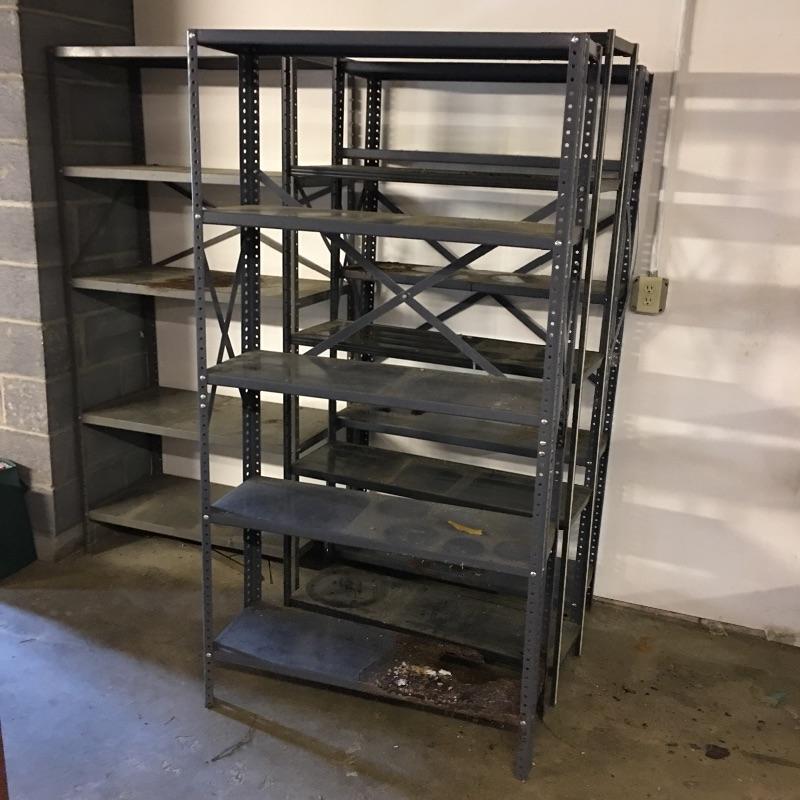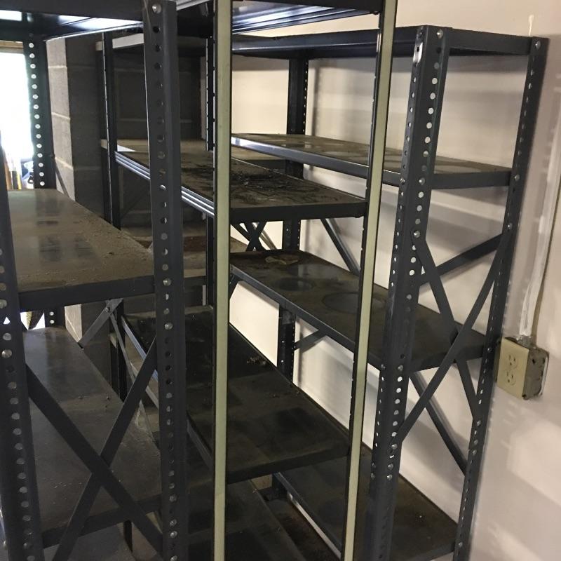 Another chance to get some sturdy metal shelving units. More of the same in Lot 243. Included are three adjustable shelf units that measure 12” x 36” x 71” and one adjustable shelving unit that measures 17.75” x 35.75” x 71.75”. One shelf has had something eat through the metal and one had something spilled on it, see pictures.