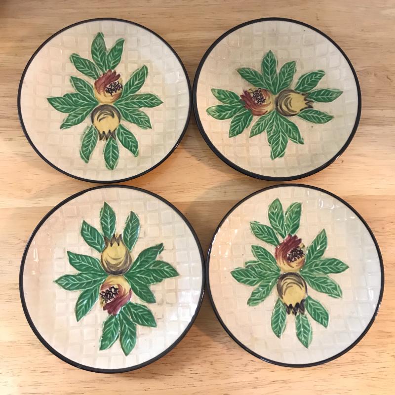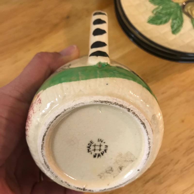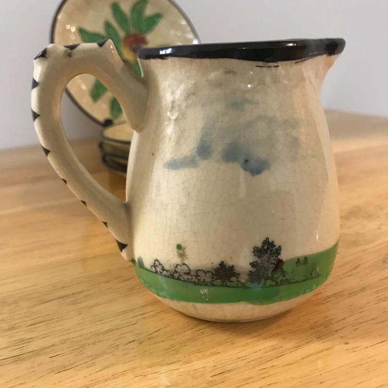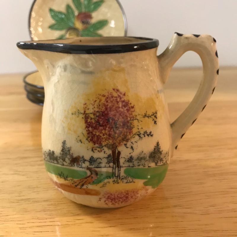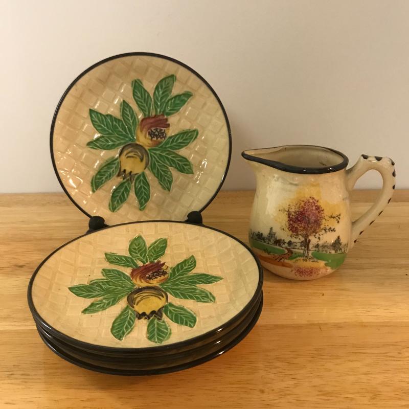 Lovely small pitcher with a delicate panoramic landscape is accompanied by a set of four hand painted 6.25” plates. All markings state Japanese origin. Shipping available or local pick up in Arden, NC.