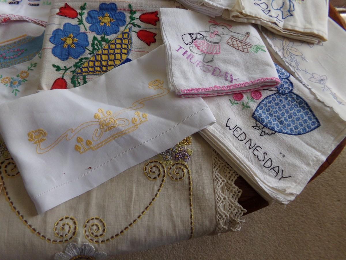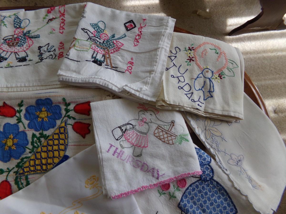 CUTE LOT OF HAND-EMBROIDERED AND DECORATED TEA TOWELS.