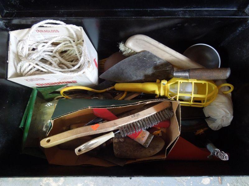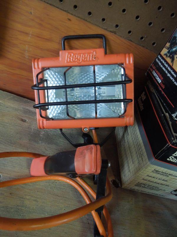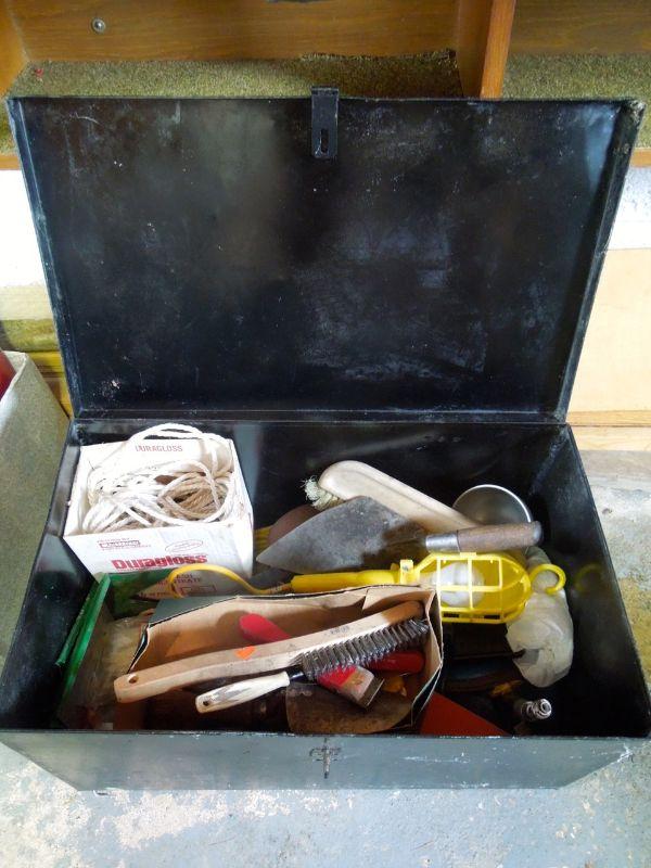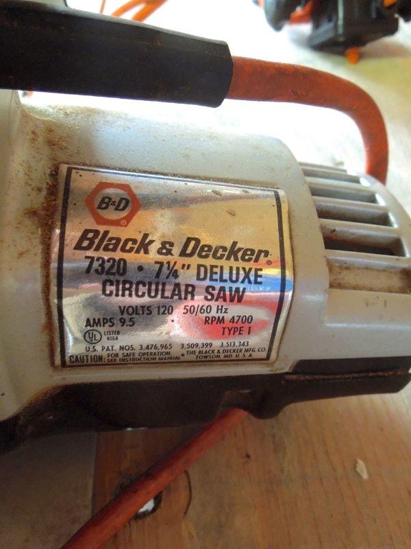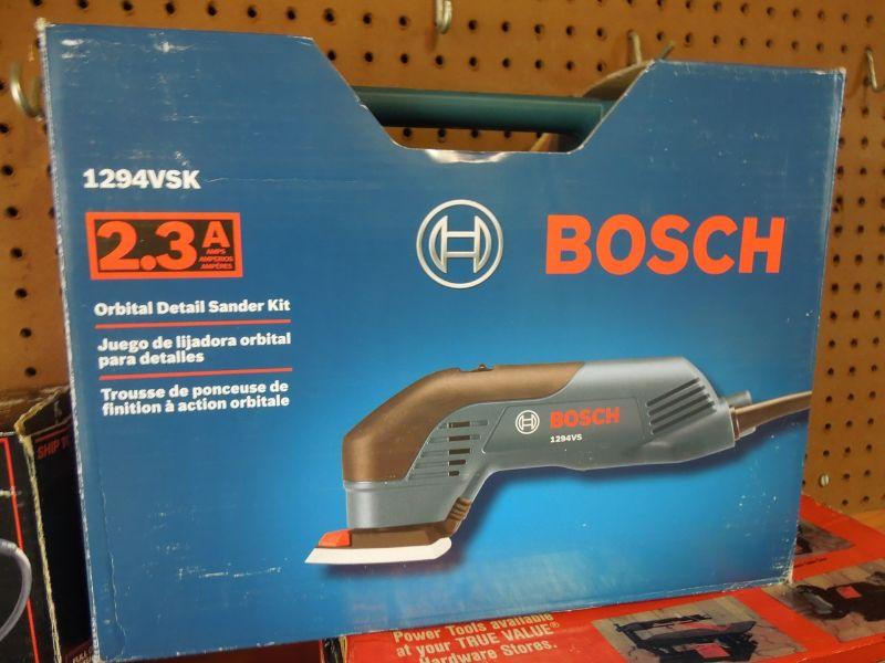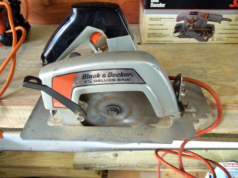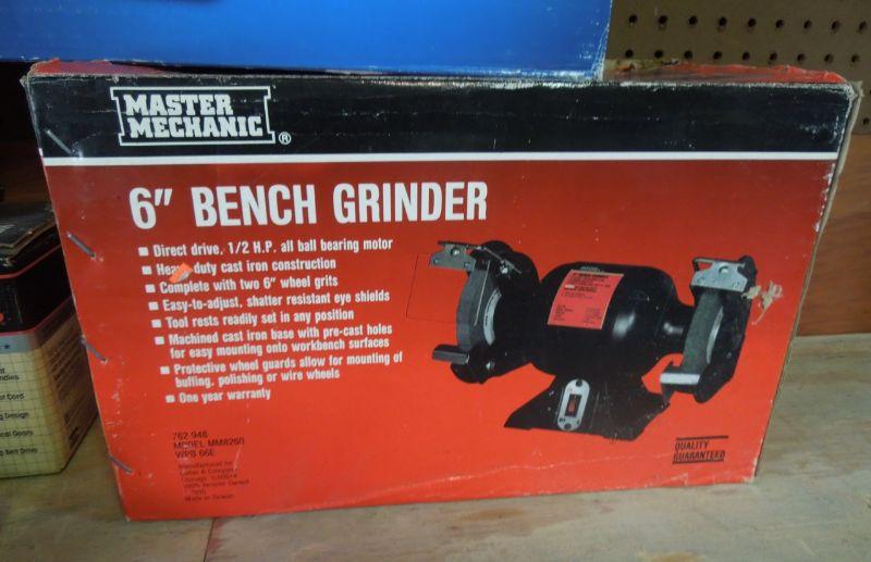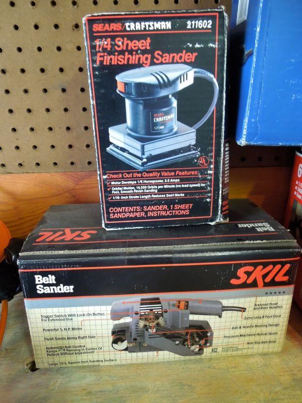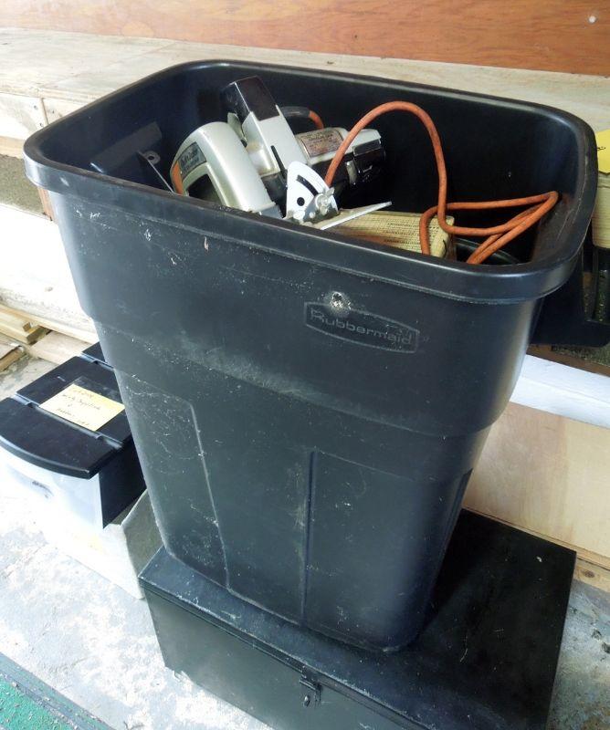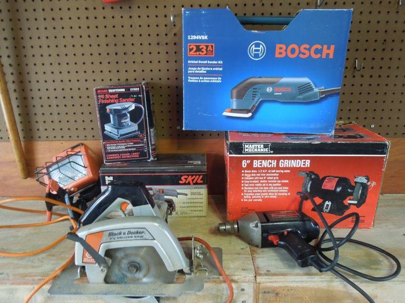 Wow! a Master Mechanic Bench Griender; Bosch Orbital Sander with extra belts; Craftsman 1/4 sheet finishing sander; Skil Belt Sander; Orange and Black work light with clamp; Black & Decker 7.25" circular saw; Craftsman 3/8" electric drill; an older black tin tool box about 29" wide with contents; and a black plastic trash can without lid.
