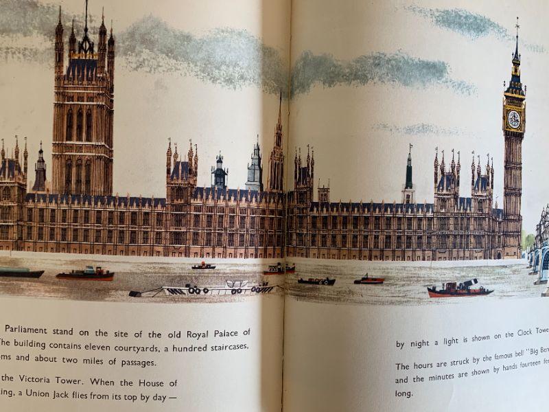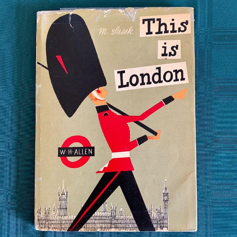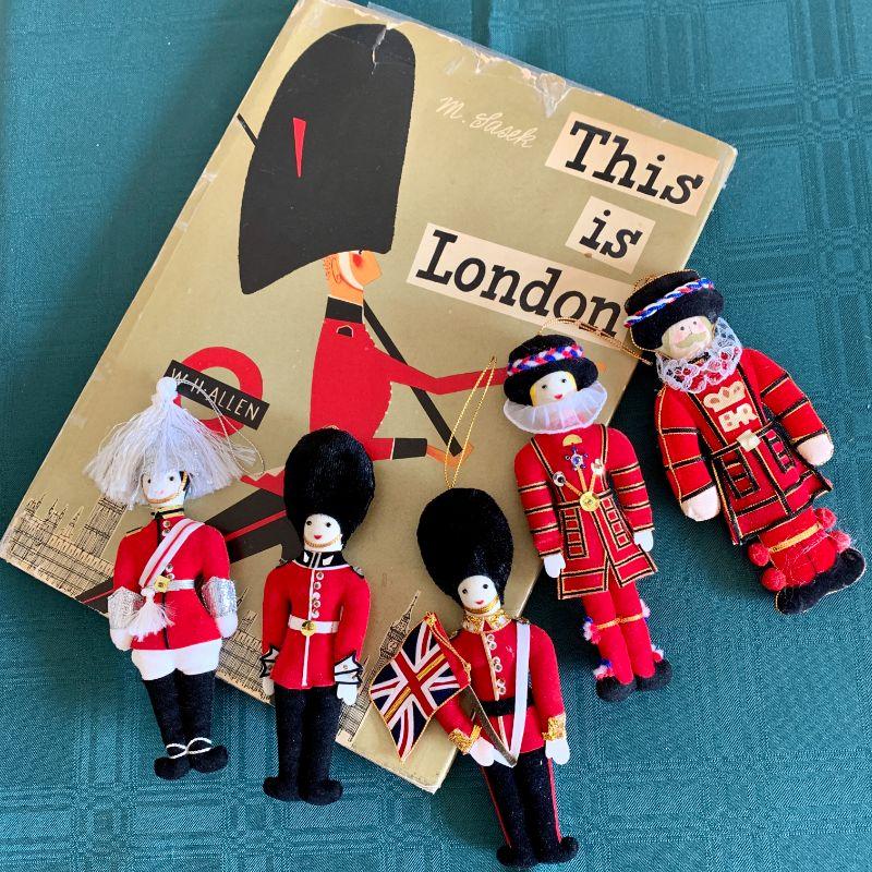 5 cloth dolls dressed as British Royal Guards and children's book This is London.