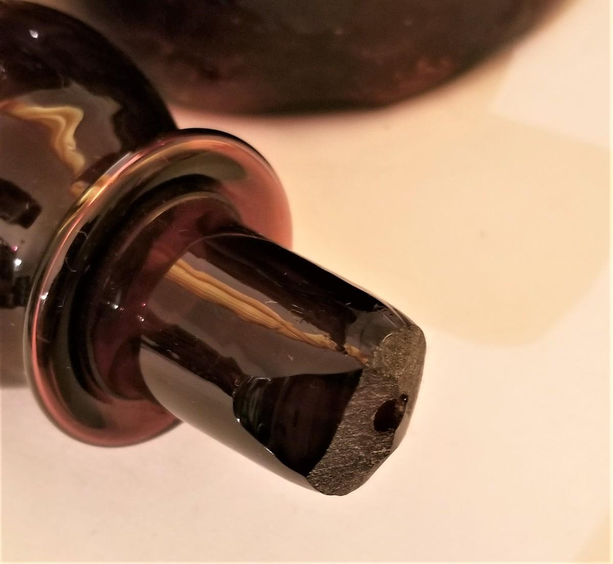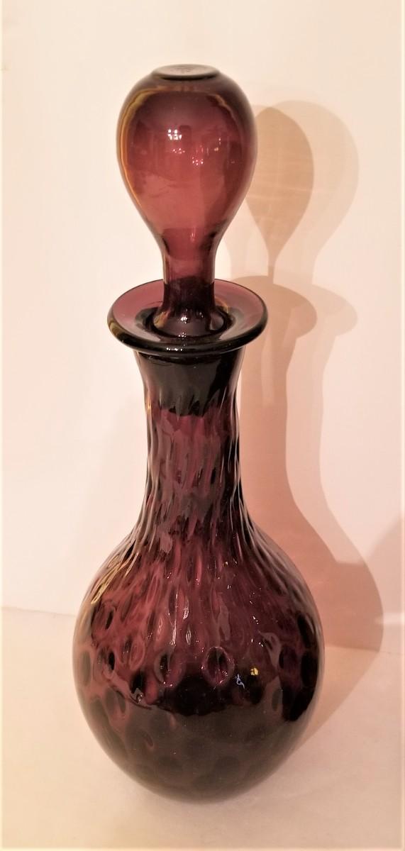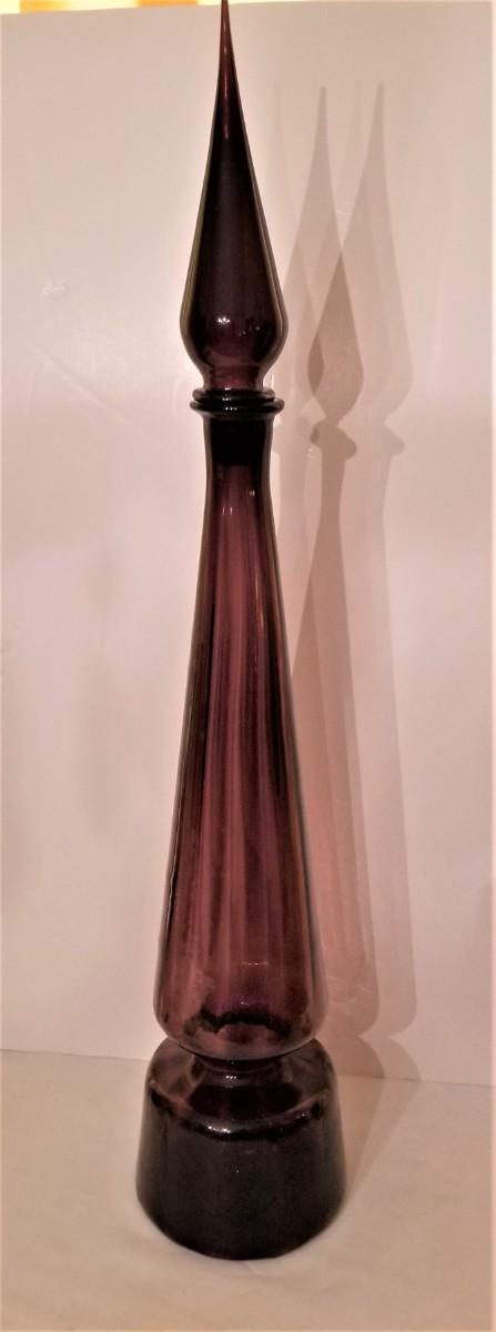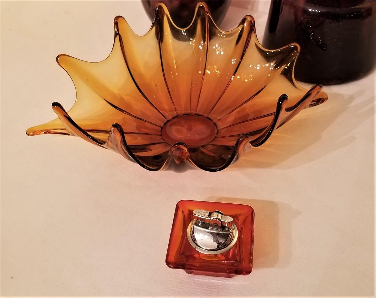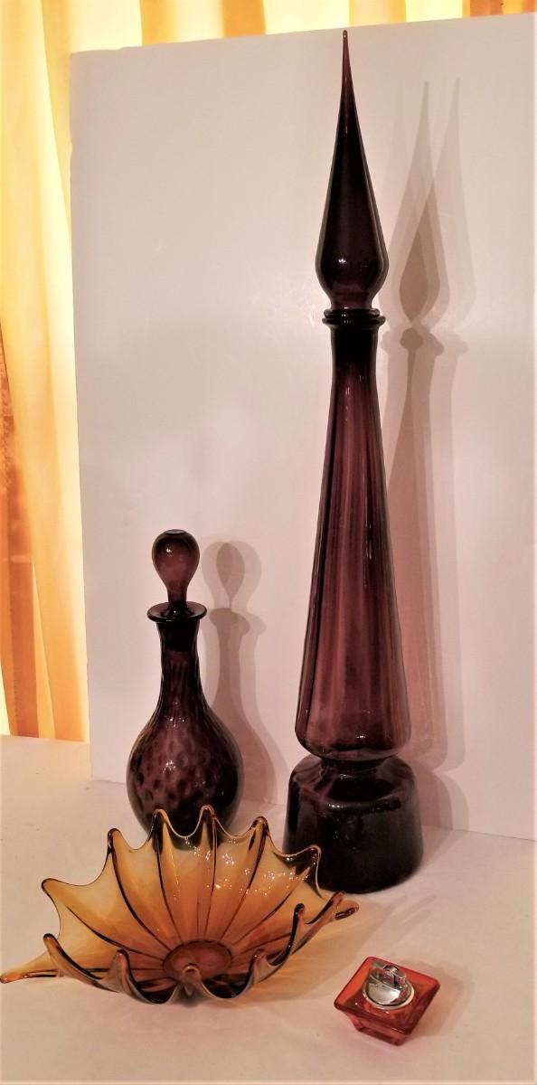 You get all you see here - 4 pieces of Mid Century Modern colored glassware, Large Decanter is 28.5" tall (note: stopper has an old "chigger" at the base - not visible when displayed); smaller decanter is 12.5" tall, scalloped dish is 12" across, lighter is 2.5" x 2.5".