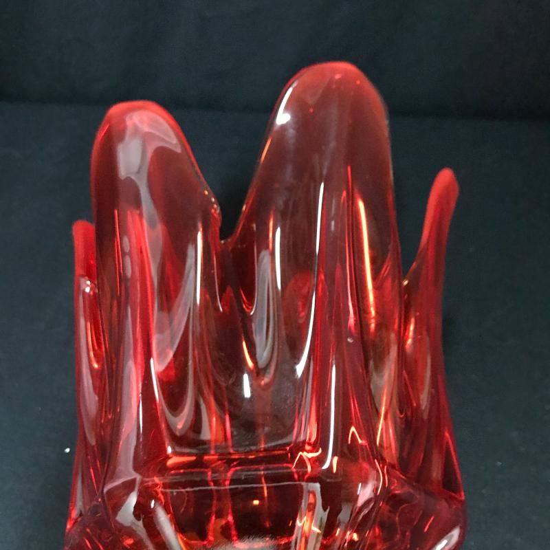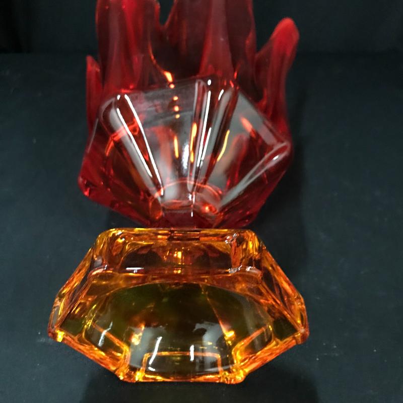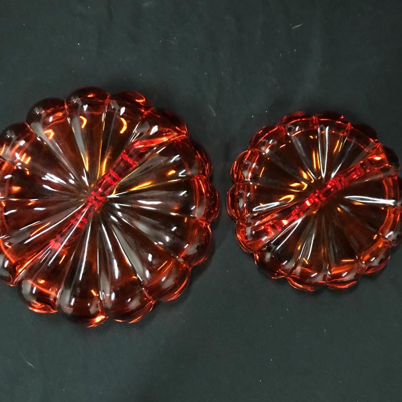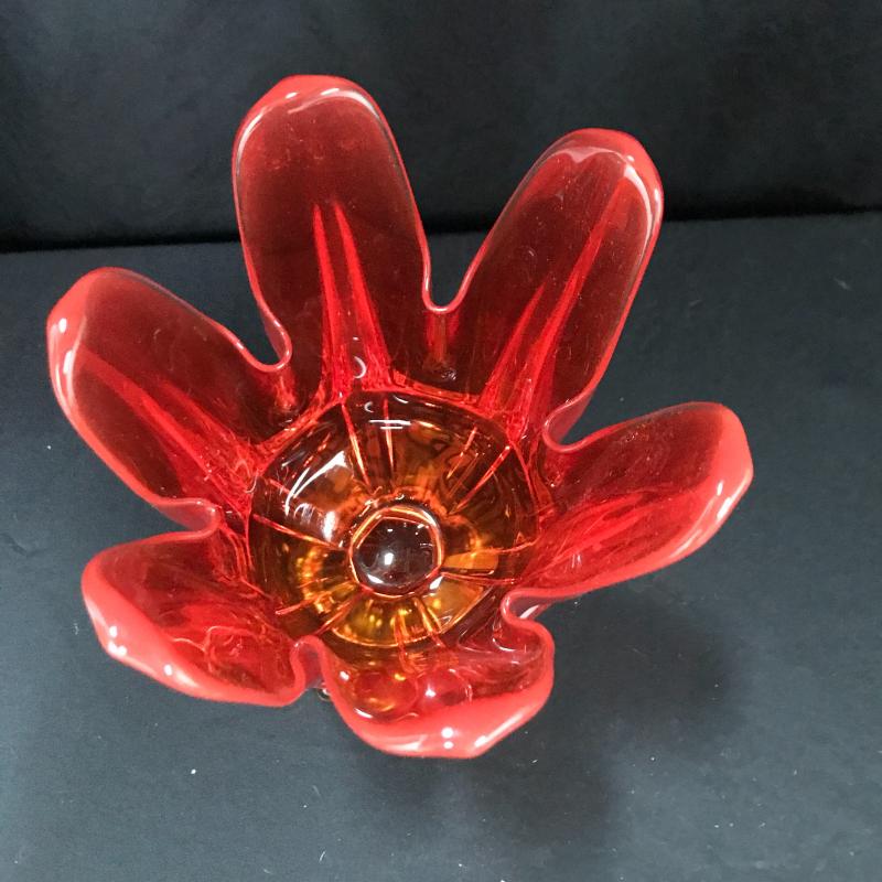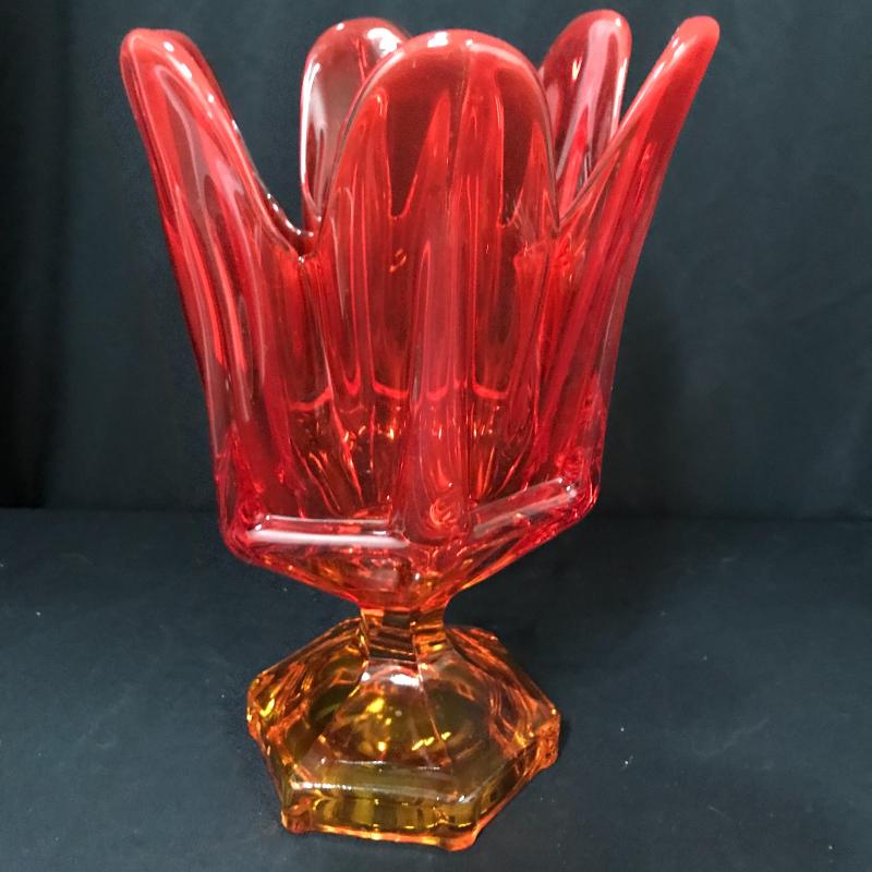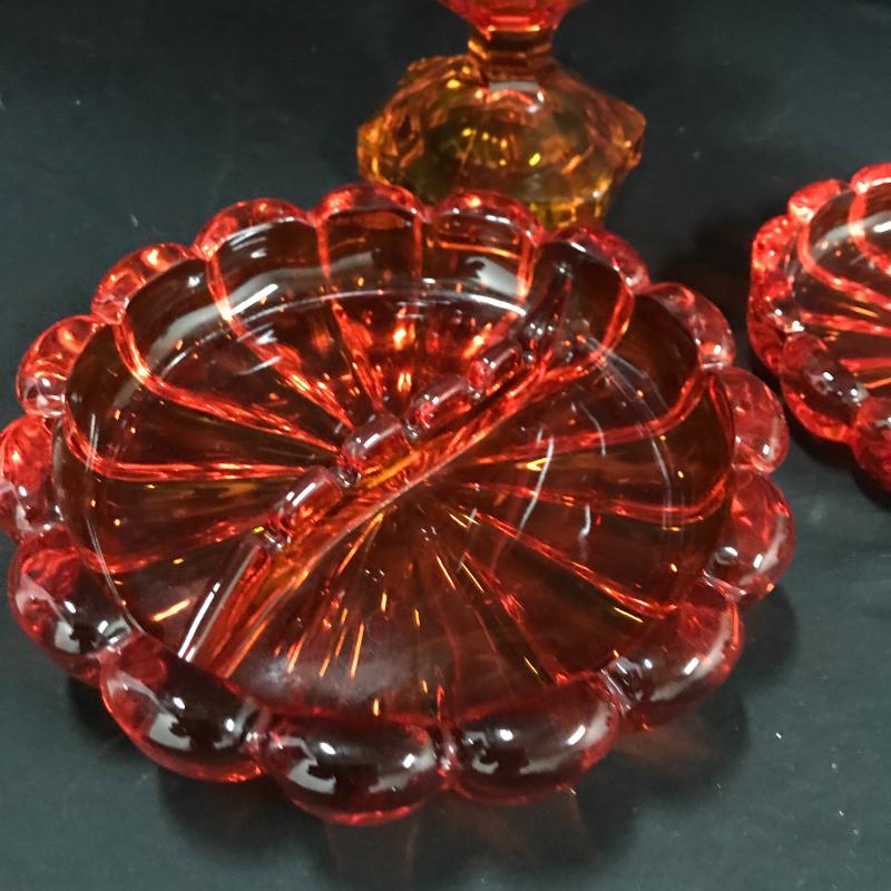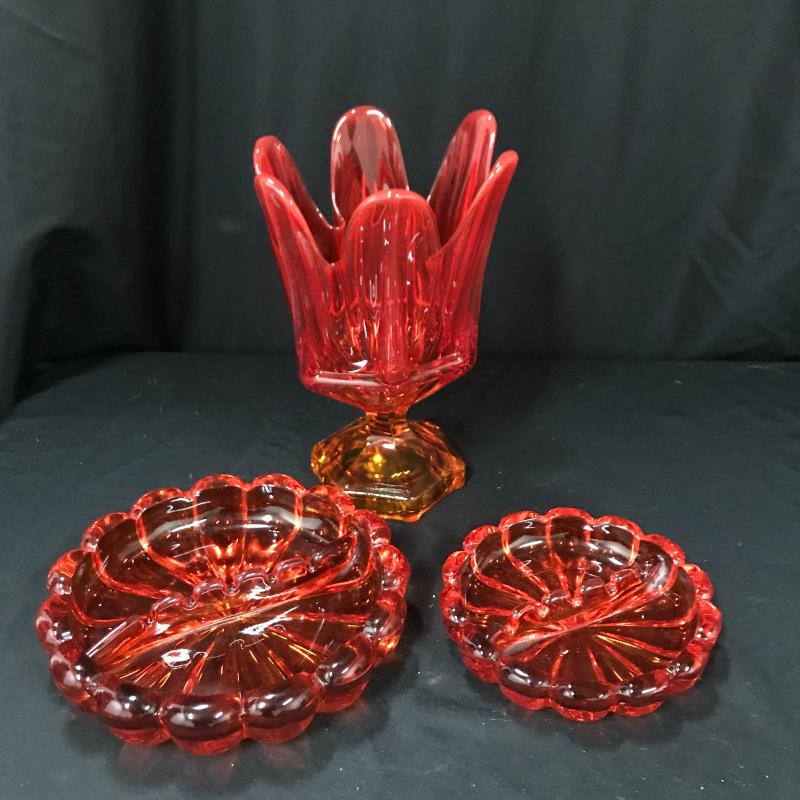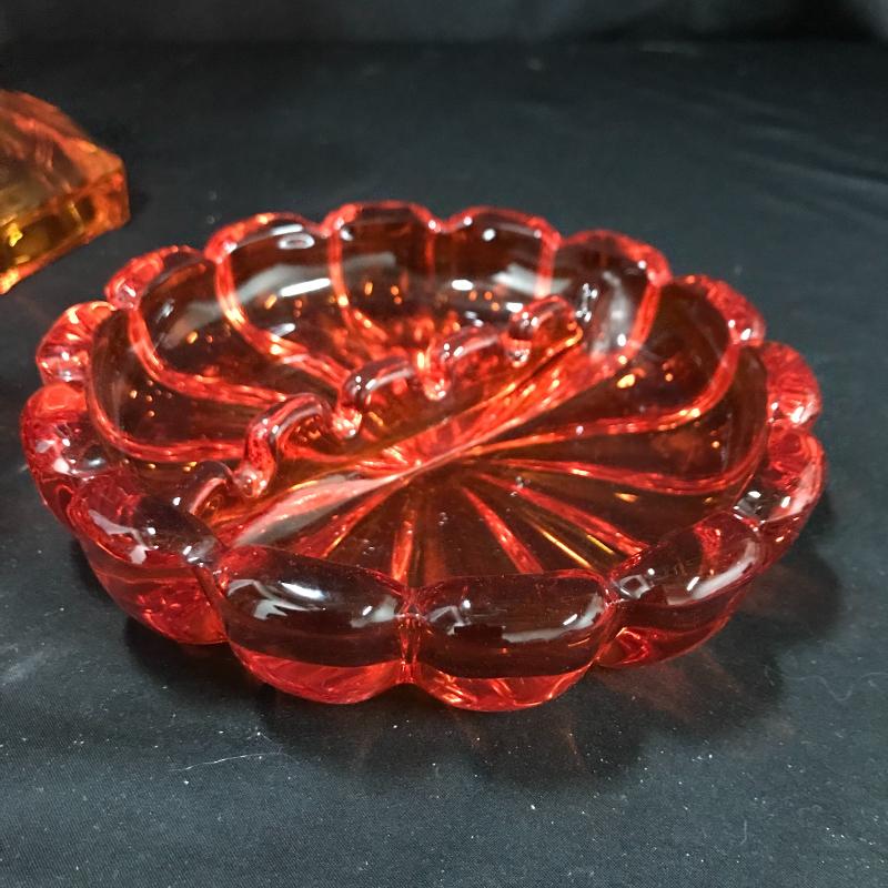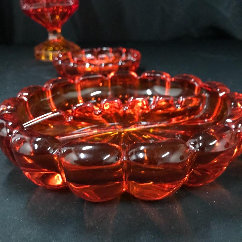 Heavy Orange glass has a rich color. Vase is 7”d x 10”h. Largest ashtray is 8.5”d. Smaller is 6.5” d. Shipping or local pick up in Asheville.