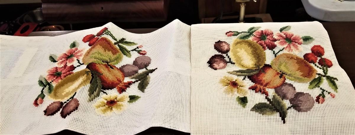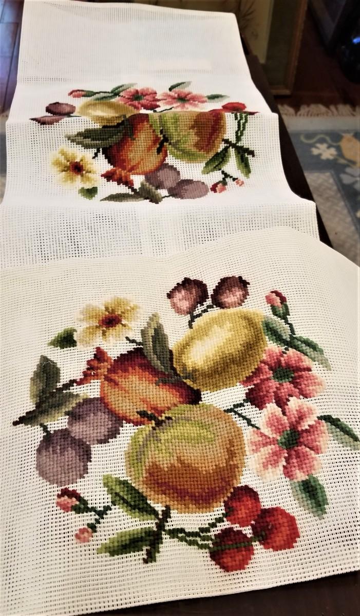 The design is complete on these canvases - just just need to fill in the background using any color you choose. Well executed. The canvases measure 23" x 23". Use to make chair seats, pillows, framed piece - your choice!