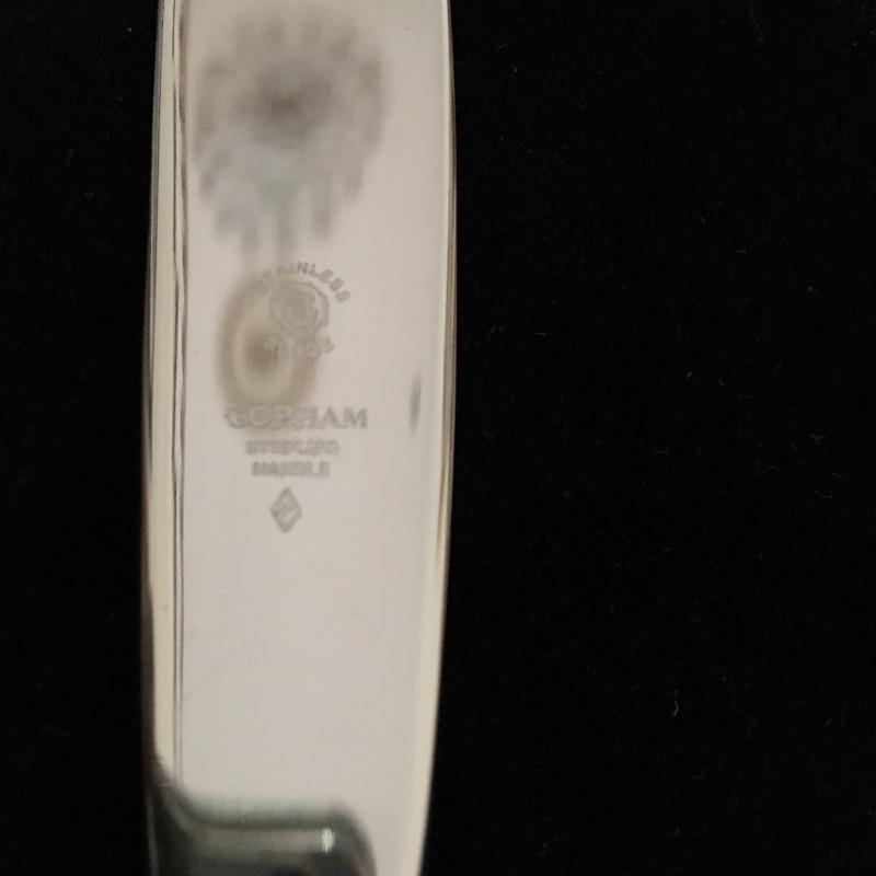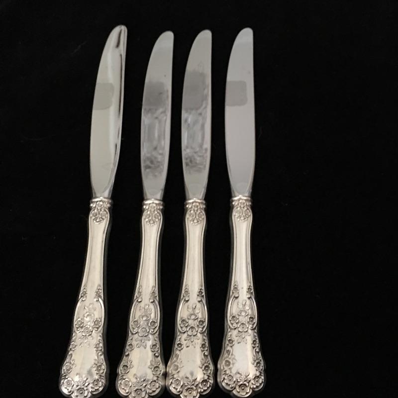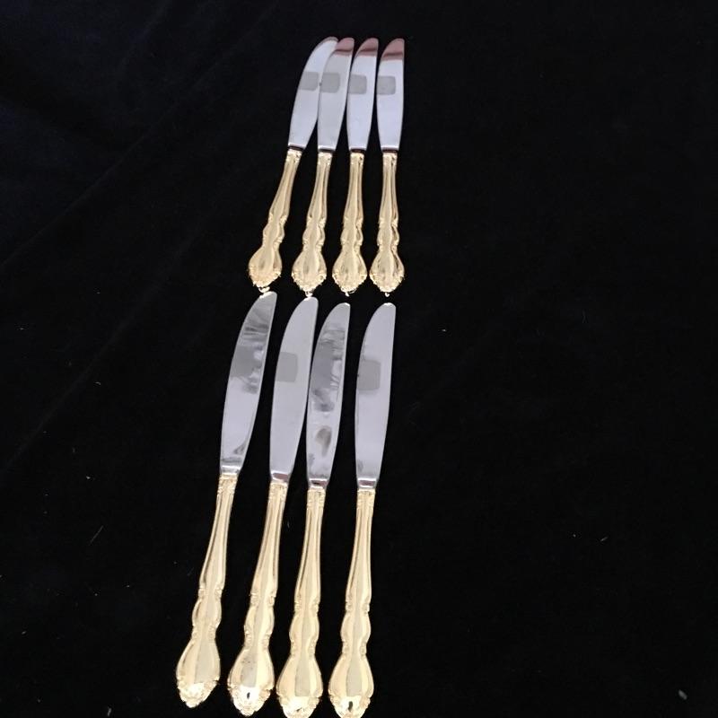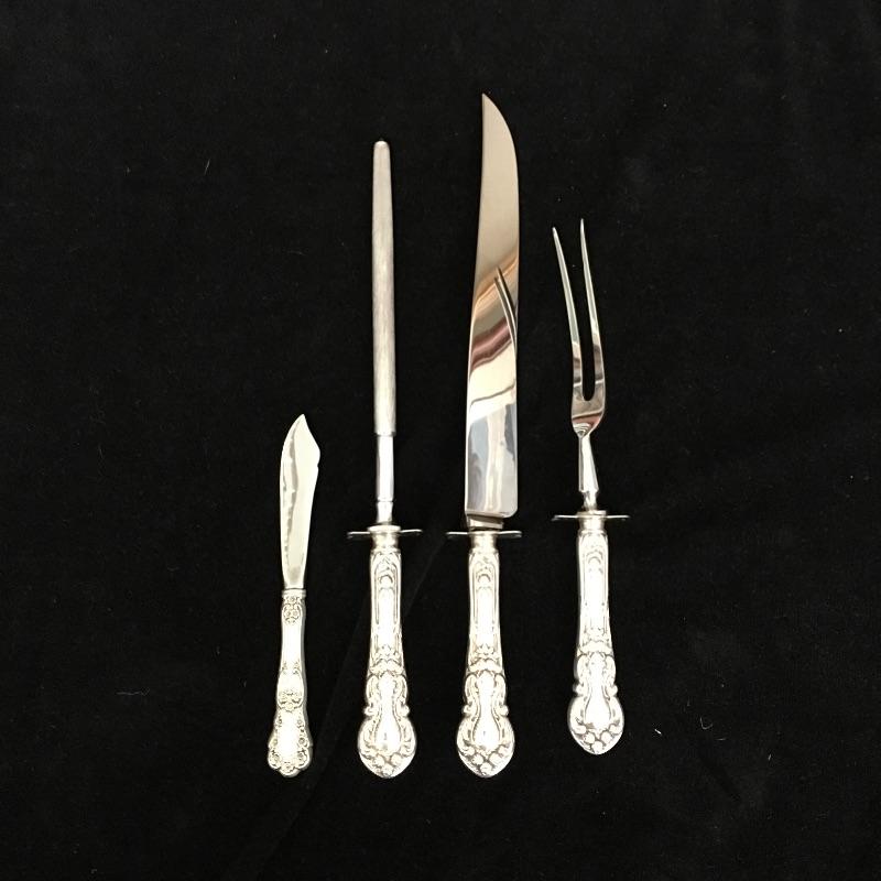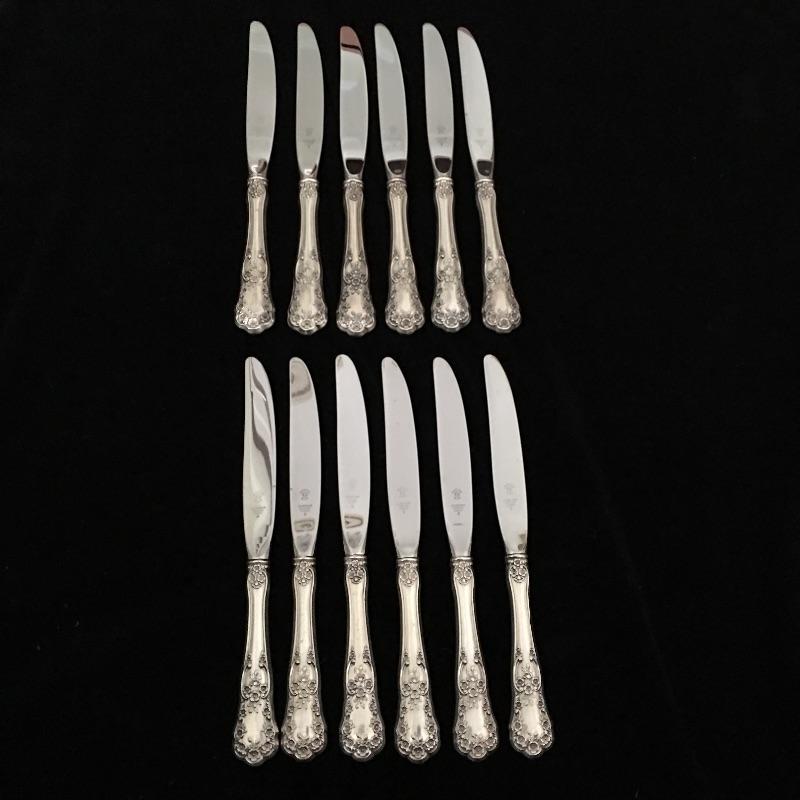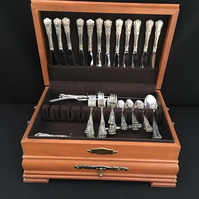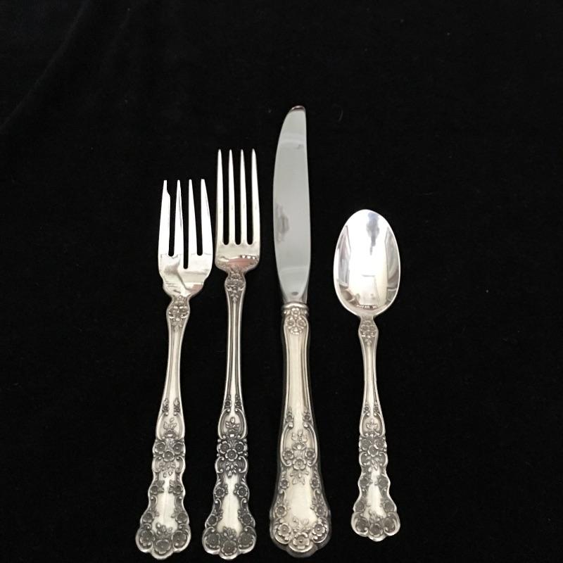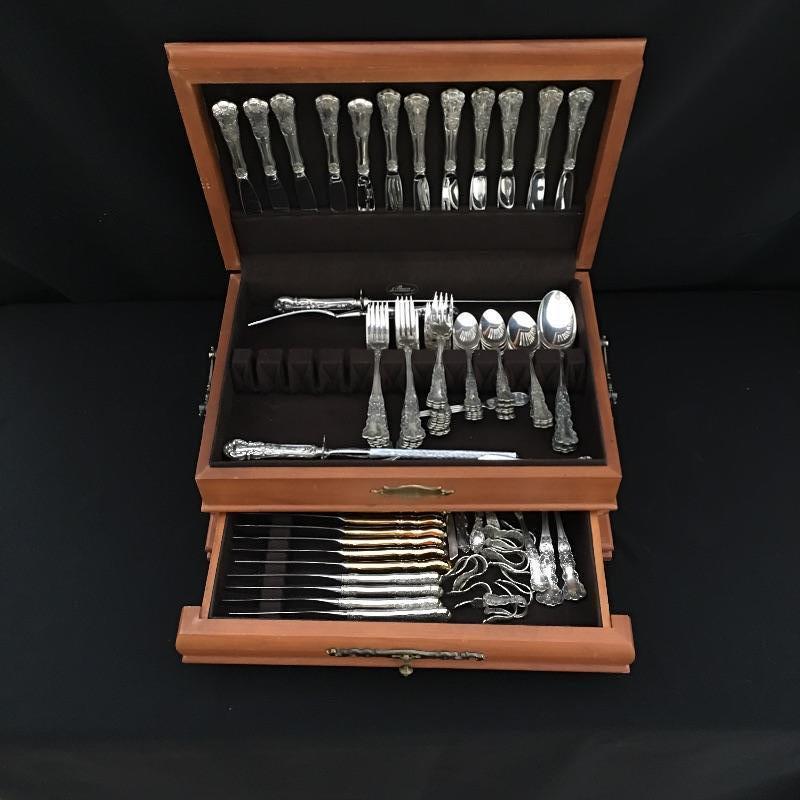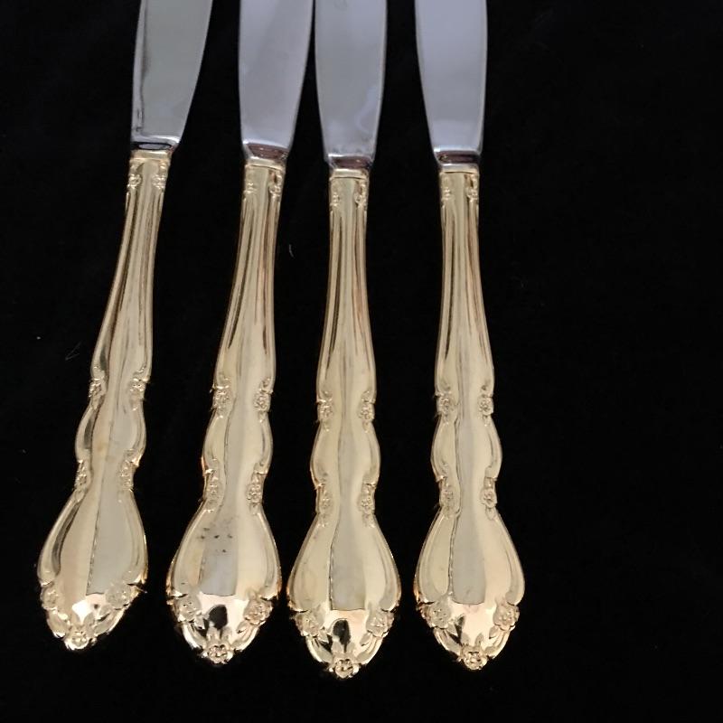 Classic sterling flatware by Gorham including its case and more flatware. This Gorham Sterling flatware includes four pieces each with twelve place settings and this lot also includes serving spoons, knife, fork and sharpening tool. Also included are eight gold colored knives with serving utensils - see pictures. Case measures 12” x 18” 8”. Starting bid reflects approximate melt value.