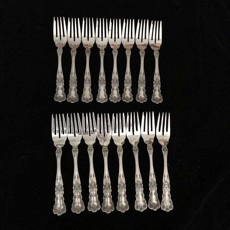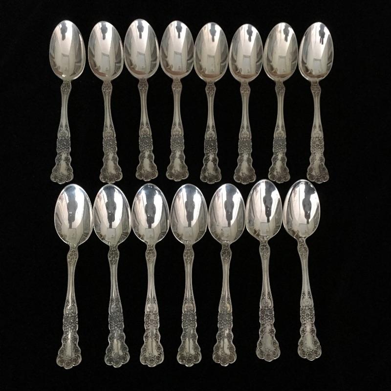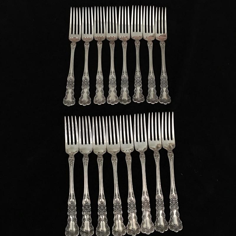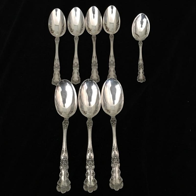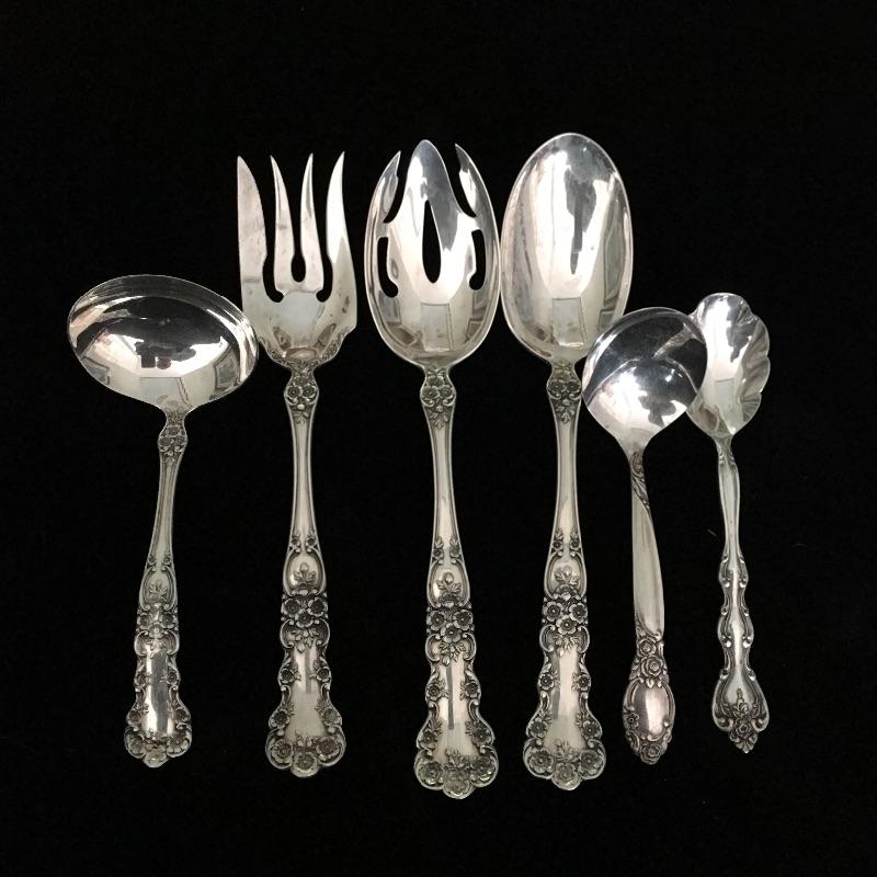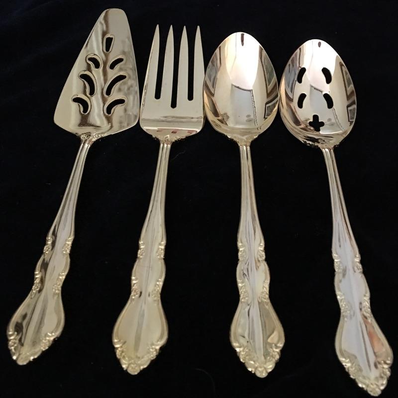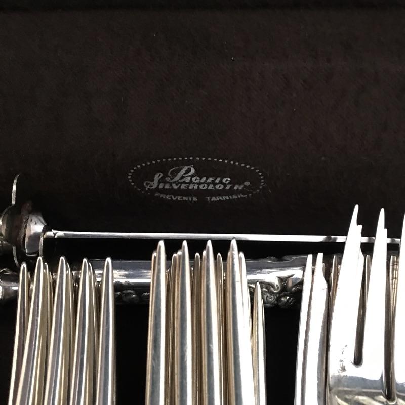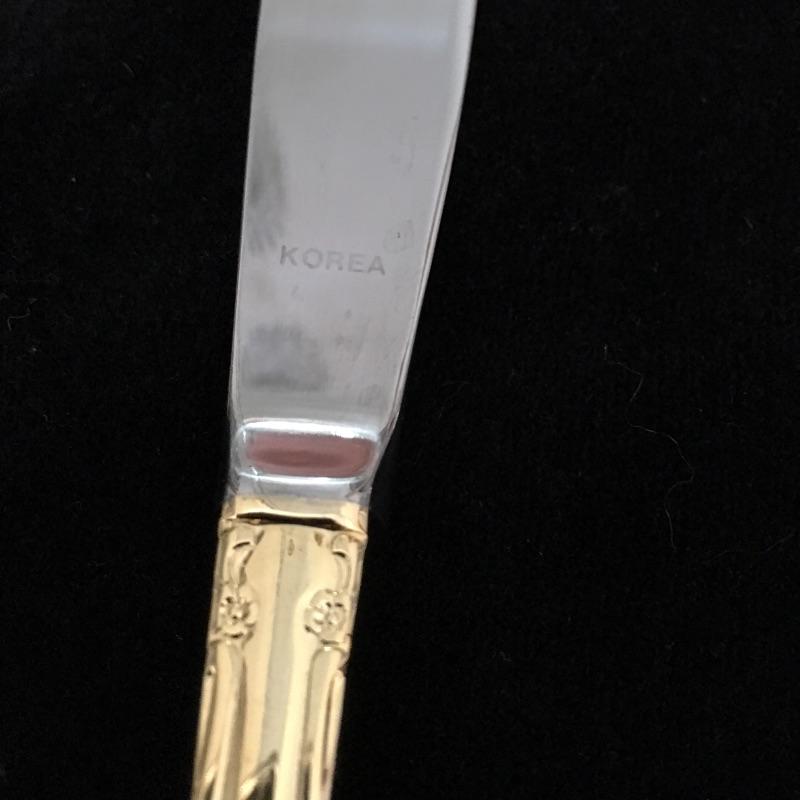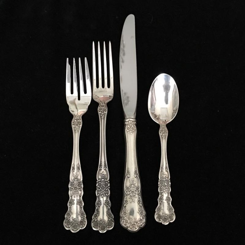 Classic sterling flatware by Gorham including its case and more flatware. This Gorham Sterling flatware includes four pieces each with twelve place settings and this lot also includes serving spoons, knife, fork and sharpening tool. Also included are eight gold colored knives with serving utensils - see pictures. Case measures 12” x 18” 8”. Starting bid reflects approximate melt value.