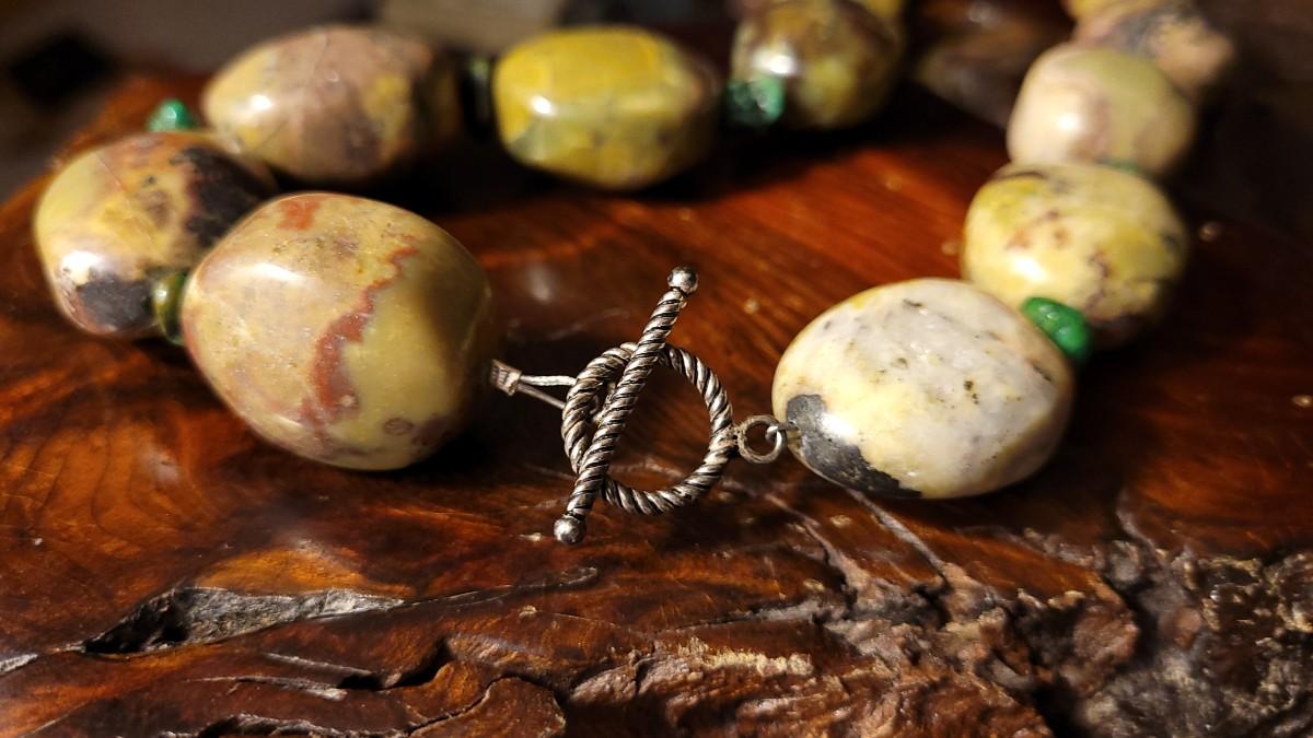 This lot features a Vintage Handmade Chunky Stone Necklace with a gorgeous selection of natural stones in a breathtaking variety of colors. The beads are each about 25mm wide. The drop is about 8.5".