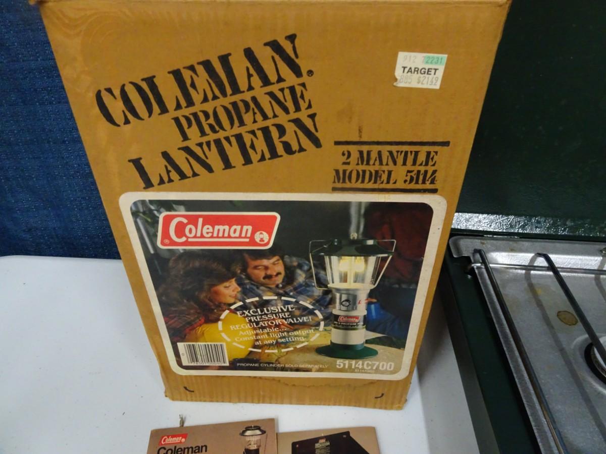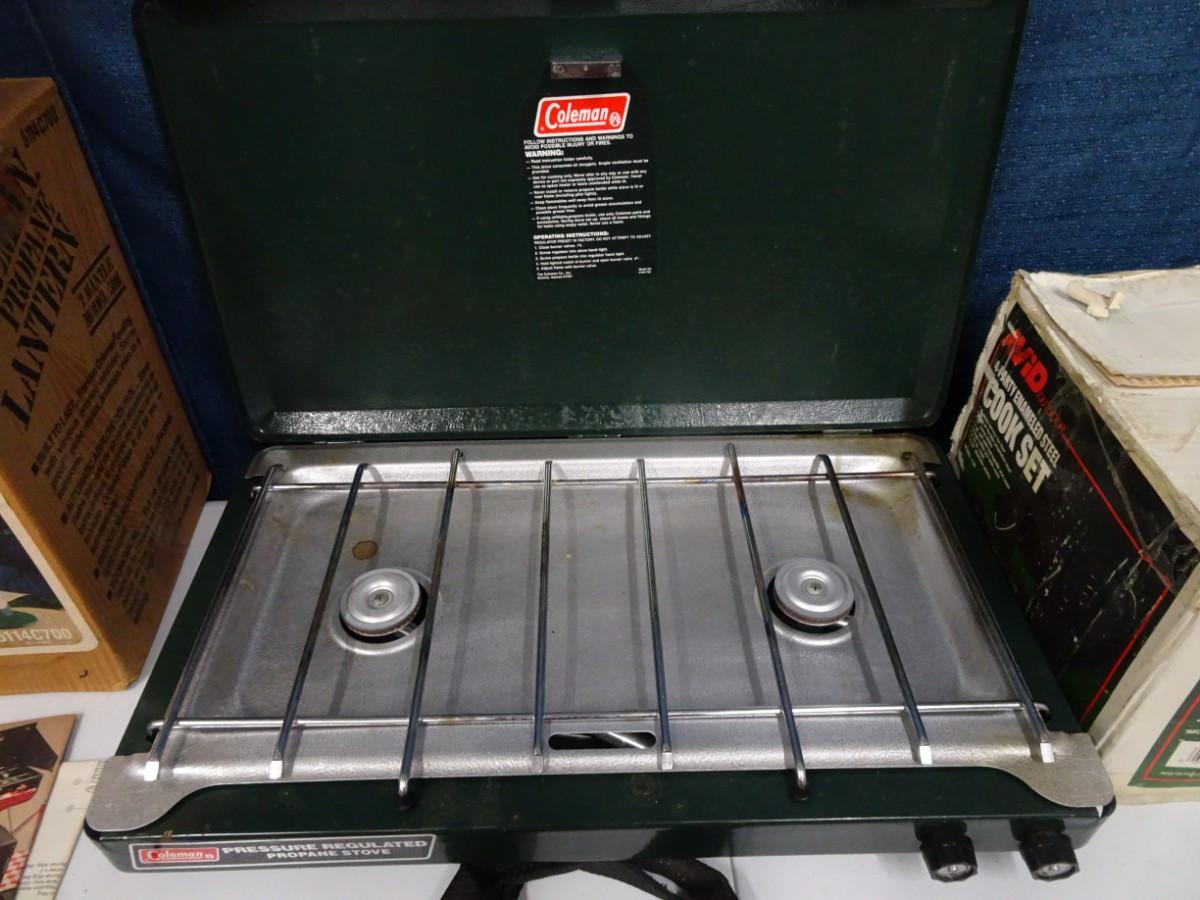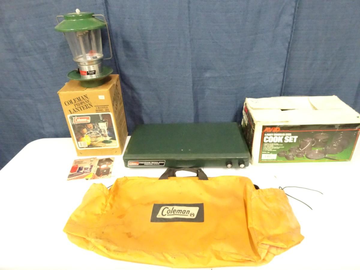 LOT 246. COLEMAN STOVE, CAMPING COOK SET AND COLEMAN LANTERN
