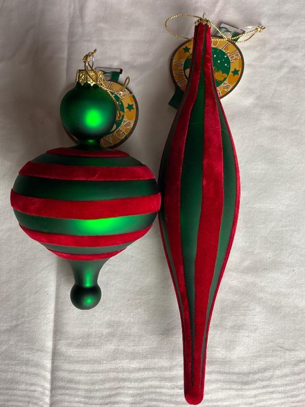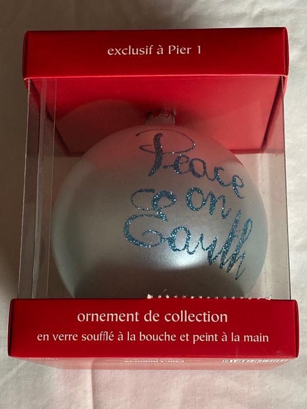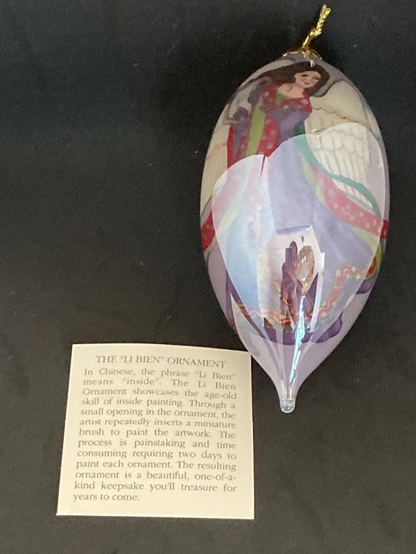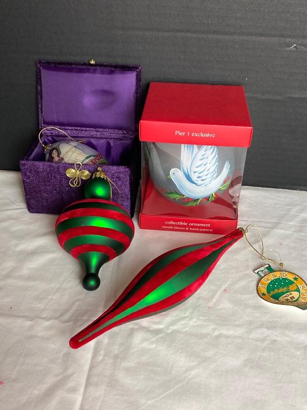 Pier 1 Li Bien Angel Drop ornament. Mouth blown, hand painted “Peace on Earth”. Two Glass and Velvet ornaments by Yule Tidings and a blown glass Heart shaped ornament