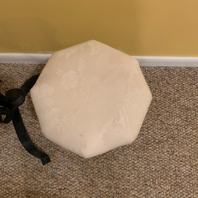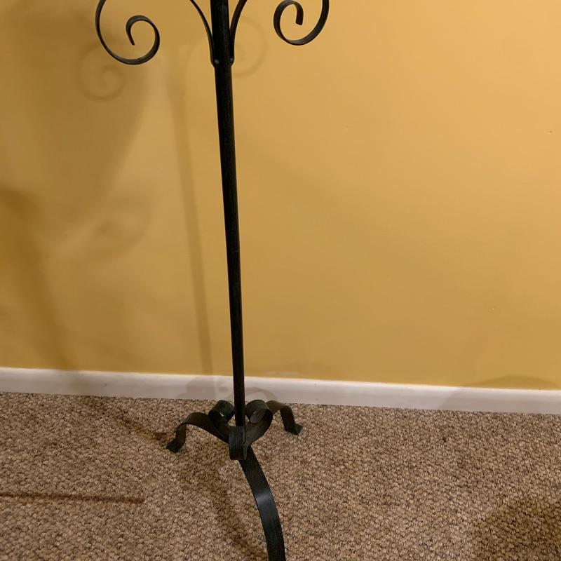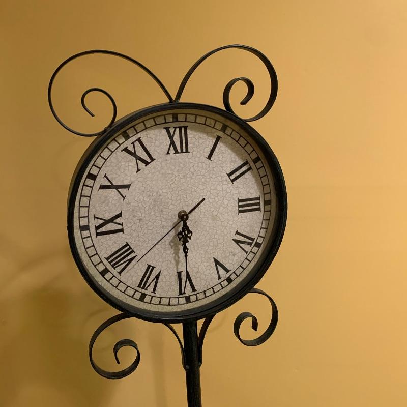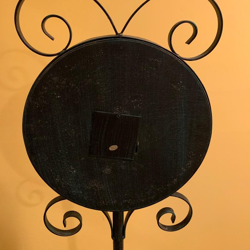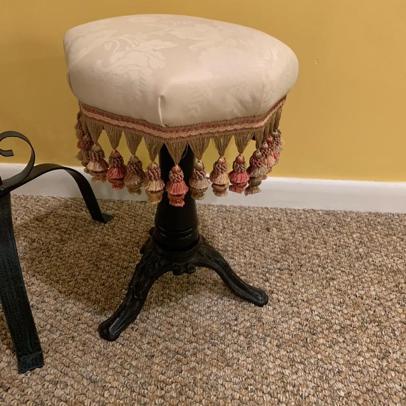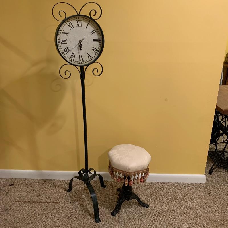 This cute collection consists of a swivel cast iron stool with white fabric seat and colorful tassels. A floor clock that is battery operated (not tested) accompanies it. Regrettably the clock heads are loose, so it may be a lost cause. Maybe fix it or maybe just use it as cute decor. Clock stands 59.5” and stool is 18” tall with a 13” d. Seat. Local pick up only.