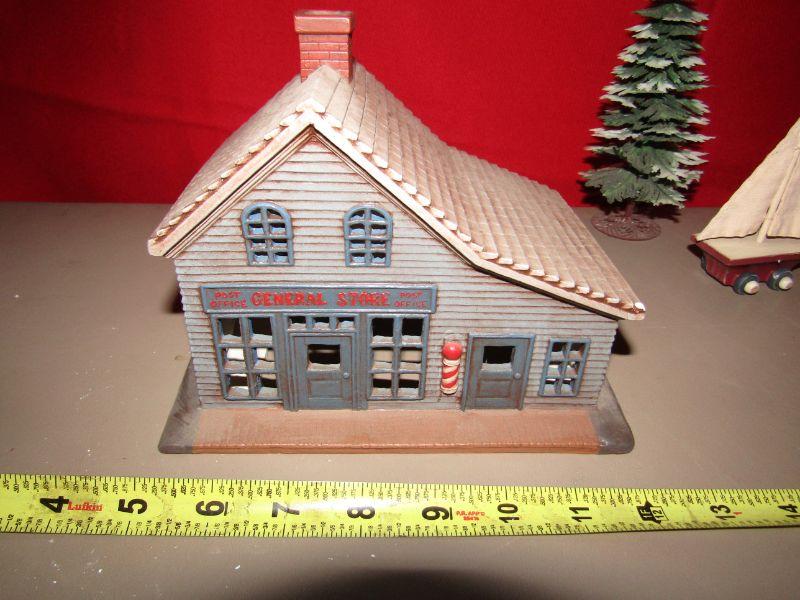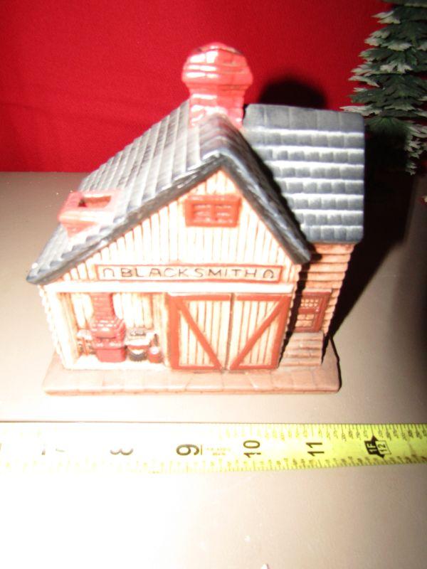 GENERAL STORE VILLAGE AND BLACKSMITH VILLAGE ALONG WITH THE ACCESSORIES AND A PACKAGE OF BRASS COACH LAMPS.