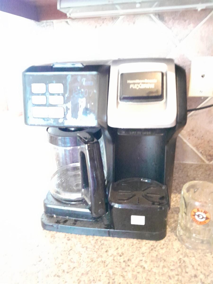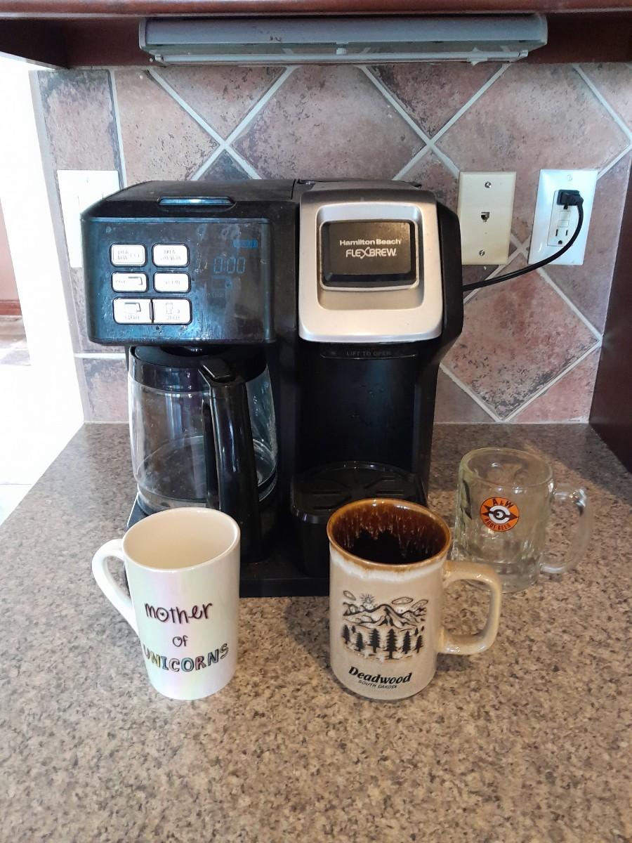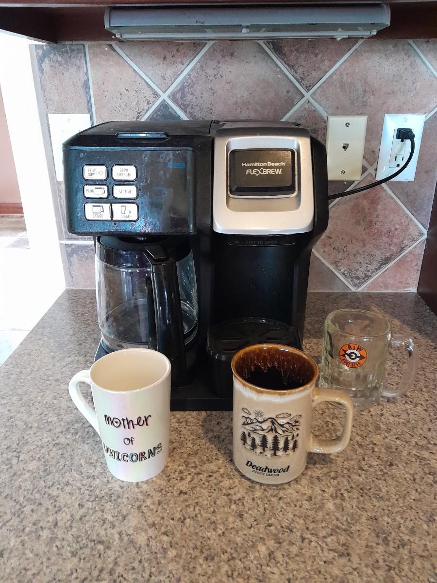 HAMILTON BEACH FLEX BREW COFFEE POT (has decal stickers all over it) WITH SEVERAL MUGS
