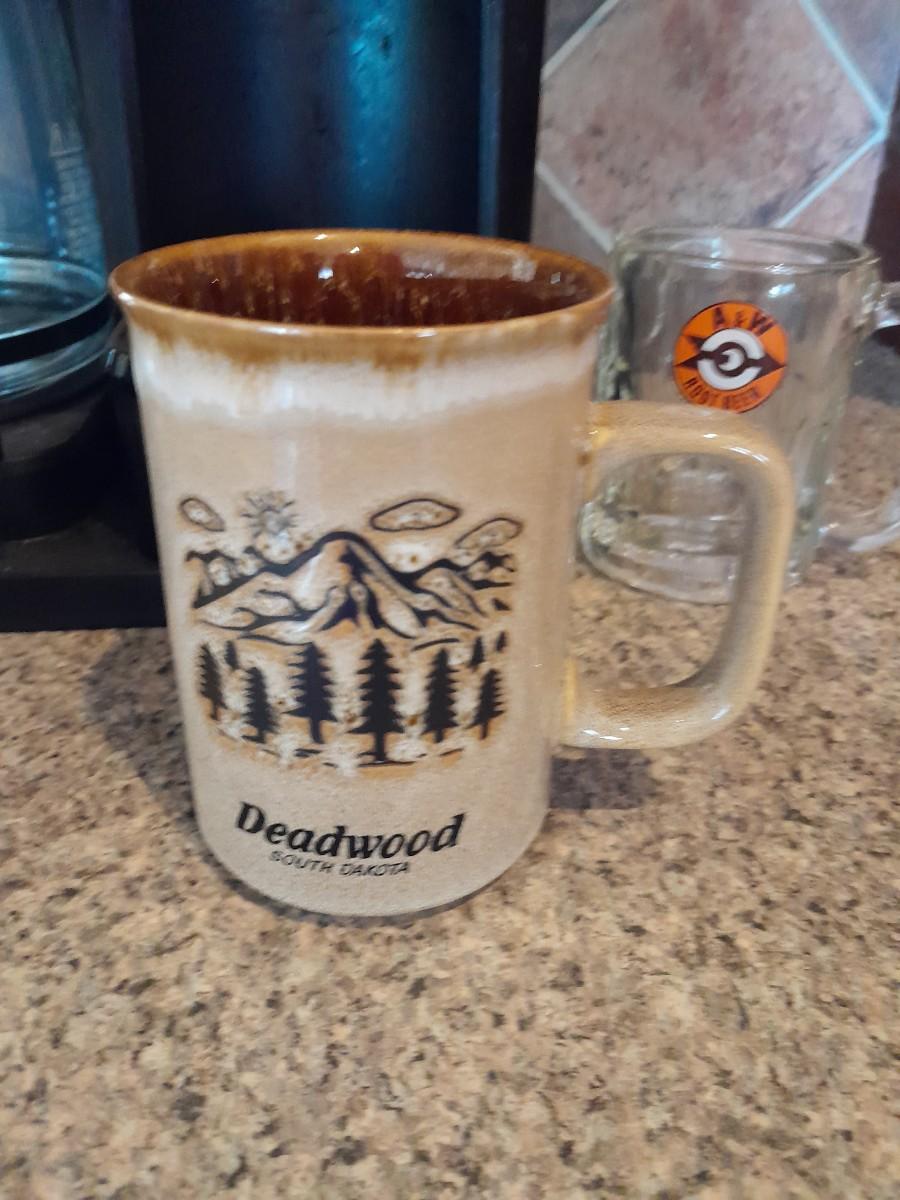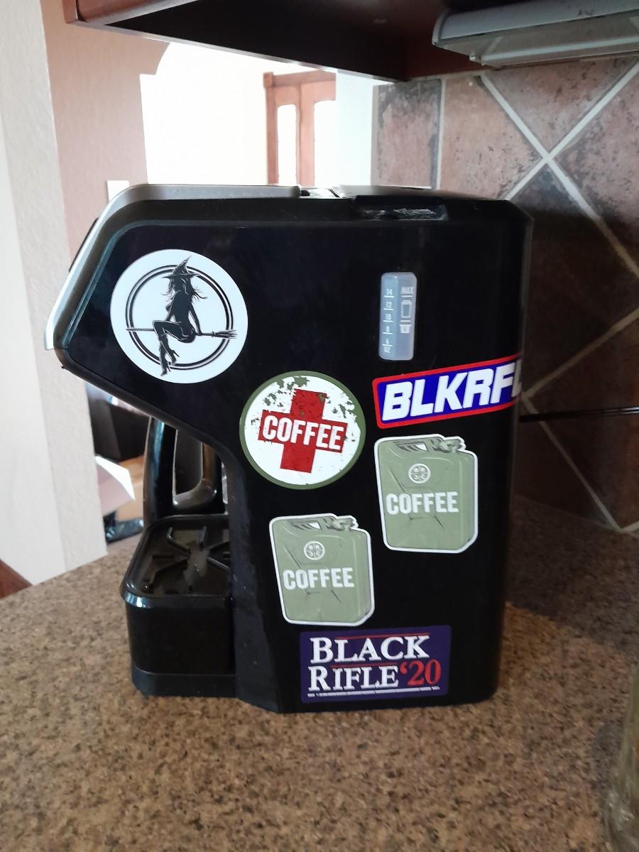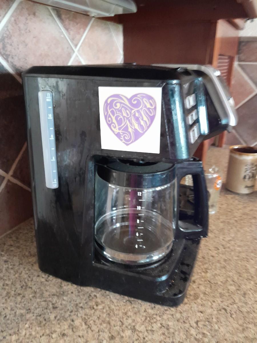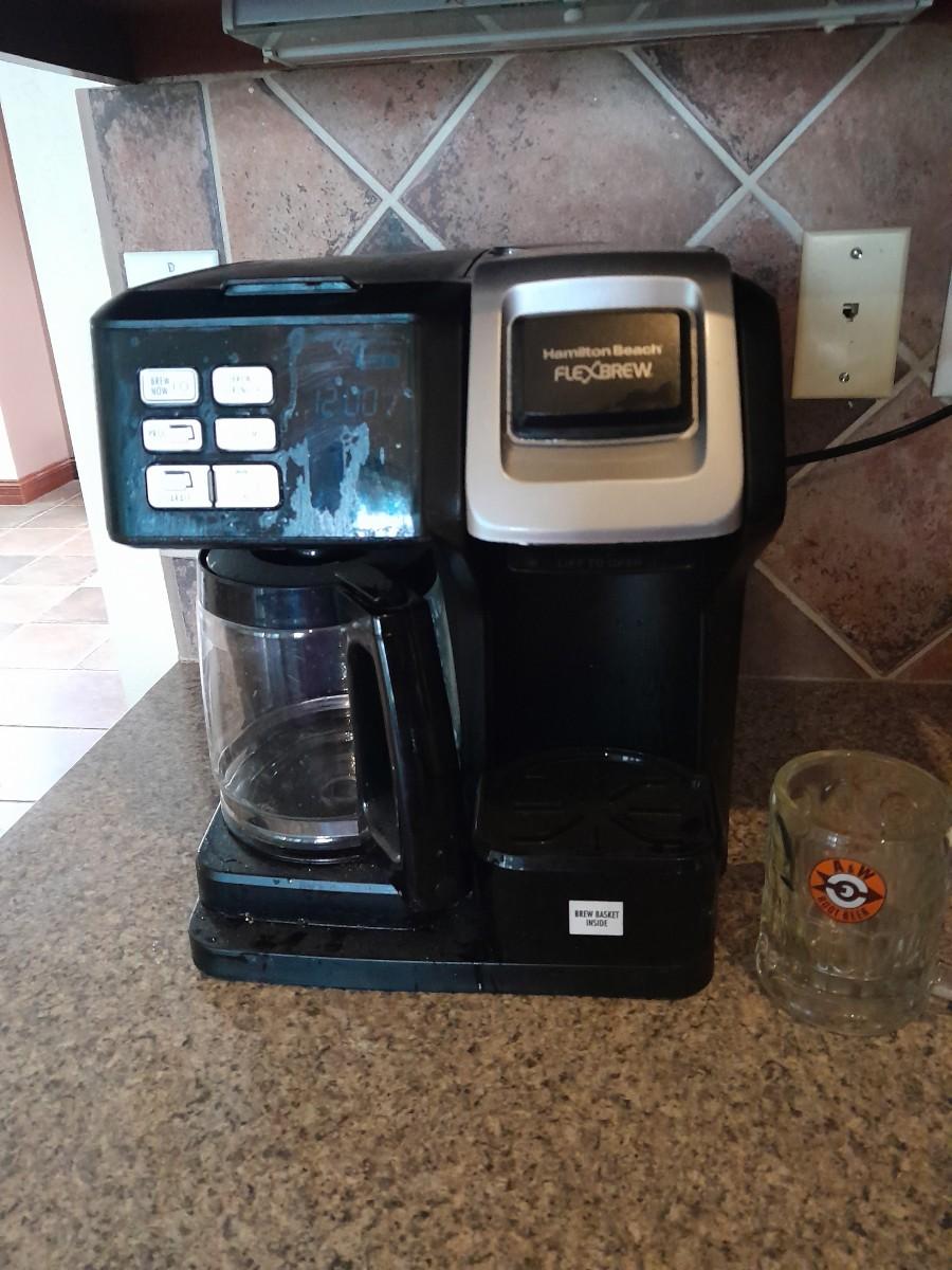 HAMILTON BEACH FLEX BREW COFFEE POT (has decal stickers all over it) WITH SEVERAL MUGS