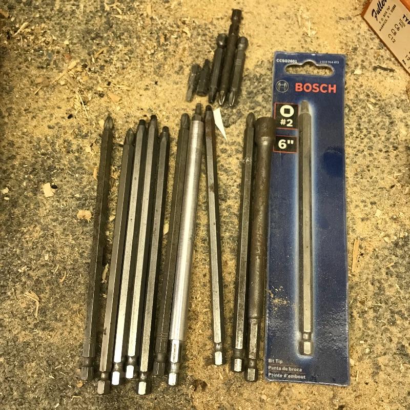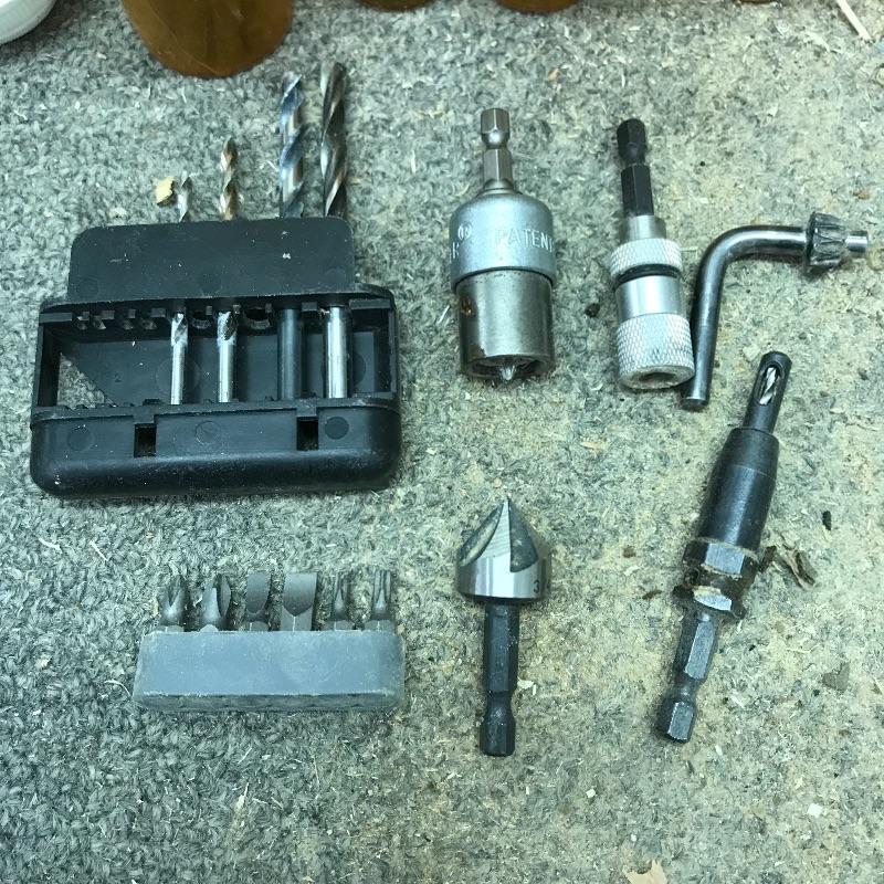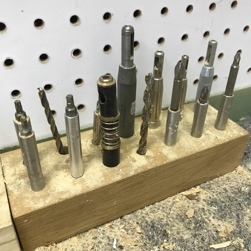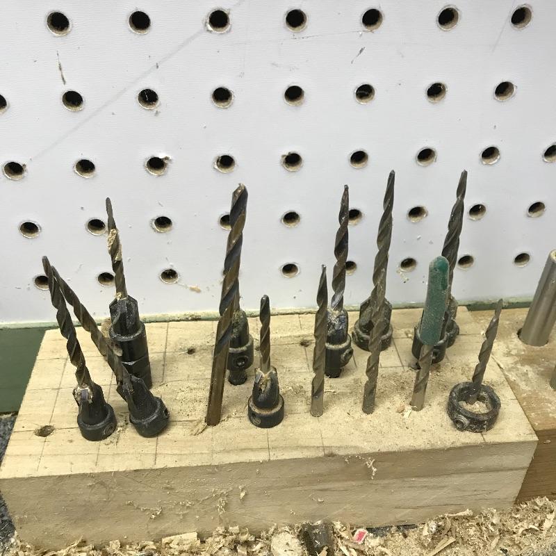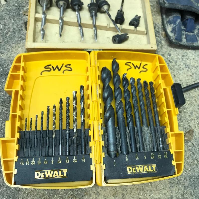 All sizes and various designed drill bits. Lot includes Dewalt and Drill Master sets. Wood block holders near the wall measure 7” x 3” x 2”. No shipping.