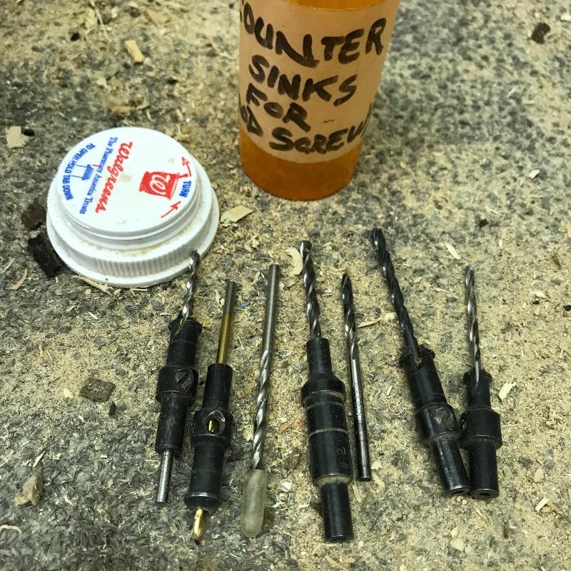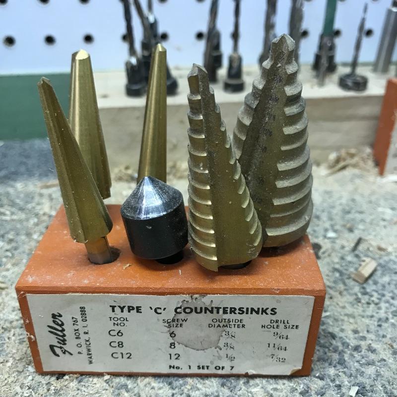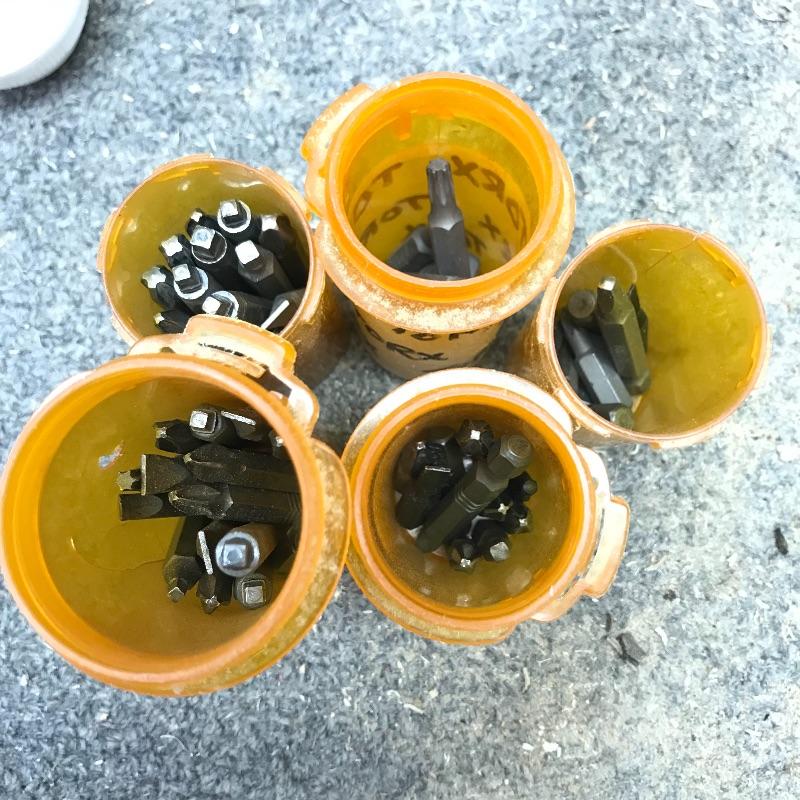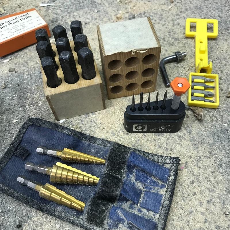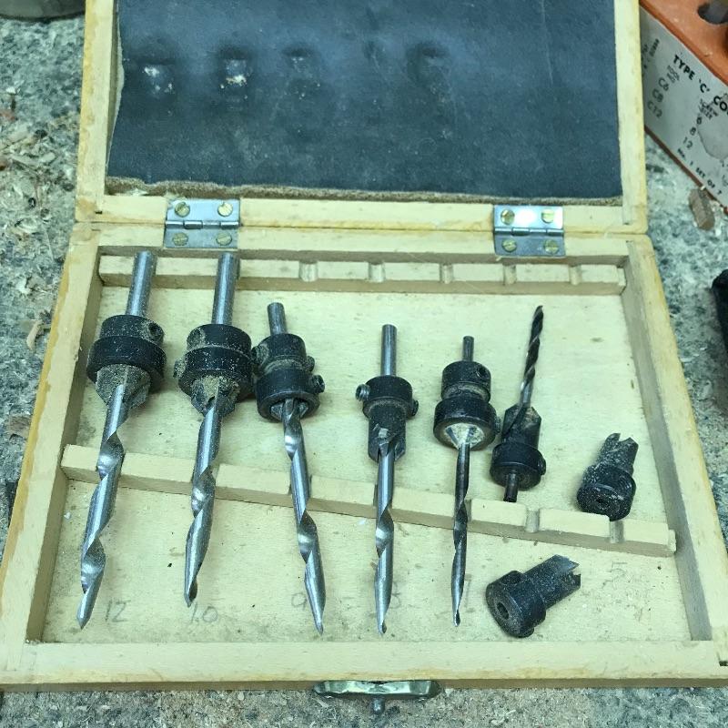 All sizes and various designed drill bits. Lot includes Dewalt and Drill Master sets. Wood block holders near the wall measure 7” x 3” x 2”. No shipping.