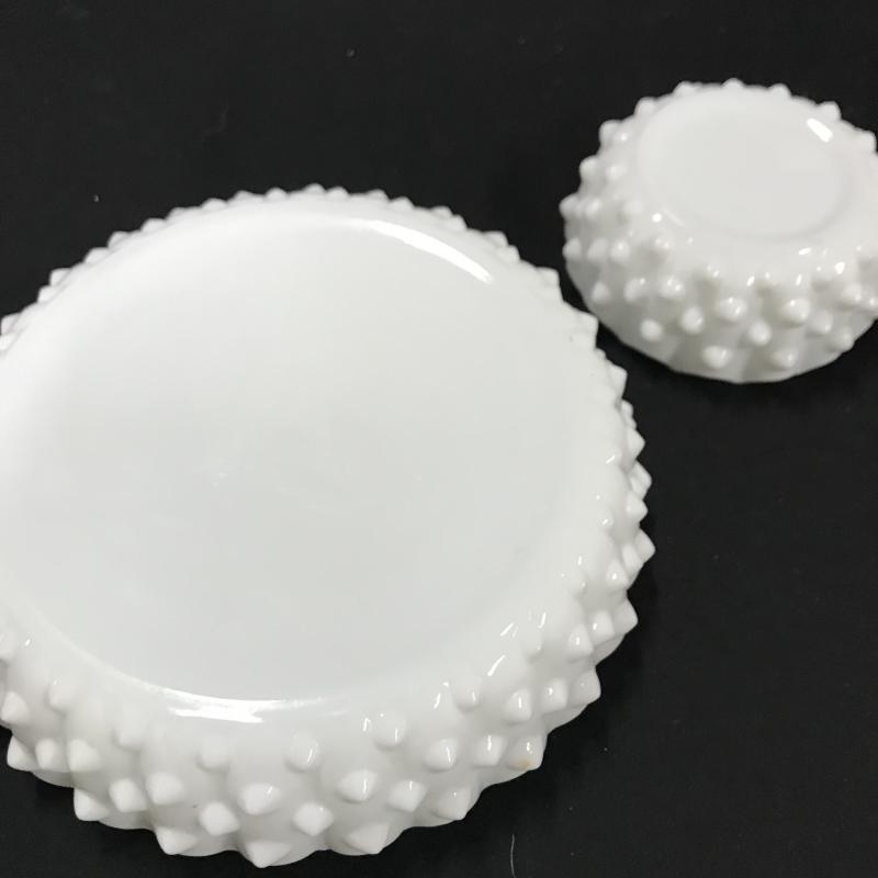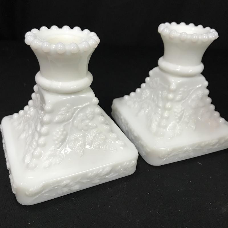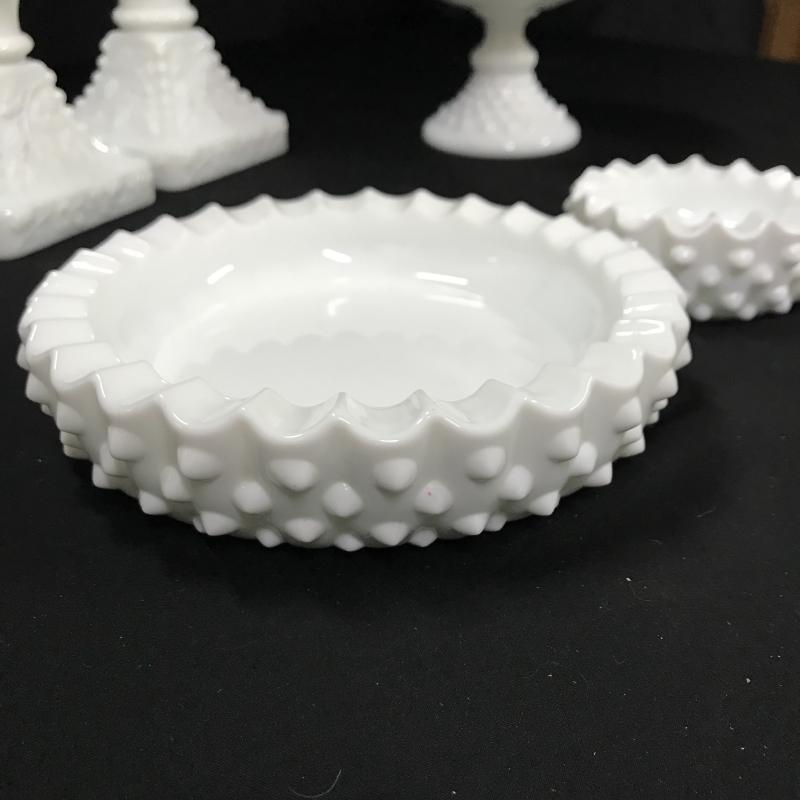 Variety of milk glass pieces. Covered dish is 6.5”d x 8.5”h. Largest dish is 6.5” d. Candle stick holders are 4”square by 4.5”h Shipping or local pick up in Asheville