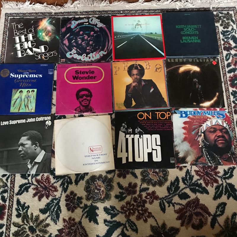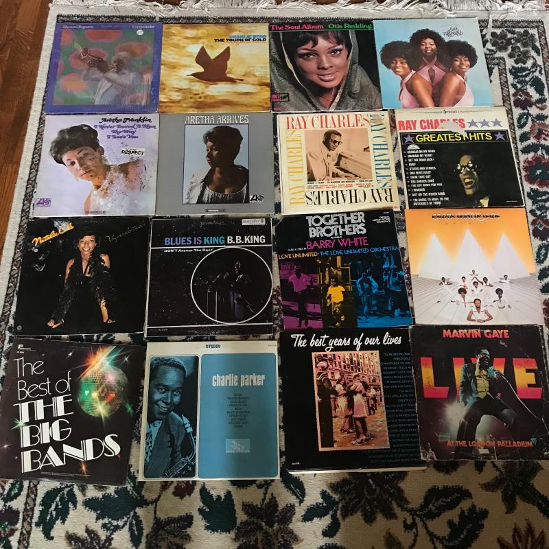 Close to 50 used albums by artists such as Ray Charles, Aretha Franklin, B.B. King, Marvin Gay, Natalie Cole, Barry White, Supremes, Stevie Wonder, John Coltrane and more. Album covers and viynles are well worn but useable.