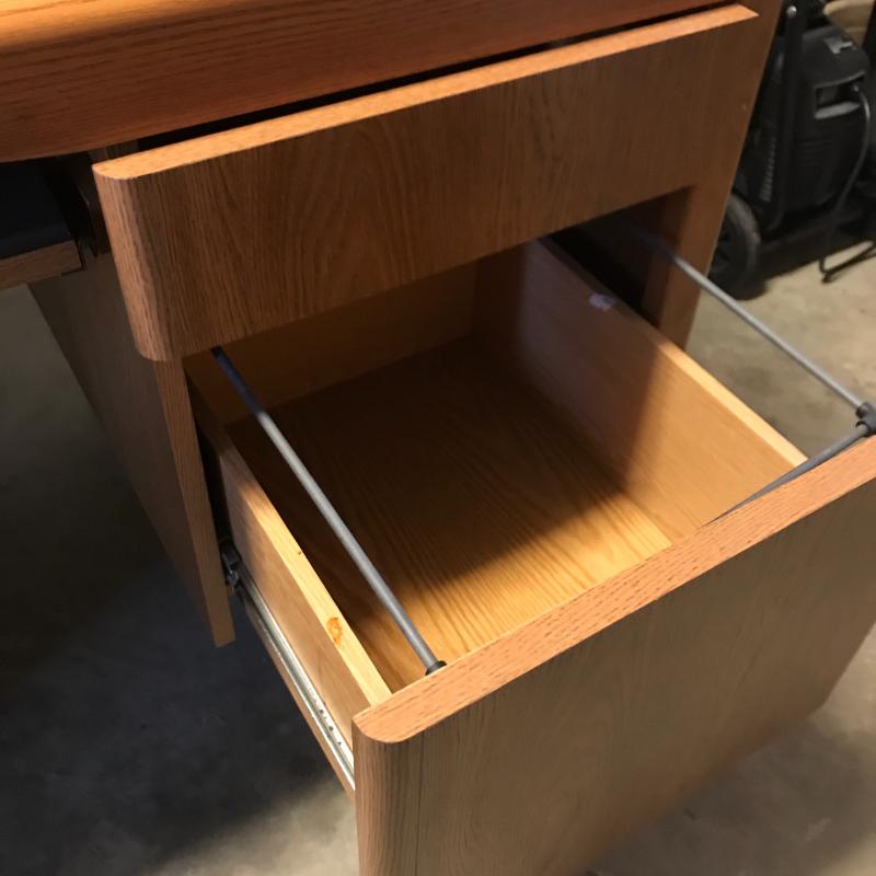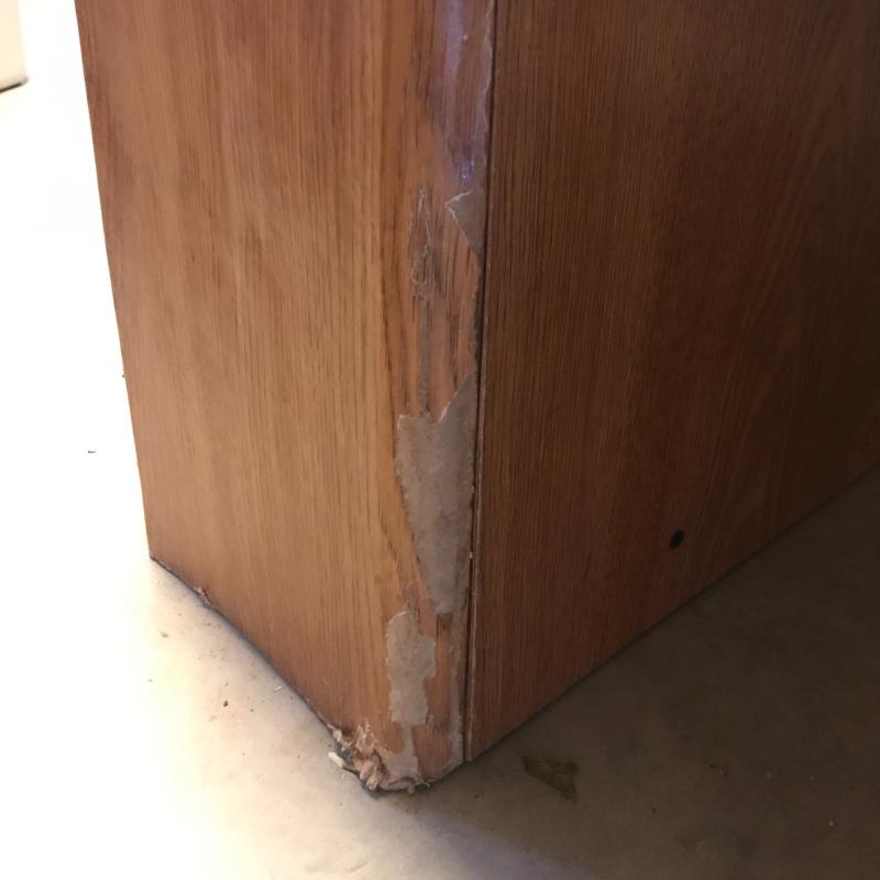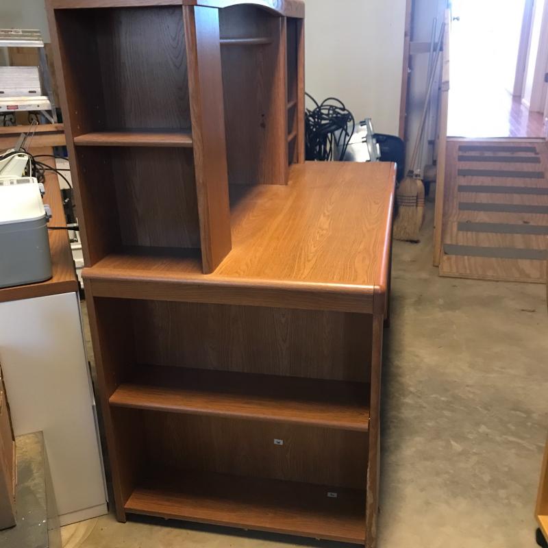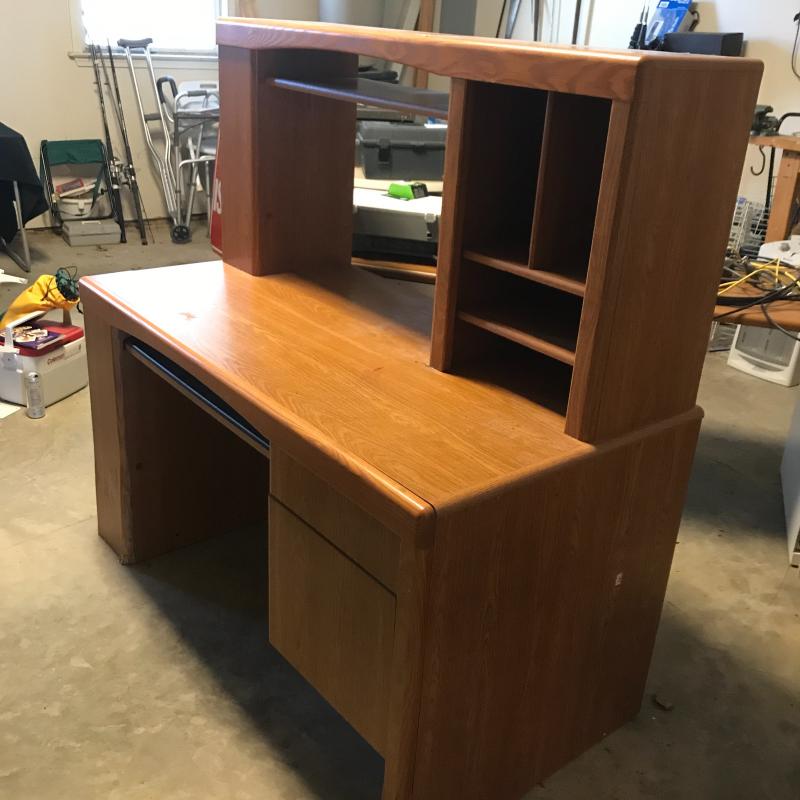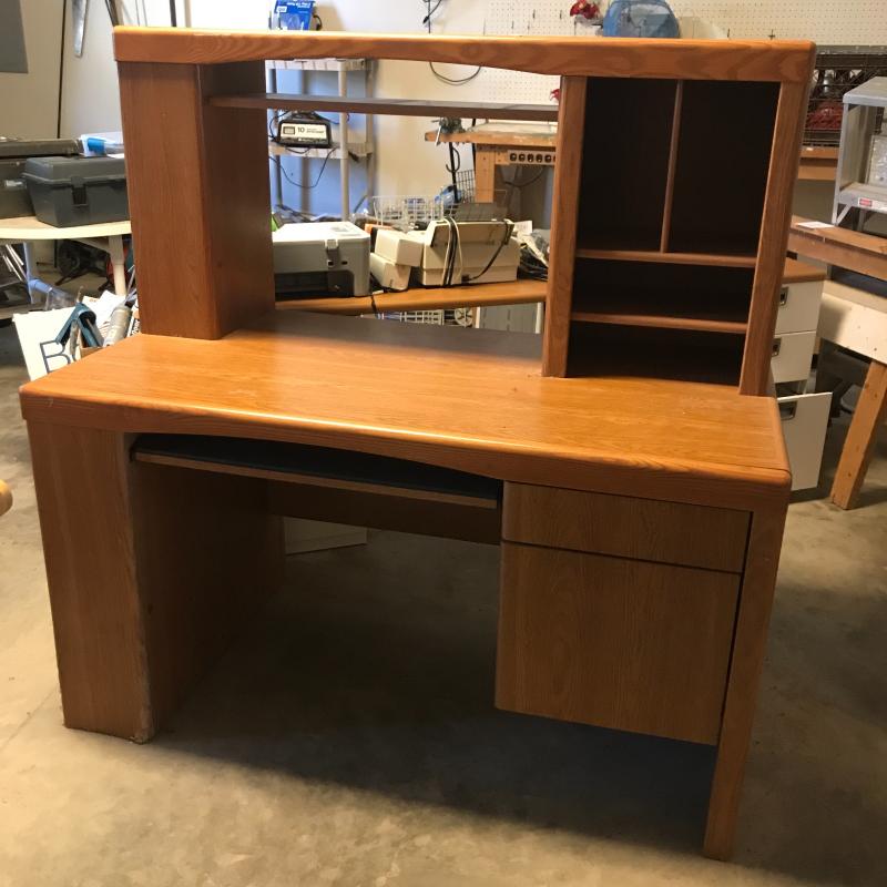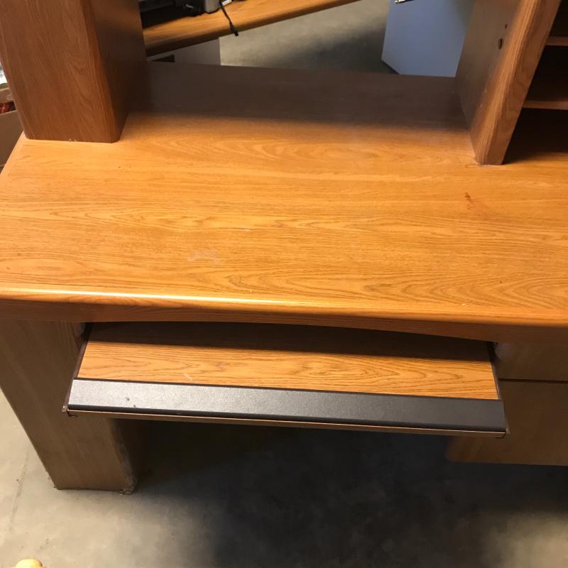 Nice sized desk with built-in storage and keyboard tray. Some shelves adjustable. Has some damage to wood on inside bottom. See pics. Manufactured wood. Measures 53”l x 27.5”w x 54”h. No shipping. Local pick up in Asheville, NC only.