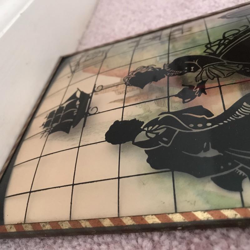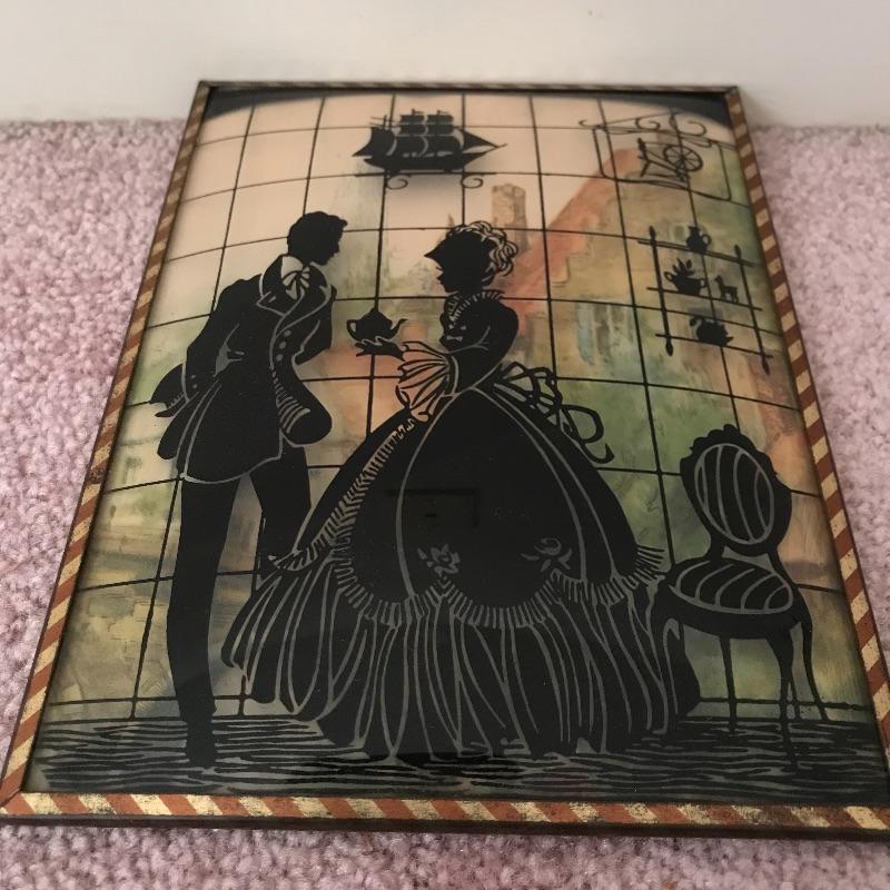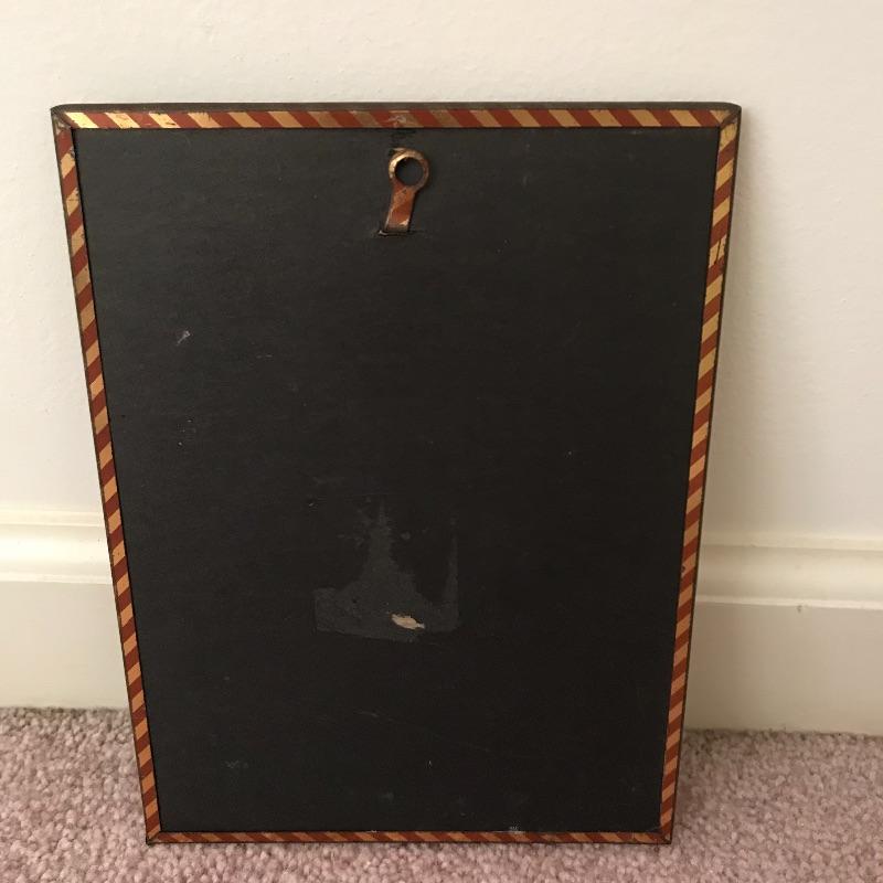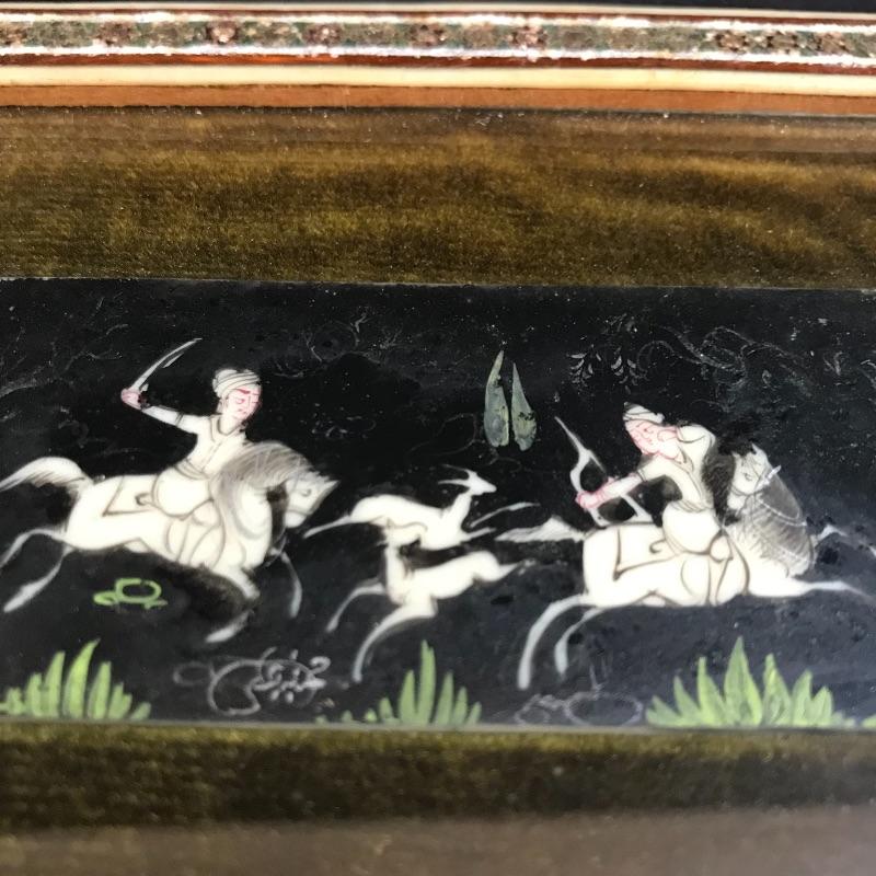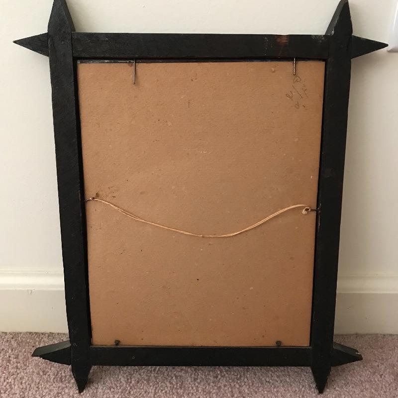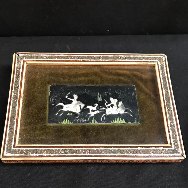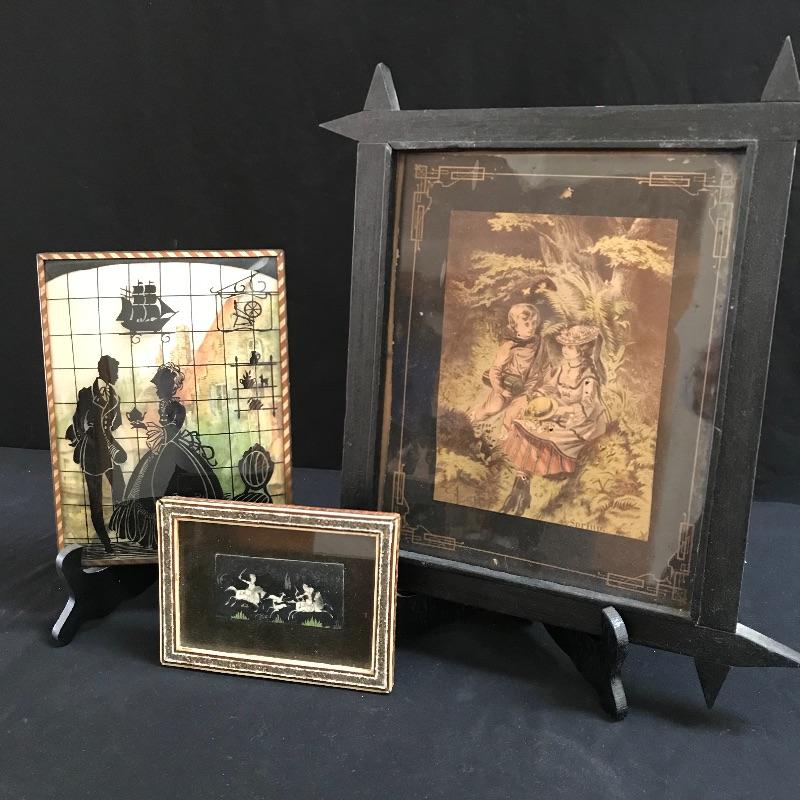 First, a lovely “Spring” scene with a couple sitting in nature in muted greens and pinks. Frame is the largest of the trio. It’s black painted wood with pointed corners measuring 9.5” x 11.5” before points. Next is a fantastic silhouette painted on bowed glass over a town bridge back. Bowed glass is attached to back by striped metal frame. Lastly, a small Asian fight or hunt scene with a metallic feel. Art sits with a cloth matting. Frame has antiqued painting on the front and sides. Shipping available.