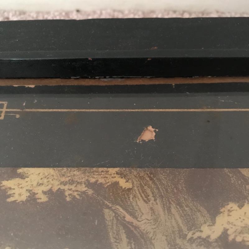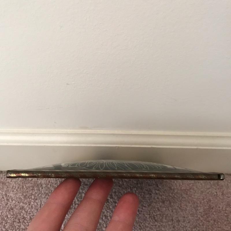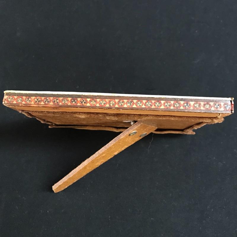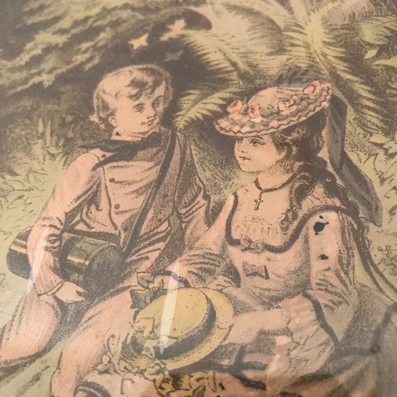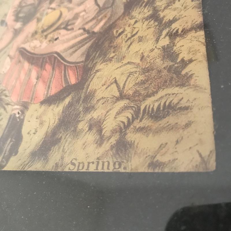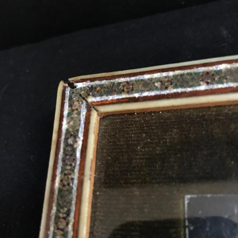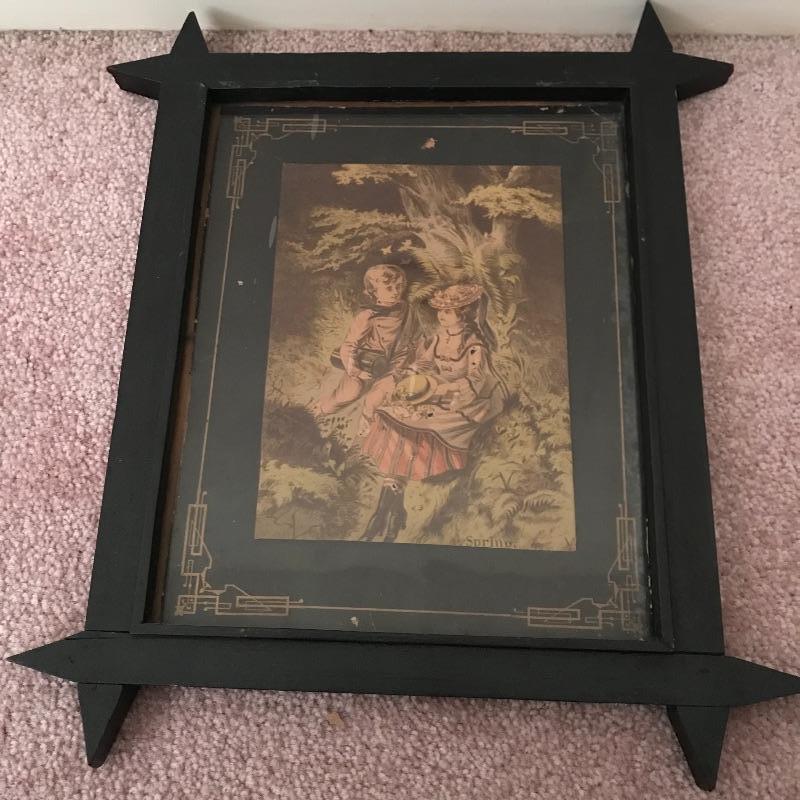 First, a lovely “Spring” scene with a couple sitting in nature in muted greens and pinks. Frame is the largest of the trio. It’s black painted wood with pointed corners measuring 9.5” x 11.5” before points. Next is a fantastic silhouette painted on bowed glass over a town bridge back. Bowed glass is attached to back by striped metal frame. Lastly, a small Asian fight or hunt scene with a metallic feel. Art sits with a cloth matting. Frame has antiqued painting on the front and sides. Shipping available.