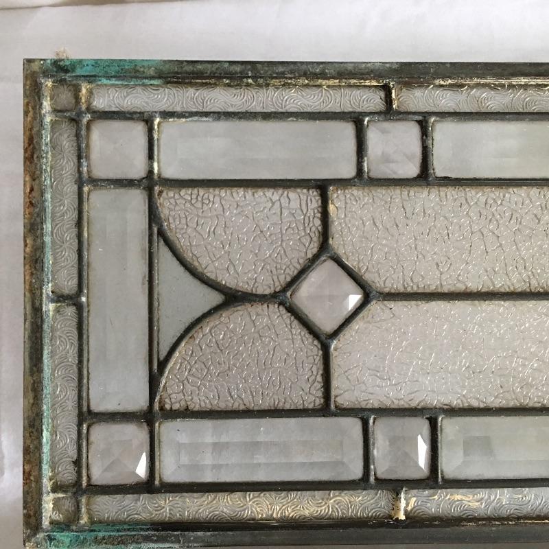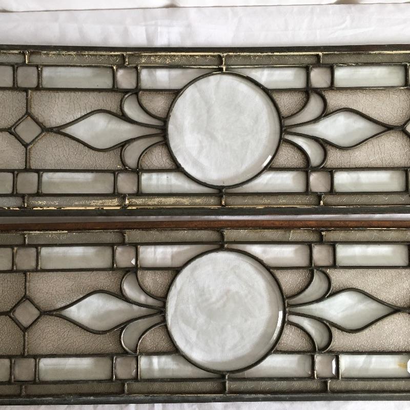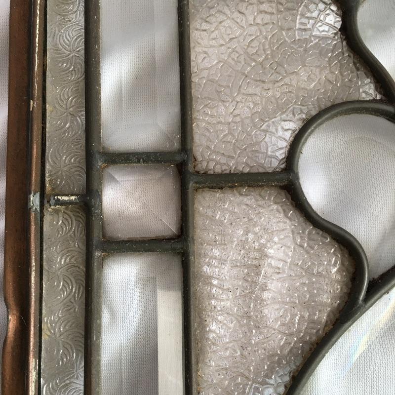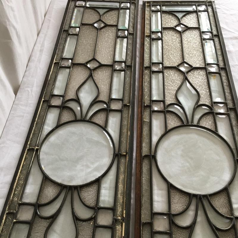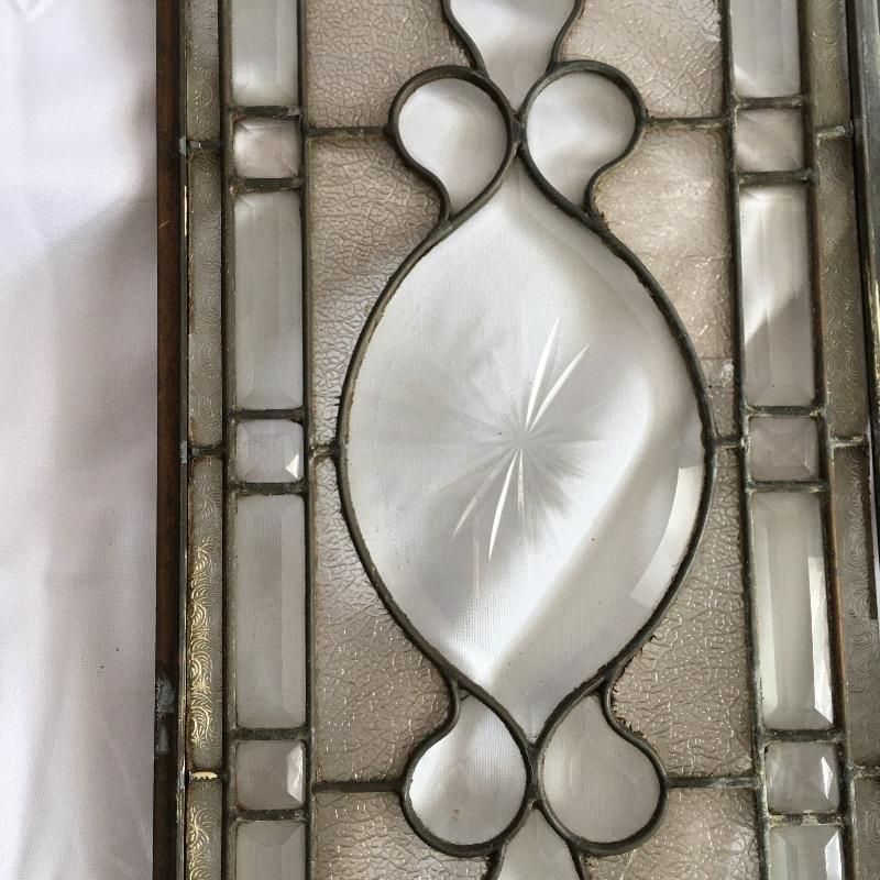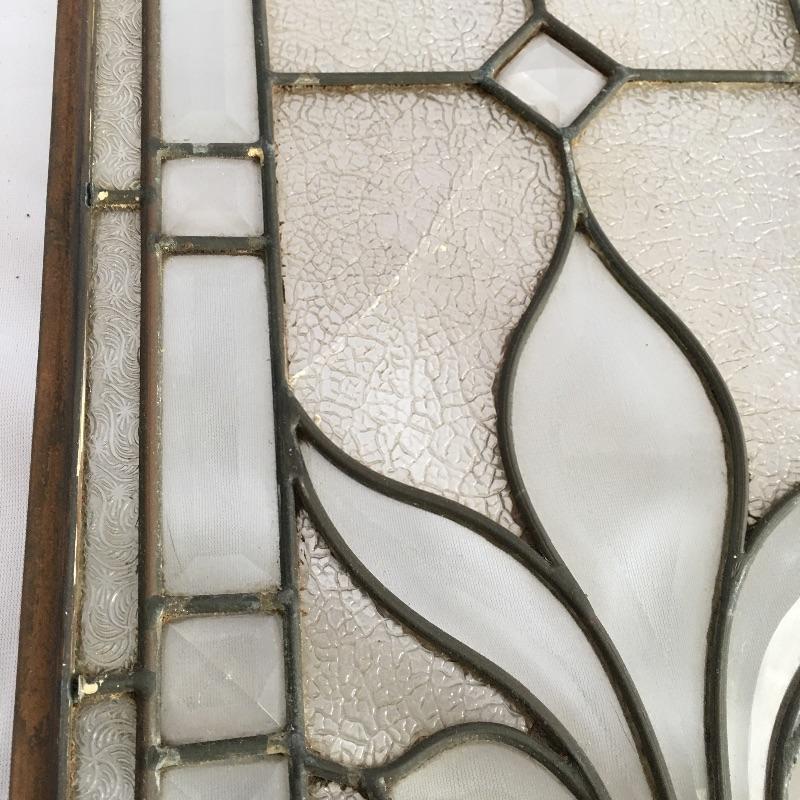 Two Pieces of beveled and leaded glass in a rectangular shape. Lead has come undone on some of the edges and one piece of glass is broken, see pictures. Piece measures 10” x 48.75”.