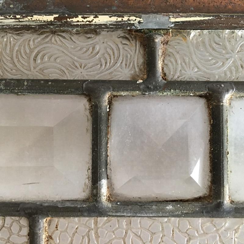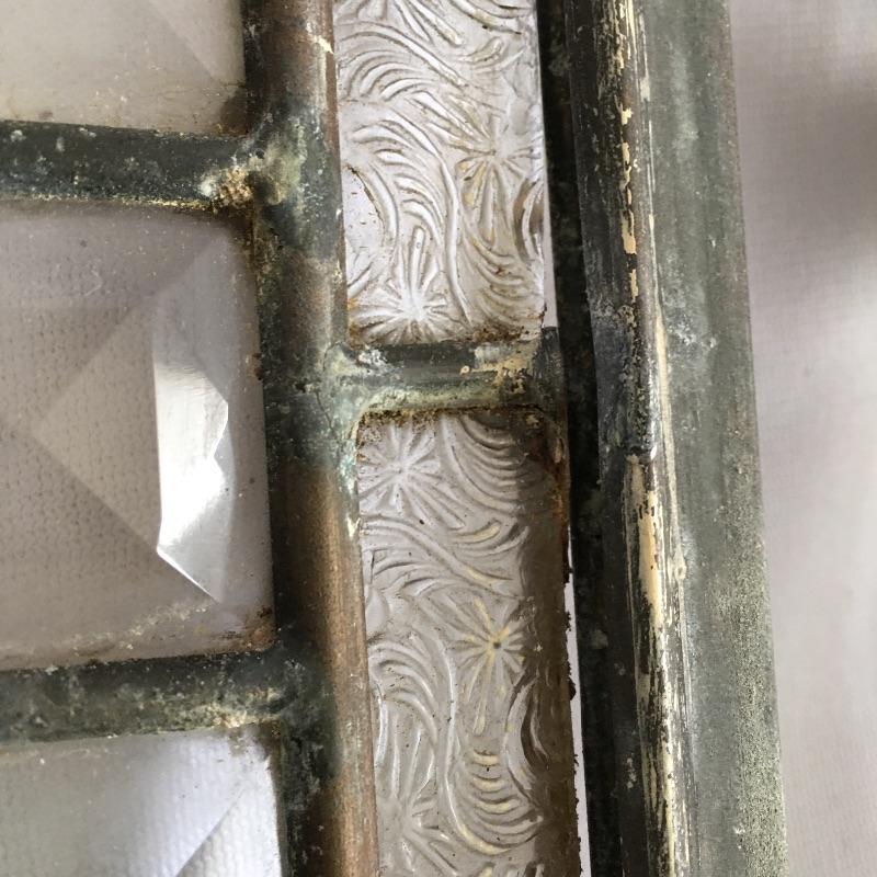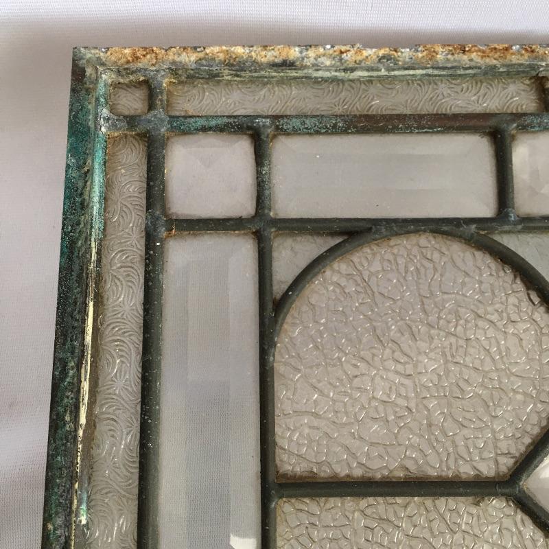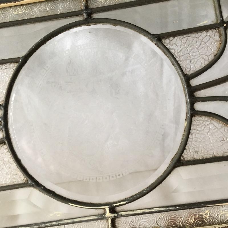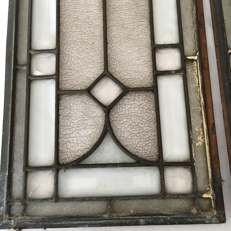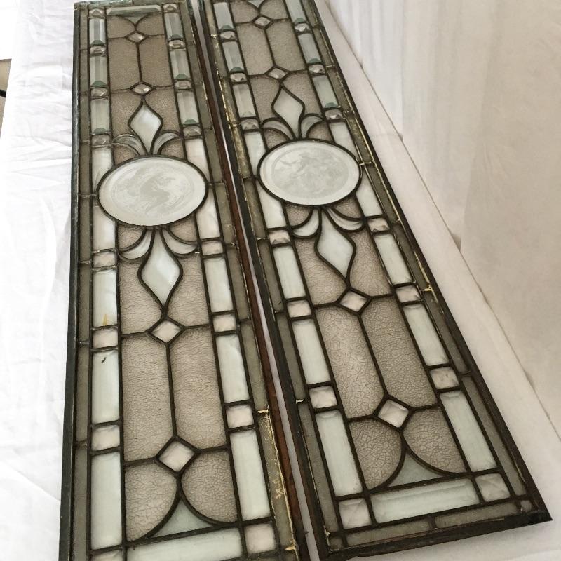 Two Pieces of beveled and leaded glass in a rectangular shape. Lead has come undone on some of the edges and one piece of glass is broken, see pictures. Piece measures 10” x 48.75”.