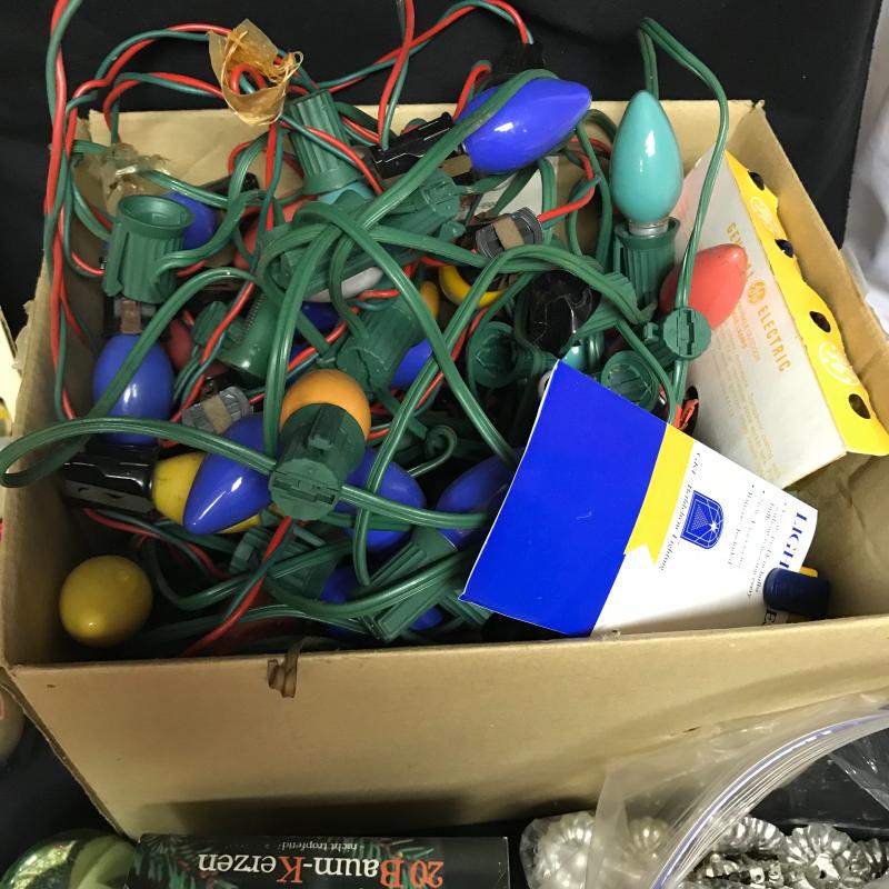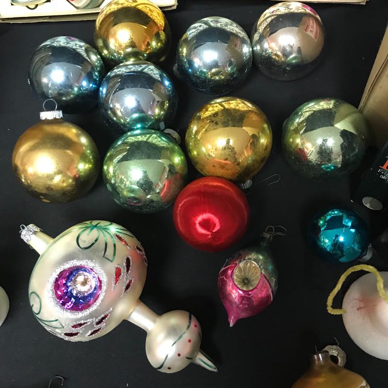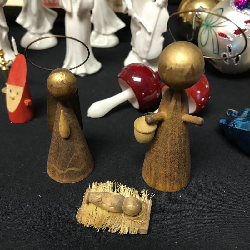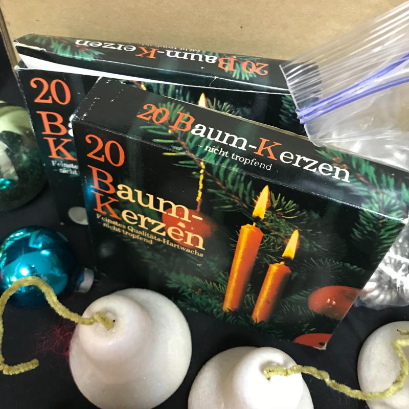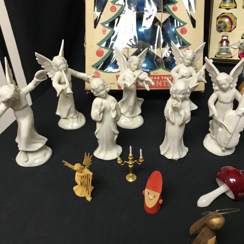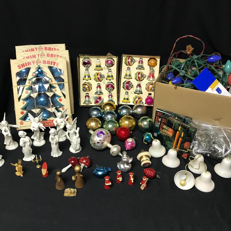 Lot contains a variety of vintage Christmas decor including lights, German Dresden angel figurines, glass ornaments, clip-on candle holders and candles for Christmas tree and more. See pics. Local pickup only.