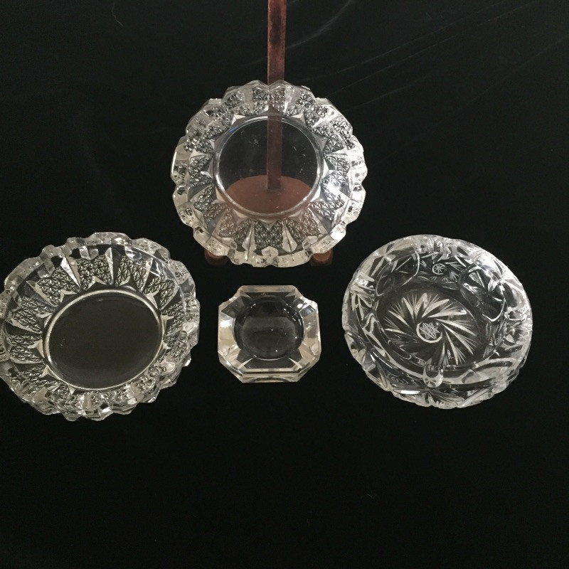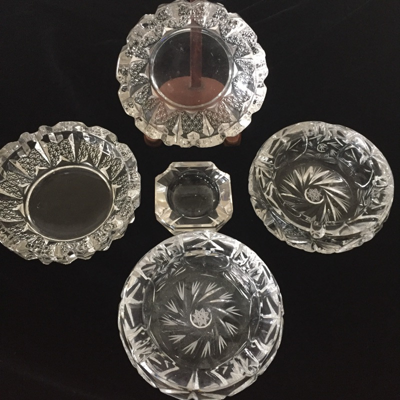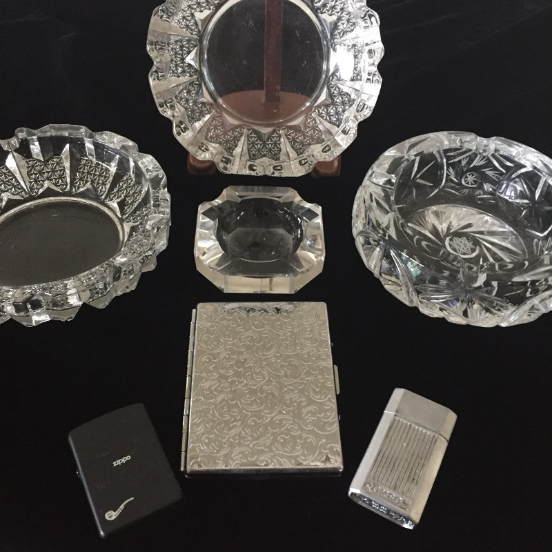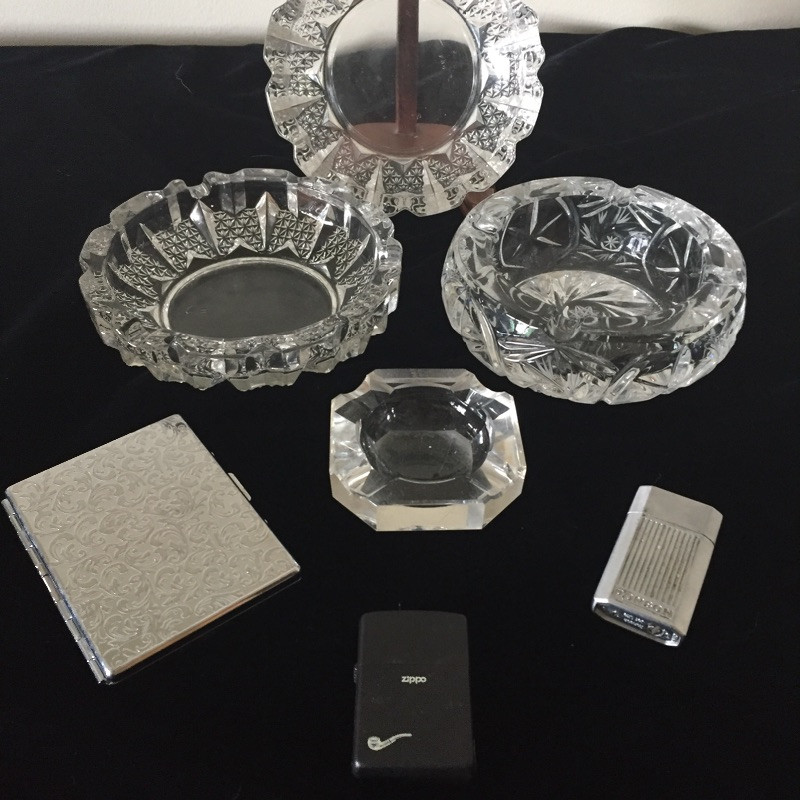 Four large glass ashtrays and one smaller one are accompanied by a silver like cigarette case and 2 lighters one of which is a zippo.