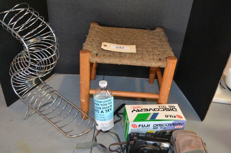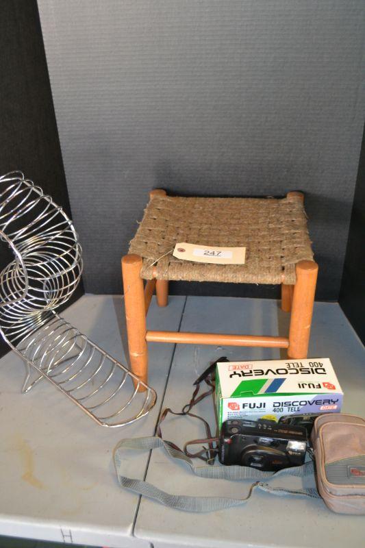 LOT 247 STOOL, CAMERA AND RACK