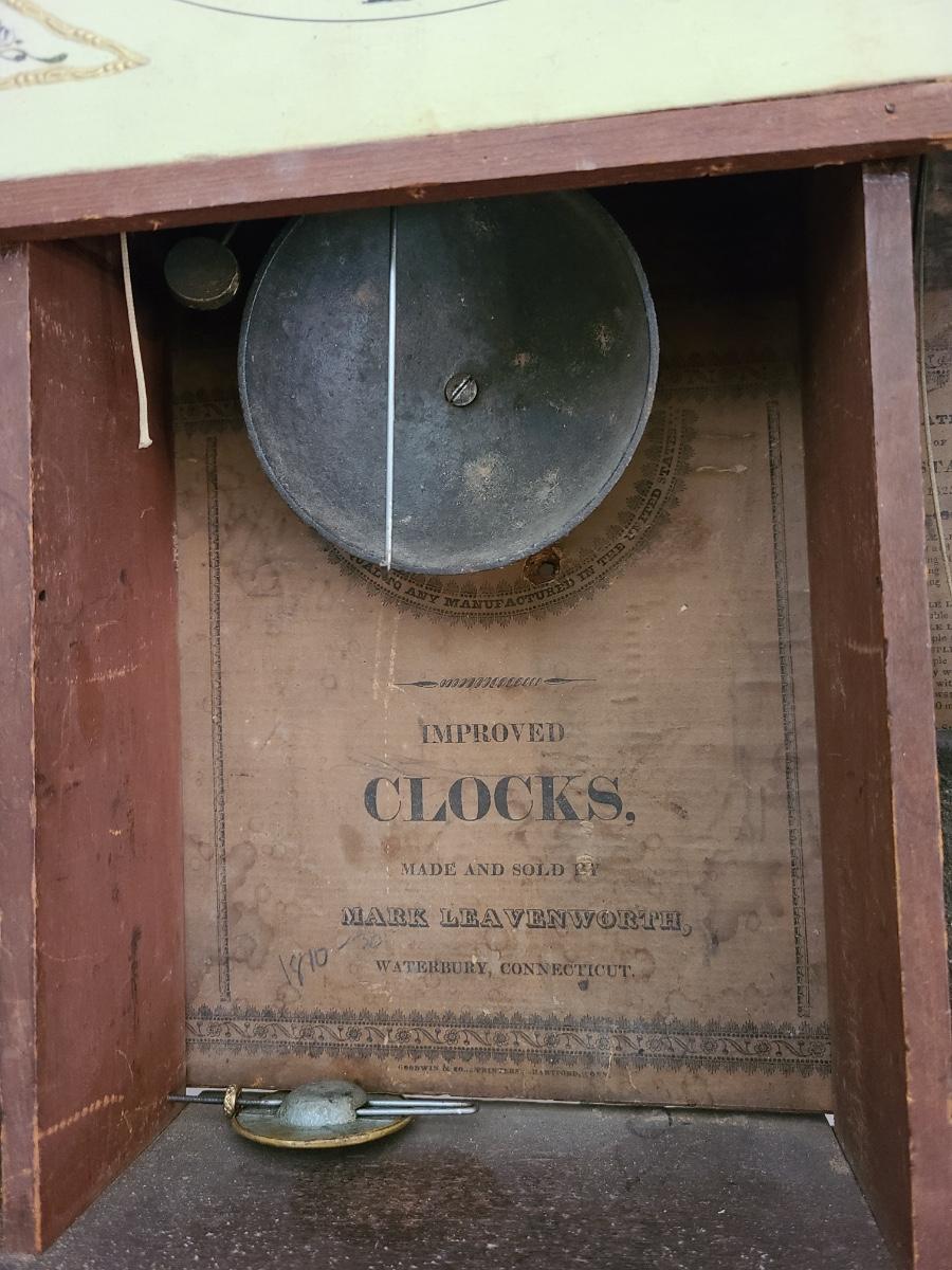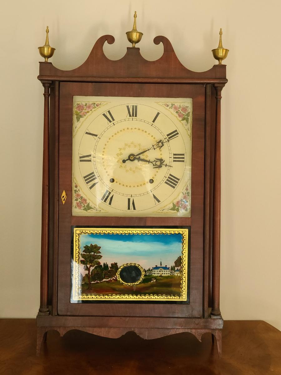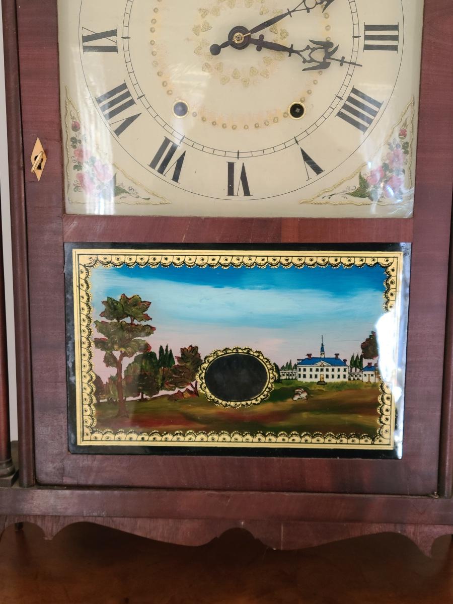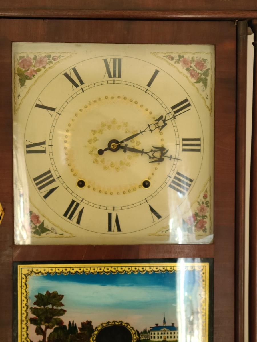 Lot 247: 1825 Working Mark Leavenworth Pillar & Scroll Clock w/Reverse Glass Painting & Key