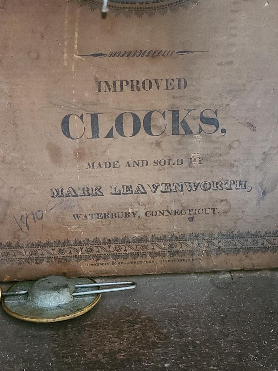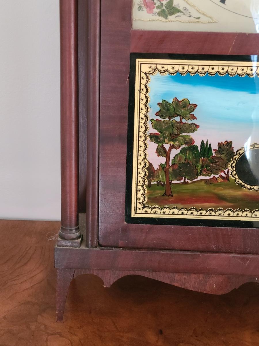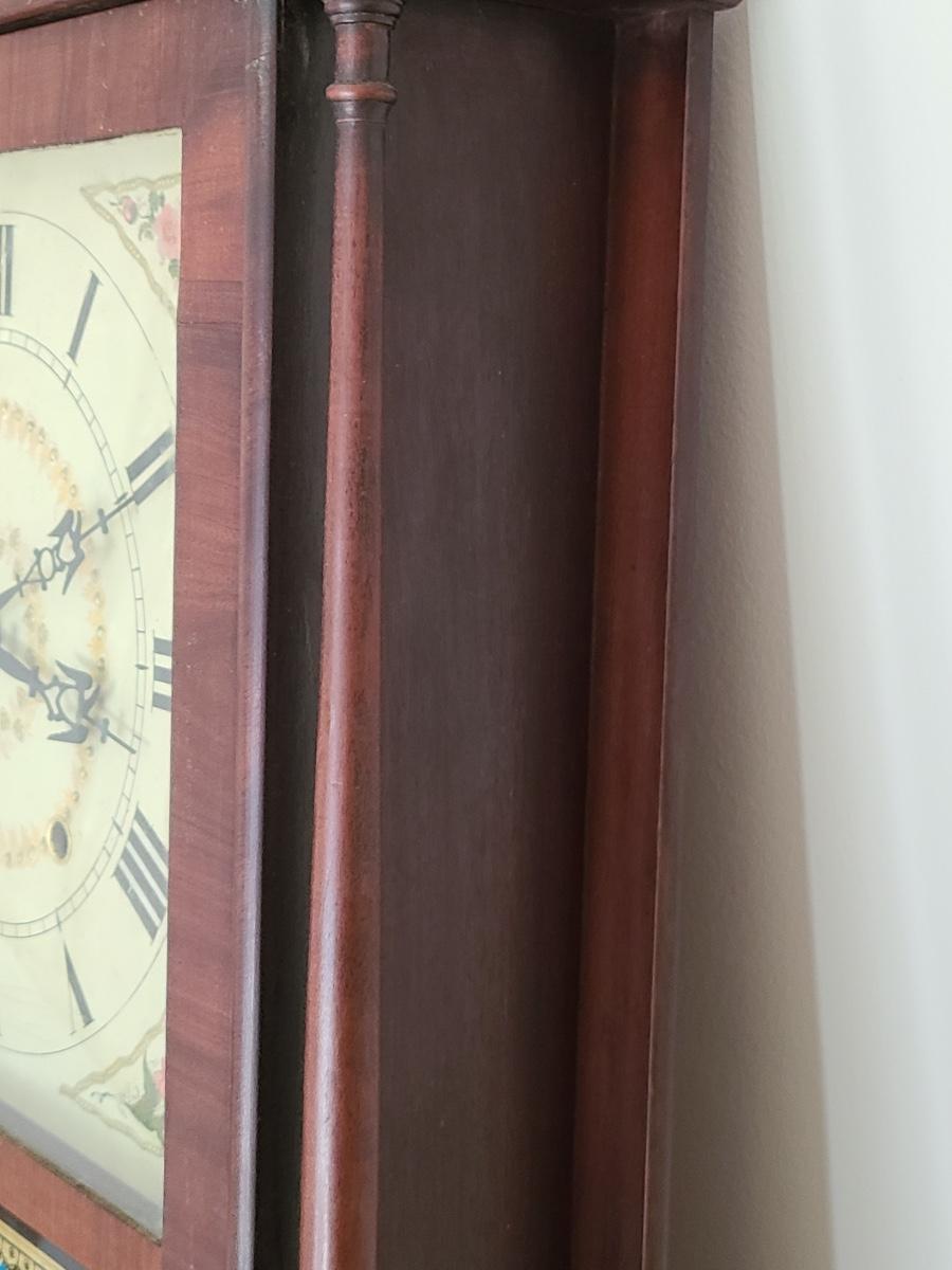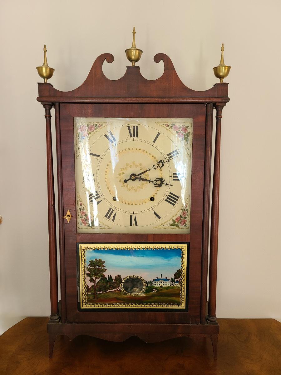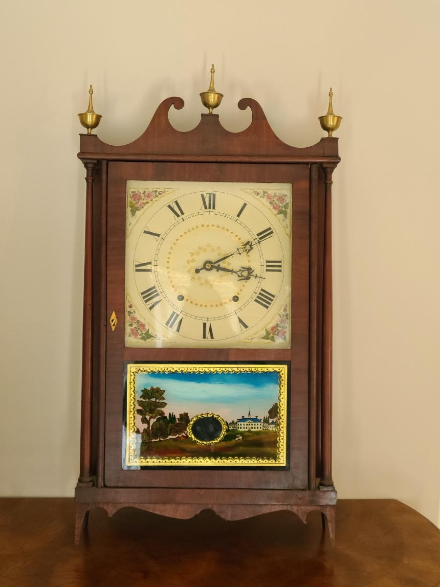 Lot 247: 1825 Working Mark Leavenworth Pillar & Scroll Clock w/Reverse Glass Painting & Key