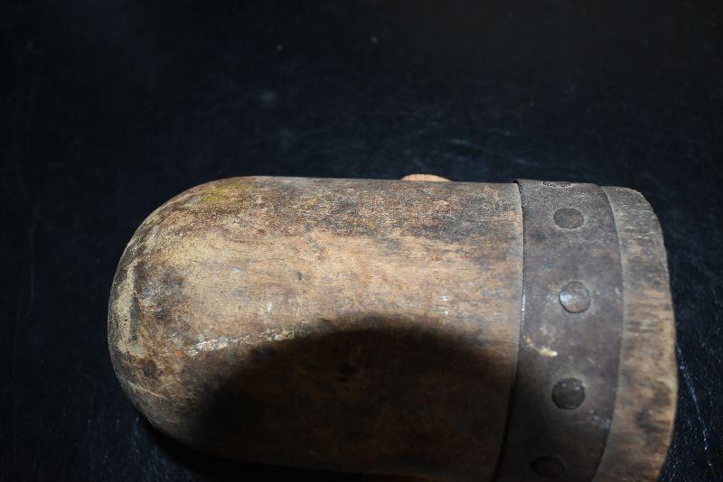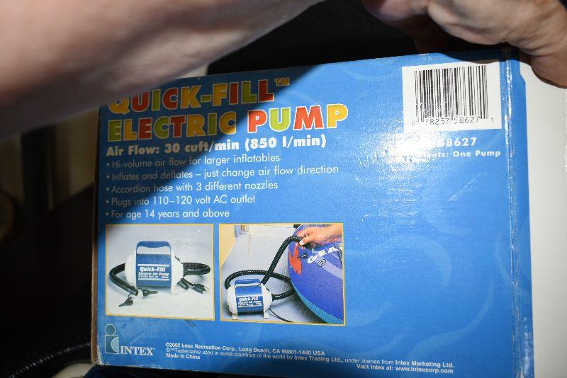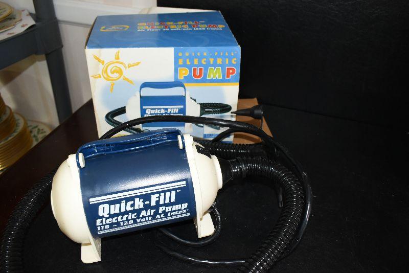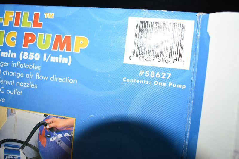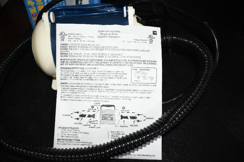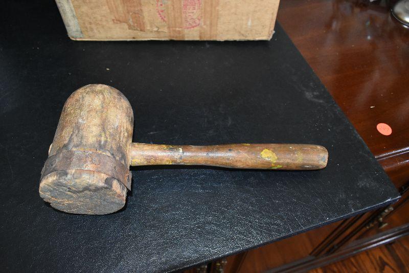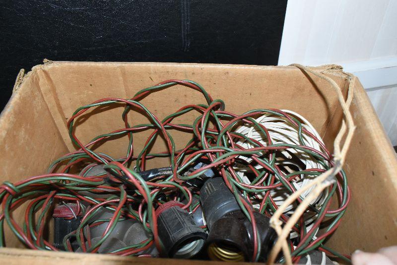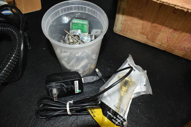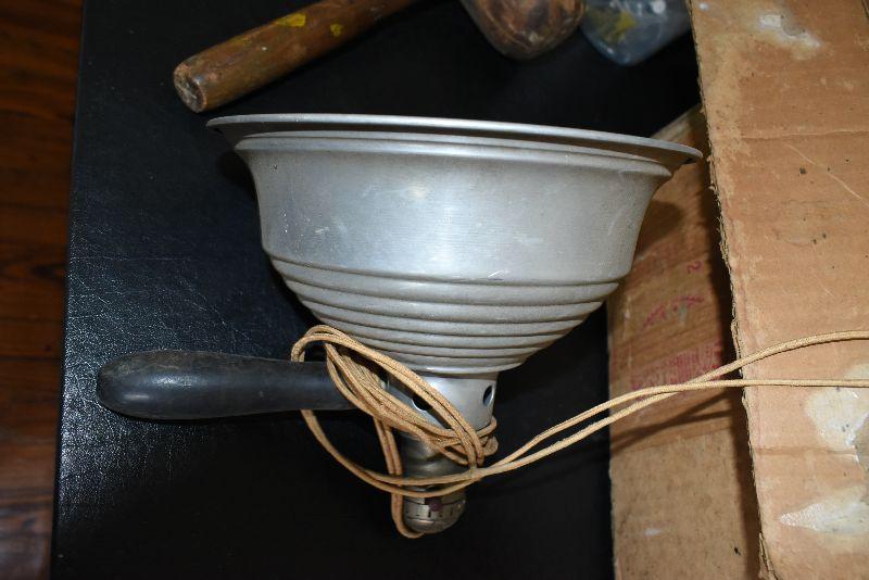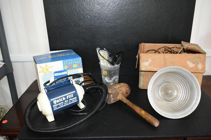Handheld light, portable air pump, both untested, wires and cords, vintage mallet, and more.