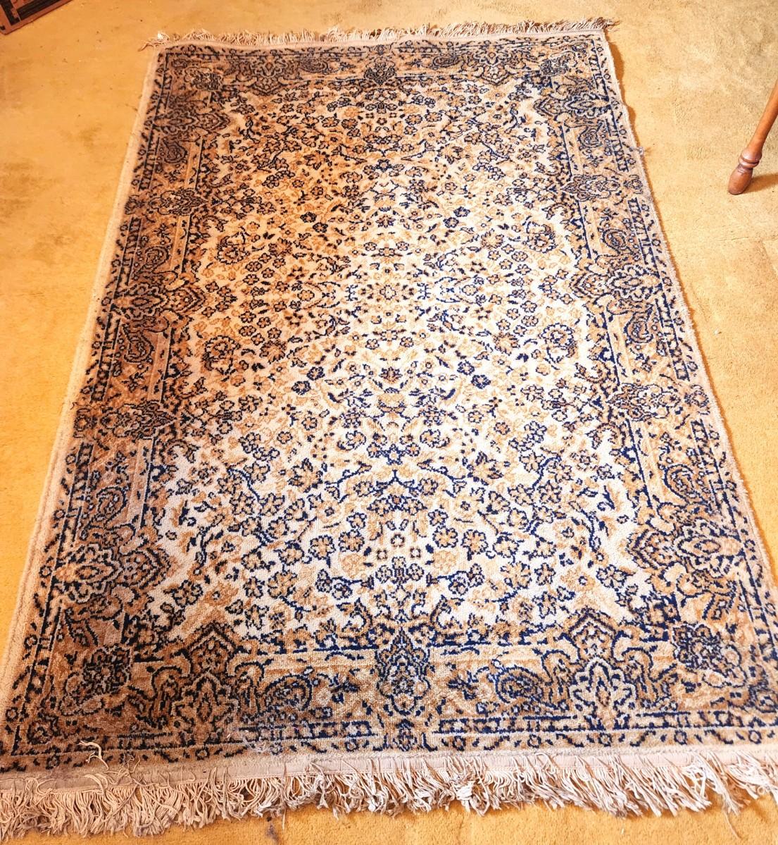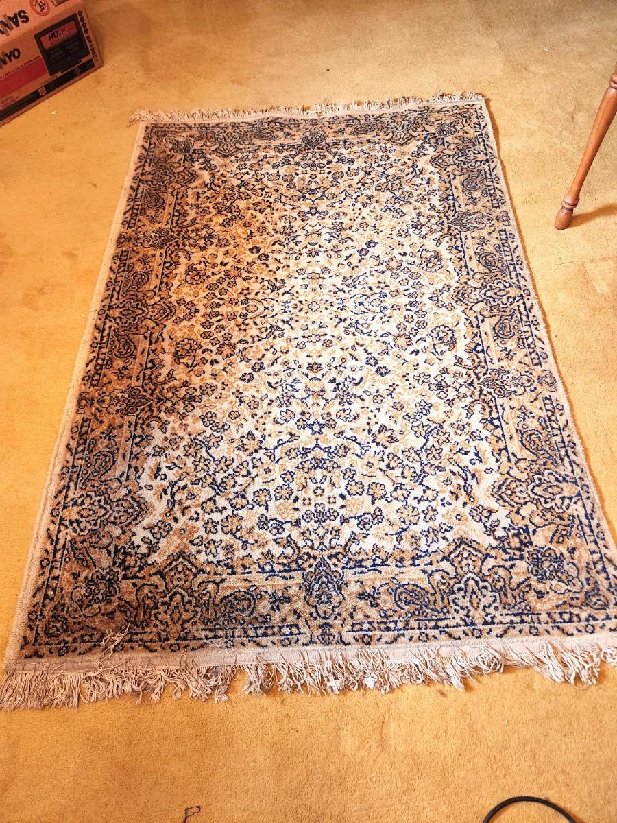 Vintage Bhadra Indian Rug - this section of India known for good quality rugs. Measures 73" long including fringe - 4 feet across. This has been rolled up and not displayed - could use a clean.