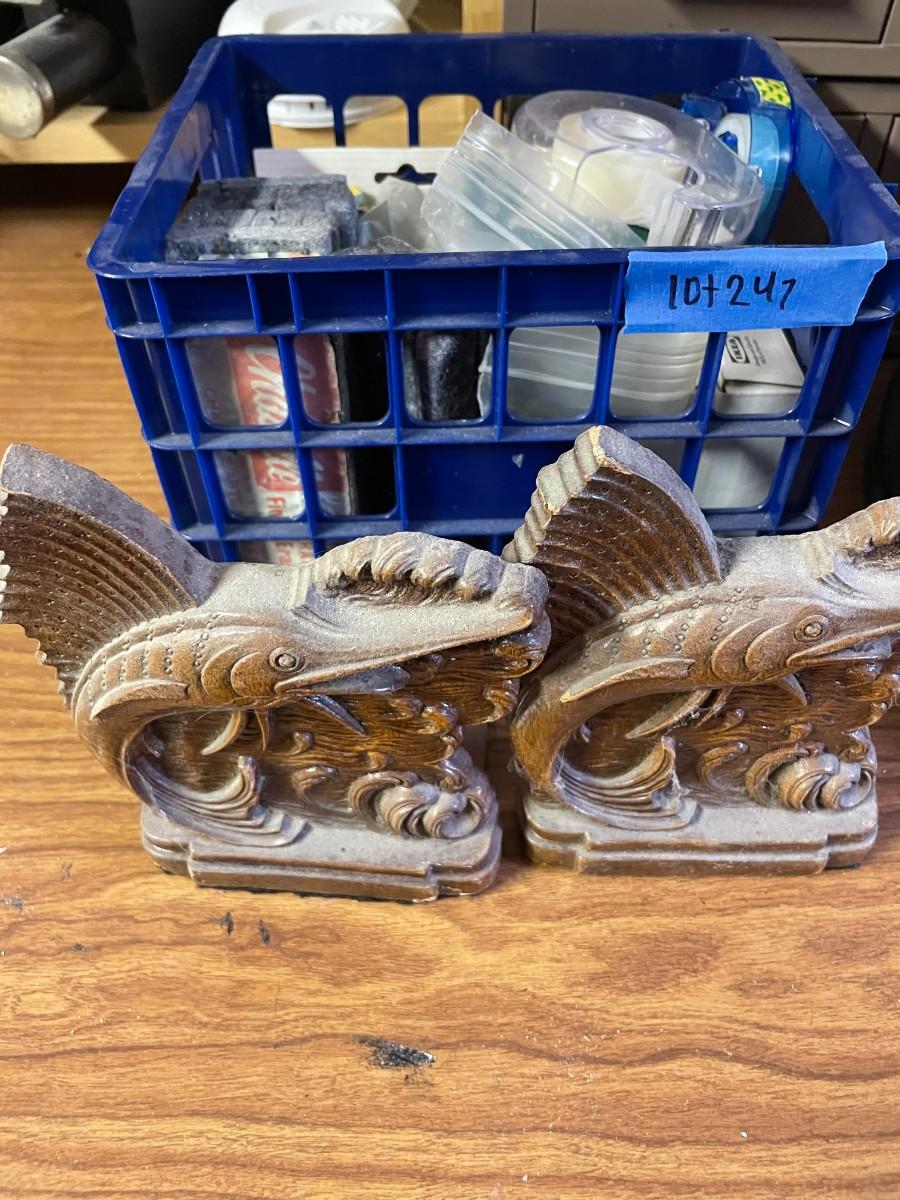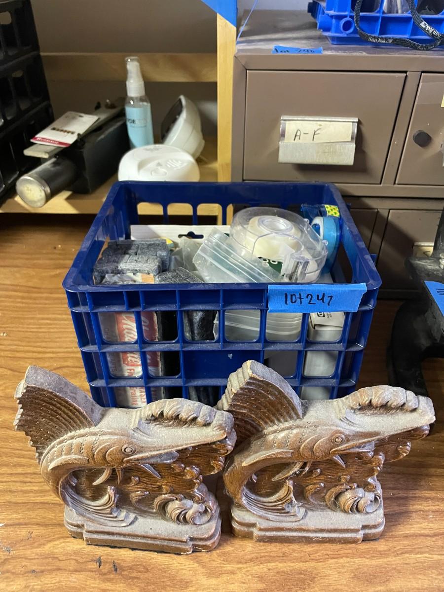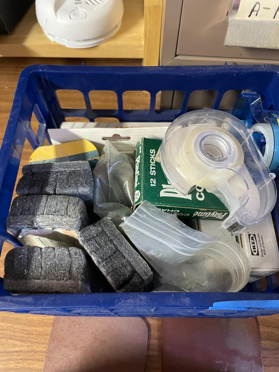 lot 247- box of chalk and erasers, (2) wood book ends, tape