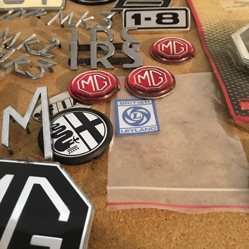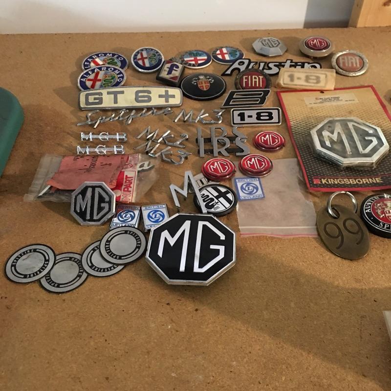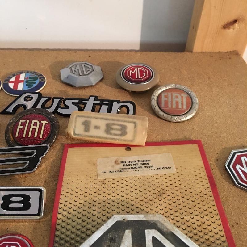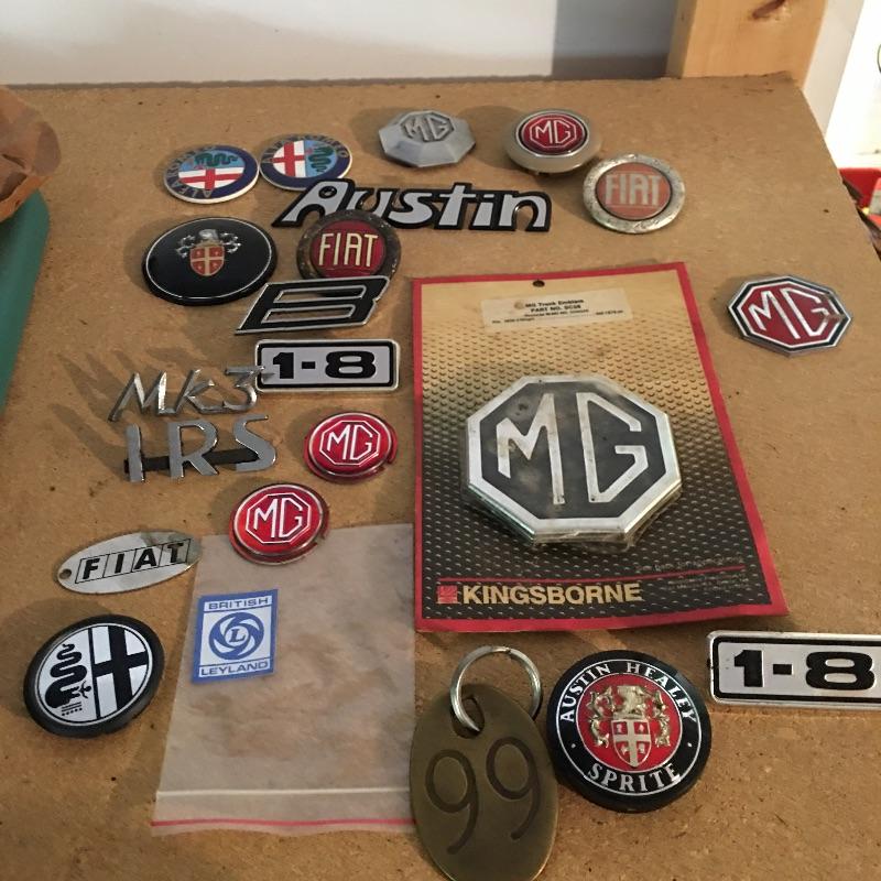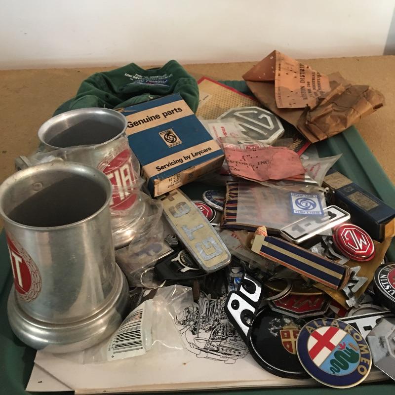 Foreign car emblems and more. Lot includes MG, MGB, Alfa Romeo, Austin Healy, key chains, two Fiat mugs and more. Just what you need when you are restoring your classic car.
