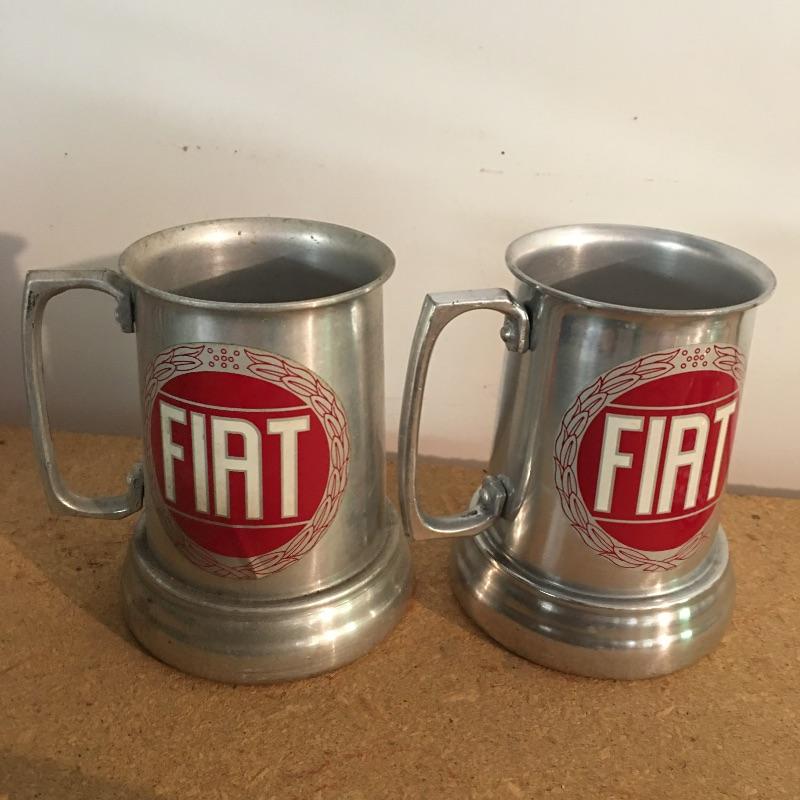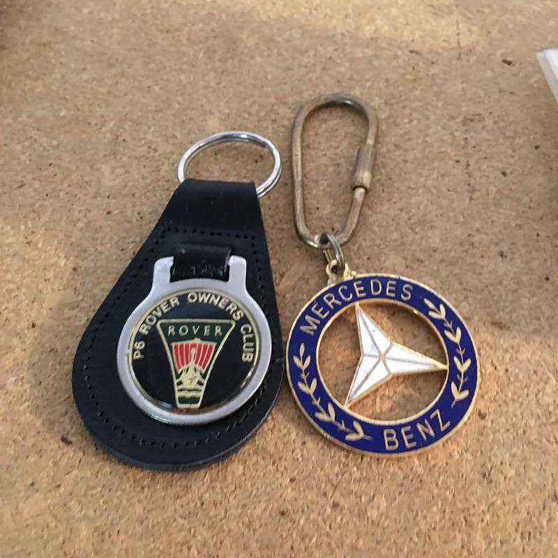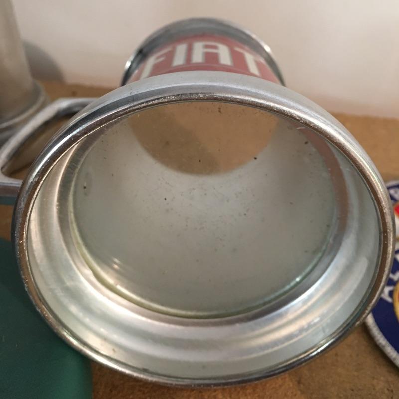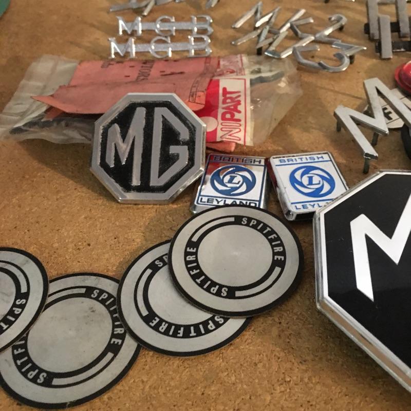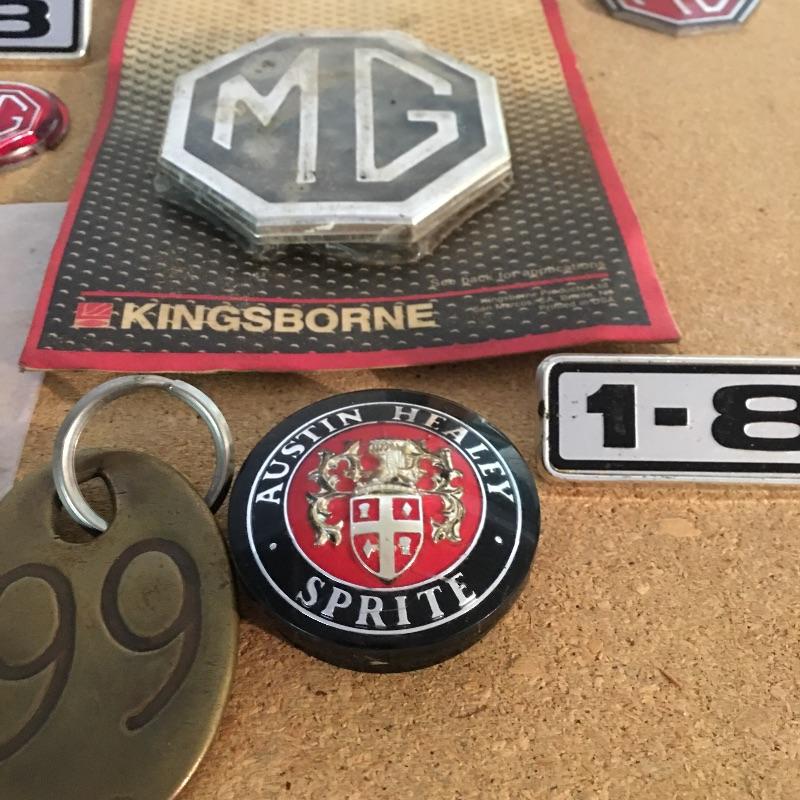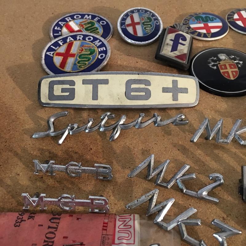 Foreign car emblems and more. Lot includes MG, MGB, Alfa Romeo, Austin Healy, key chains, two Fiat mugs and more. Just what you need when you are restoring your classic car.