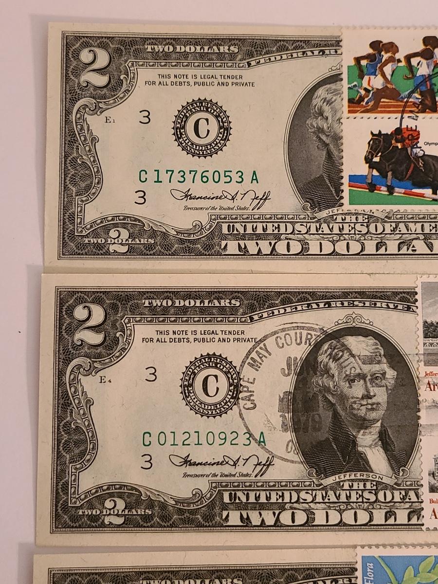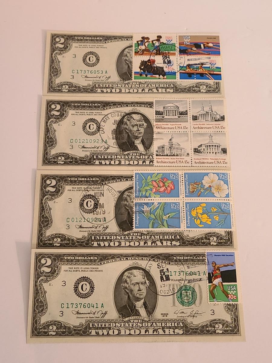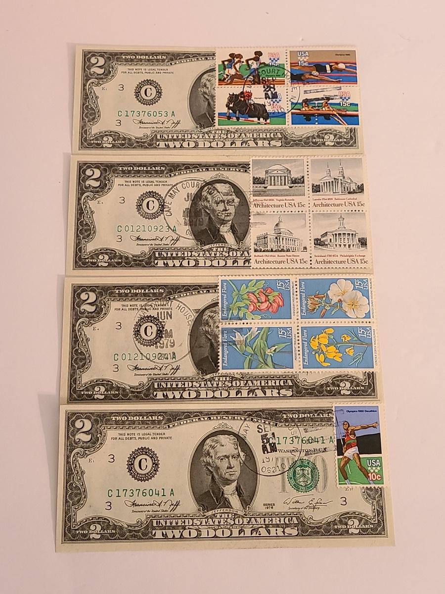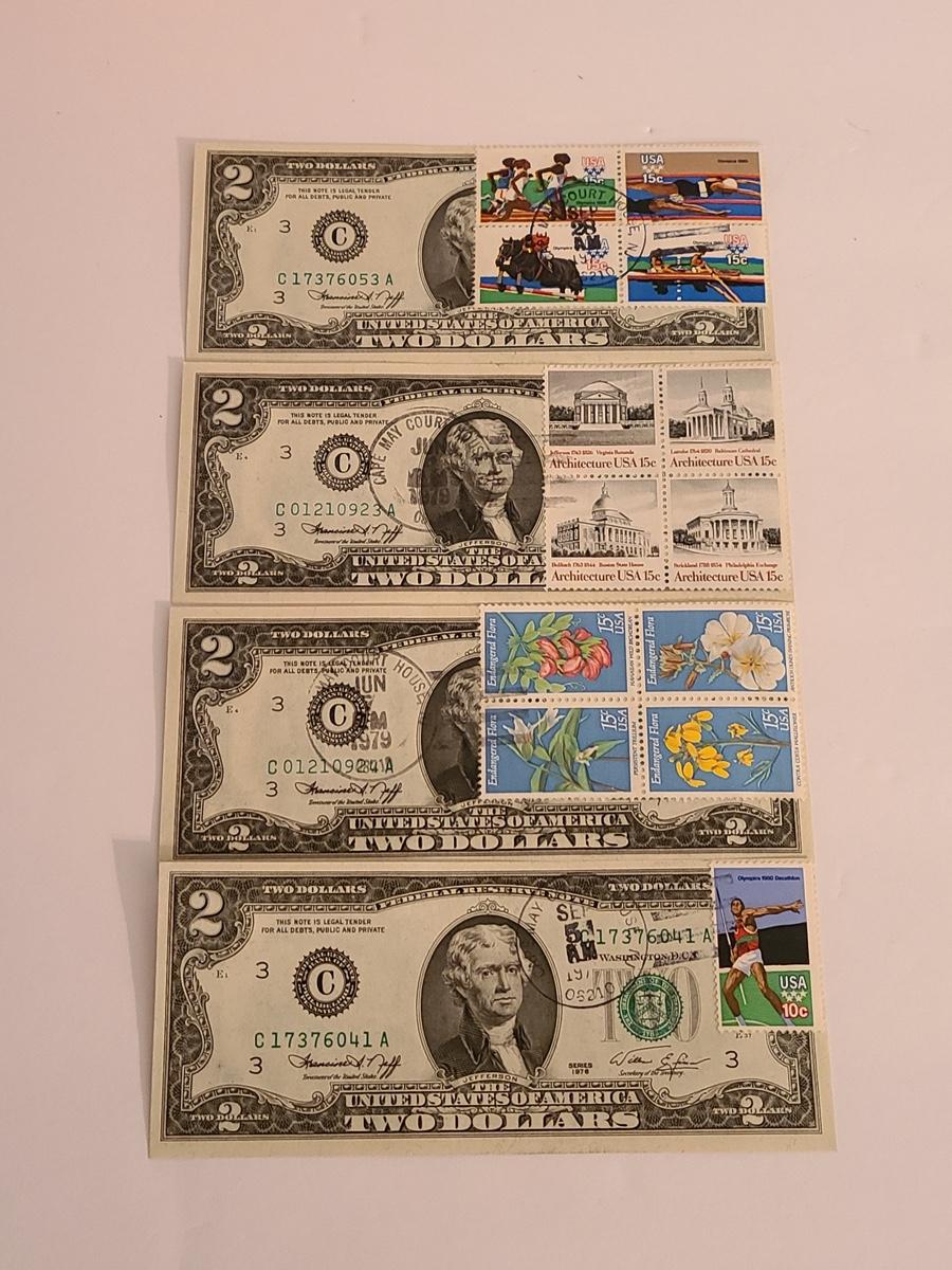 Lot 247: Four $2.00 Bills Some First Day of Issue Stamped.