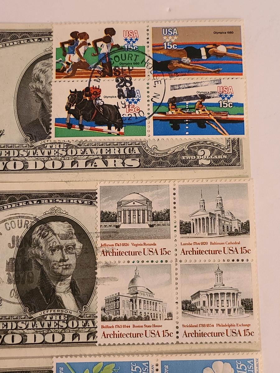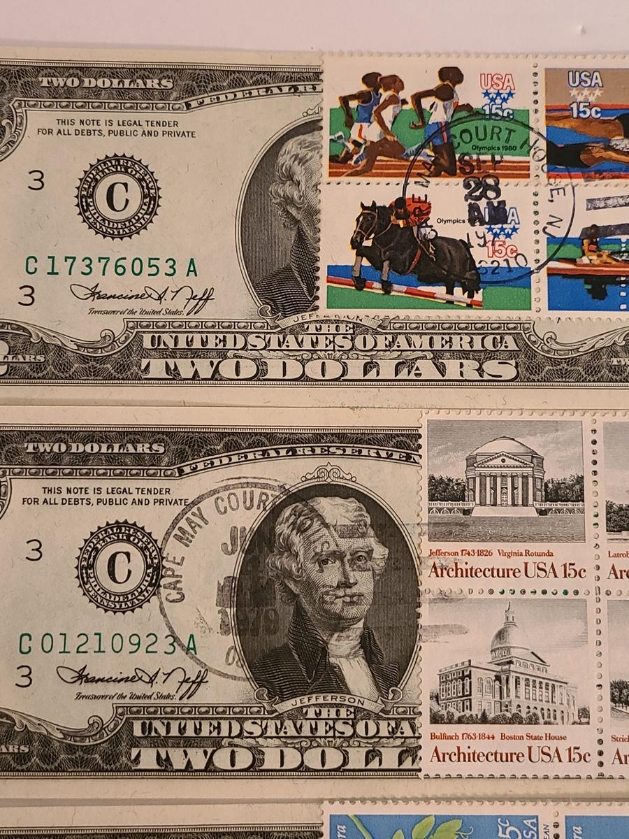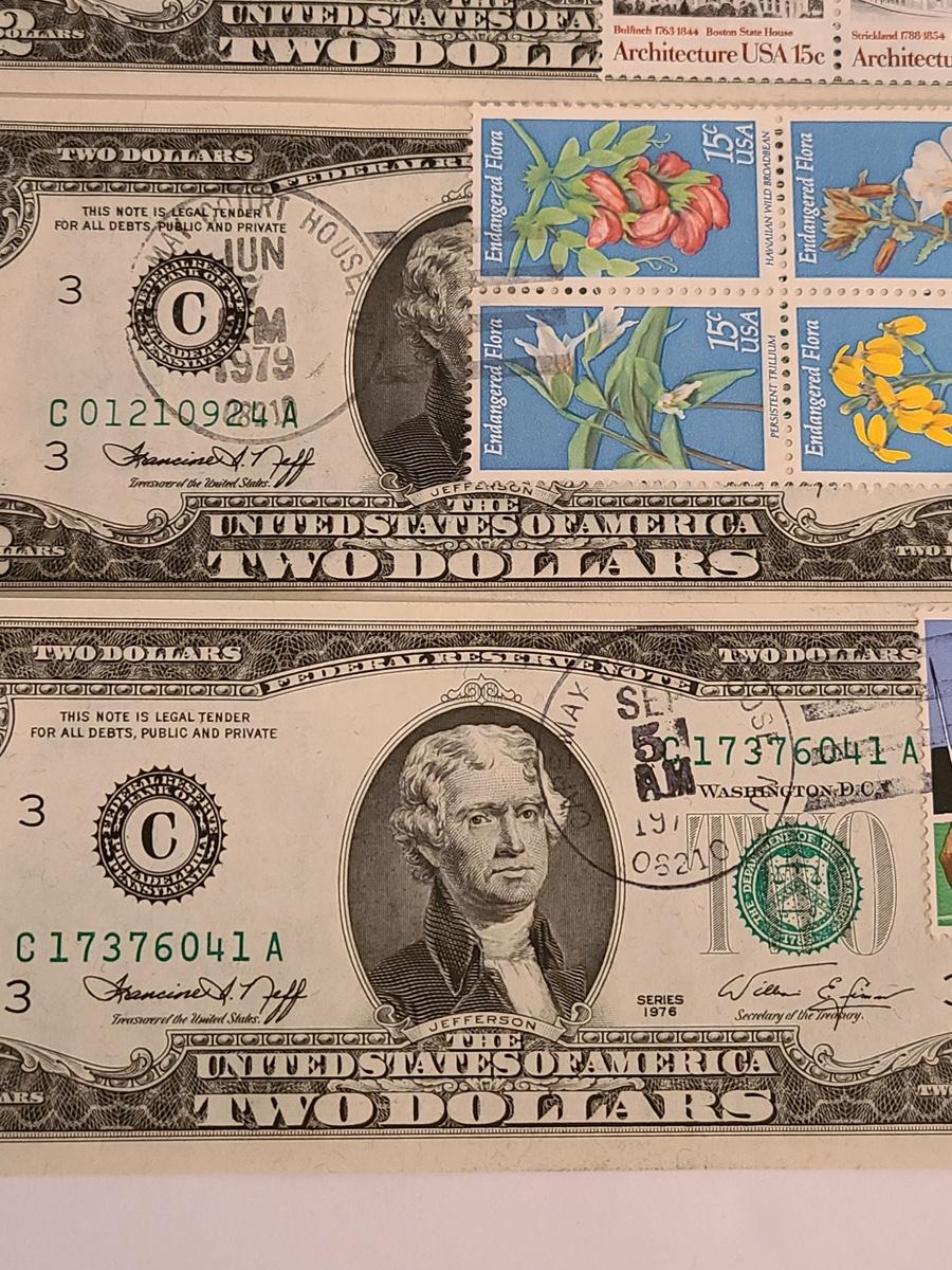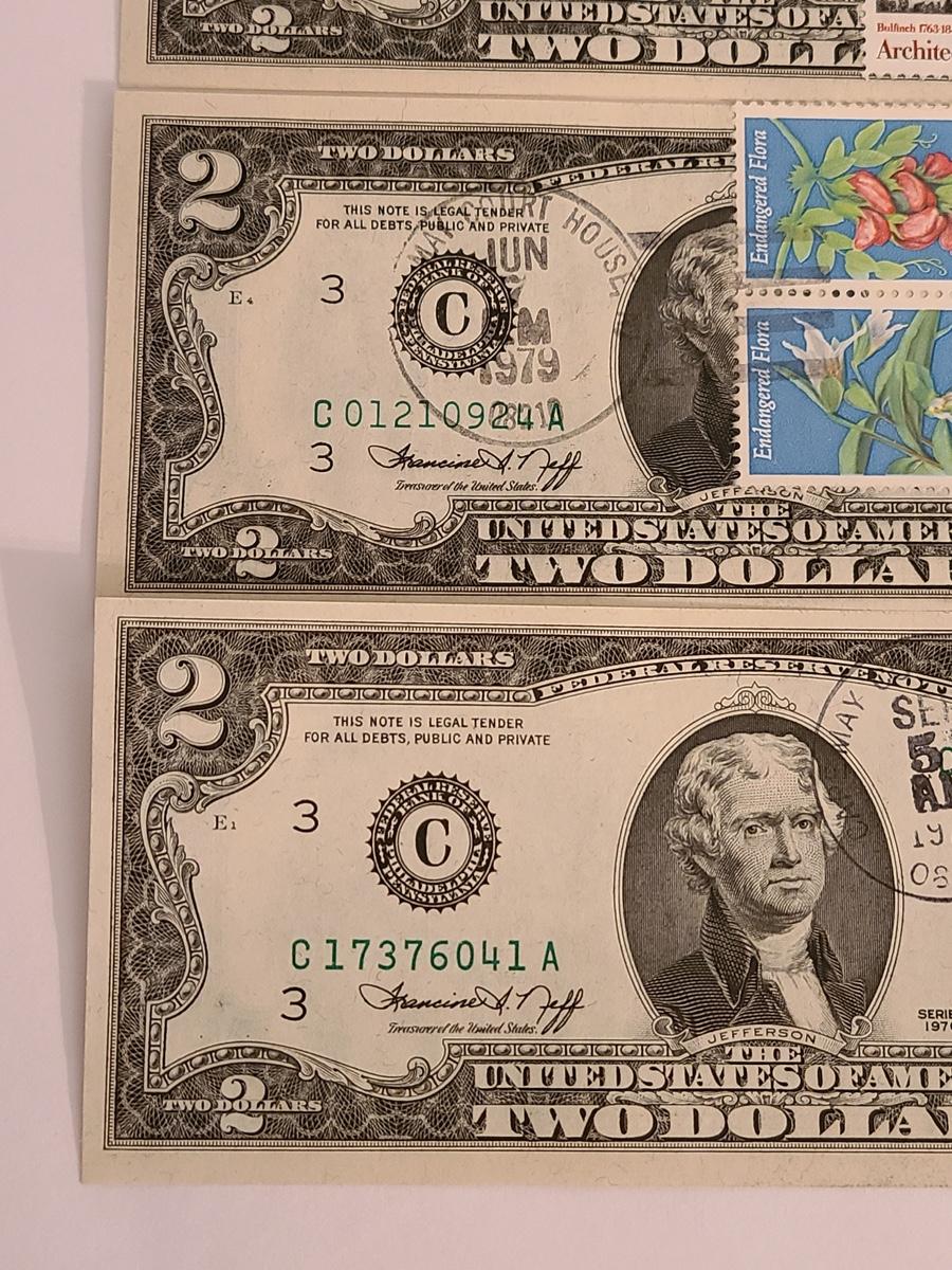 Lot 247: Four $2.00 Bills Some First Day of Issue Stamped.