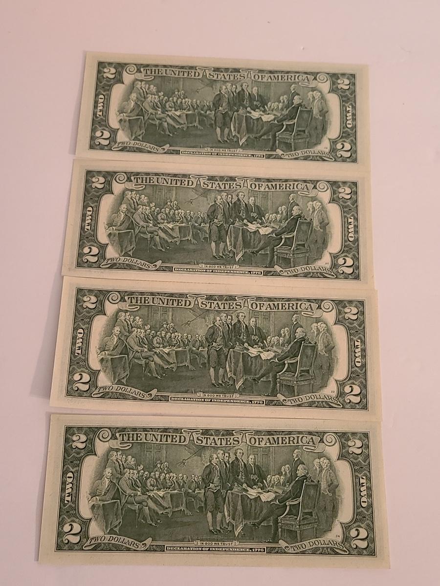Four $2.00 bills, we can't guaranteed whether uncirculated or not, so please see condition in pictures. The pictures show condition, measurements if taken, and what is included in the lot. Due to the large amount that we photograph and the time frame, we are not always able to take measurements. All items unless noted, are pre-owned and have been used. If you purchased furniture, you must bring help. We do not allow one person to carry large furniture out on their own. Bring help, tools and a truck for the safety of our client’s homes, and your personal safety. Company policy. Thank you.