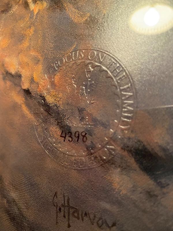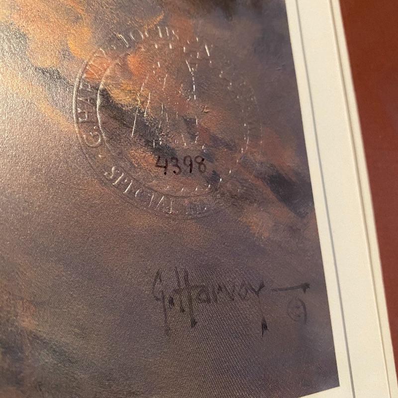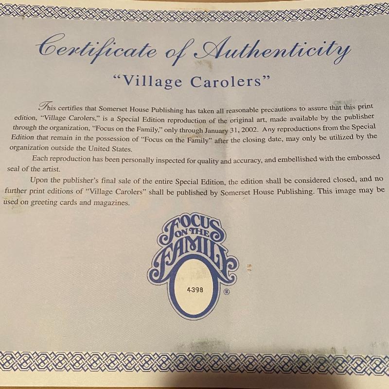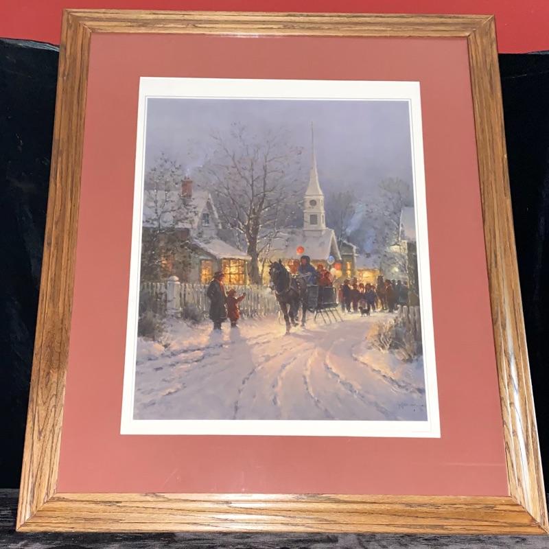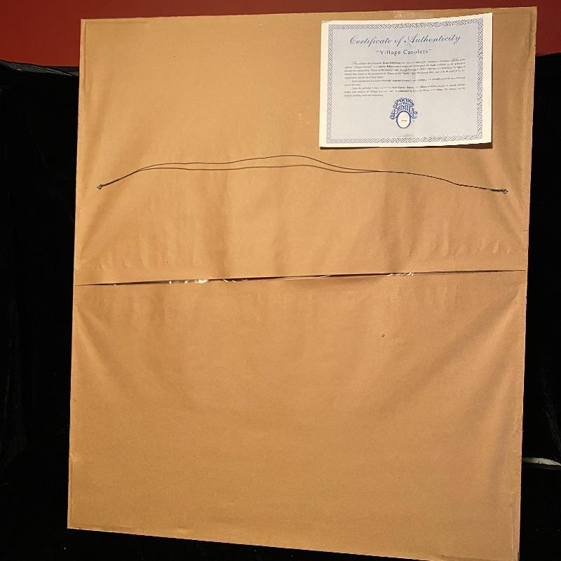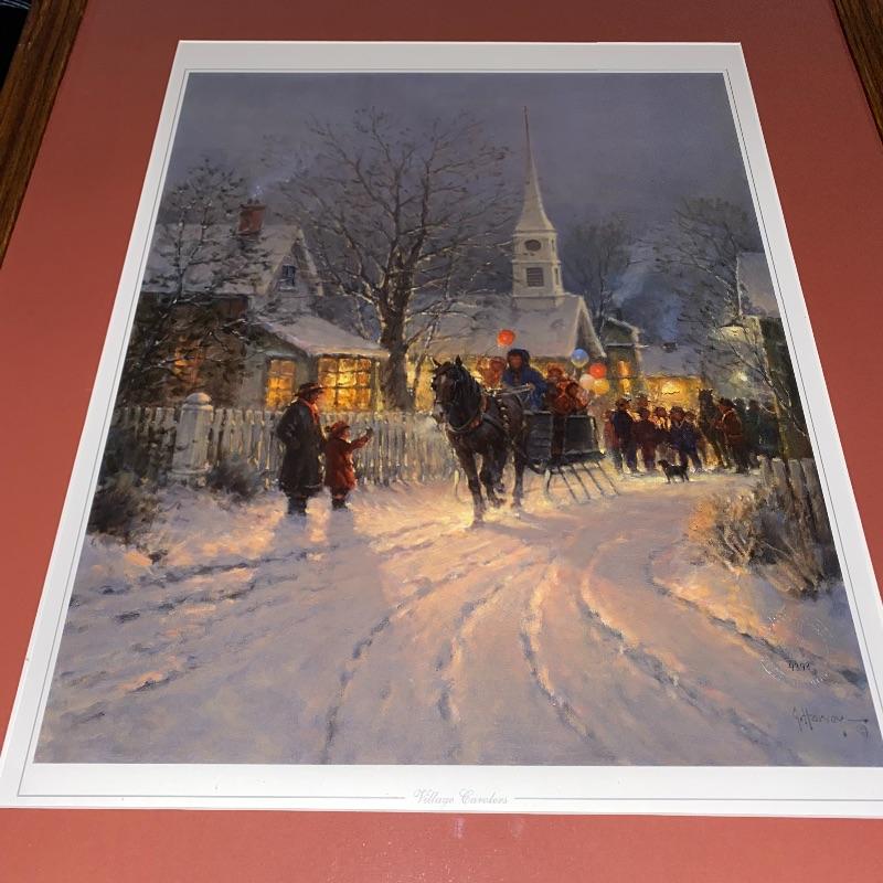 Huge framed G. Harvey special edition print is numbered 4398 and comes with Certificate of Authenticity. Print’s snowy scene is called “ Village Carolers”. Has an Embossed seal of the artist on front right bottom of print as part of the “Focus of the Family” series. COA has more info regarding this edition. Shipping available but will be costly due to its size. Measures 36.5” x 31”. Please call UPS for quote prior to bidding 828-252-6930