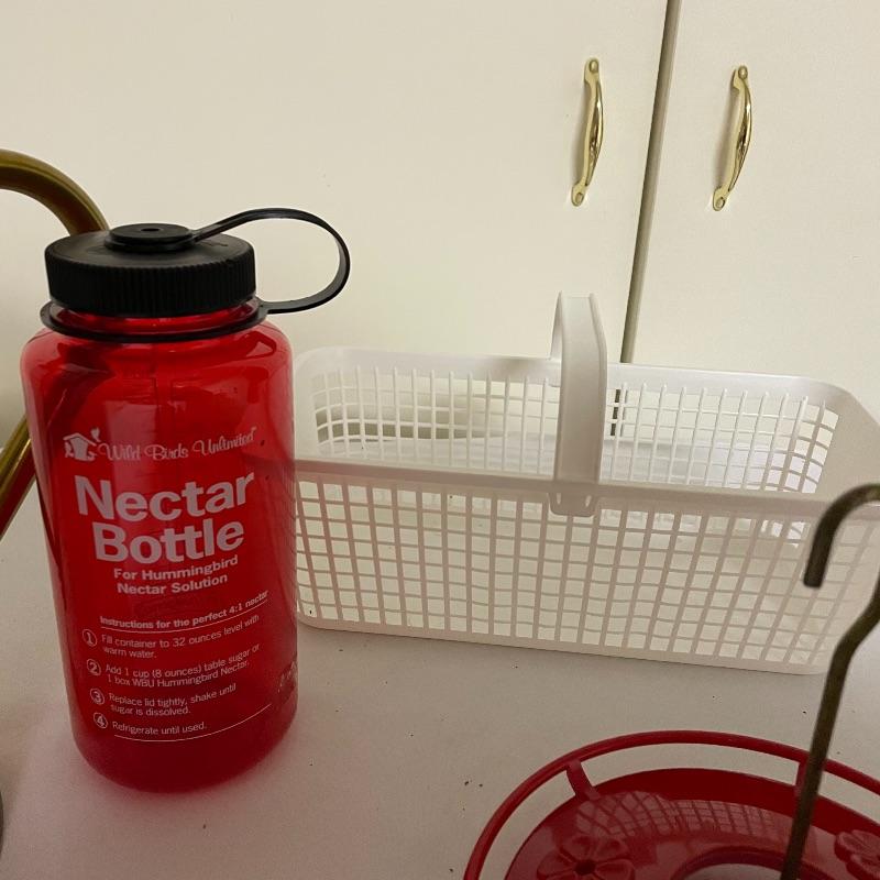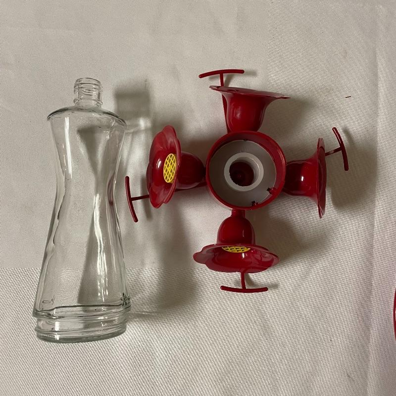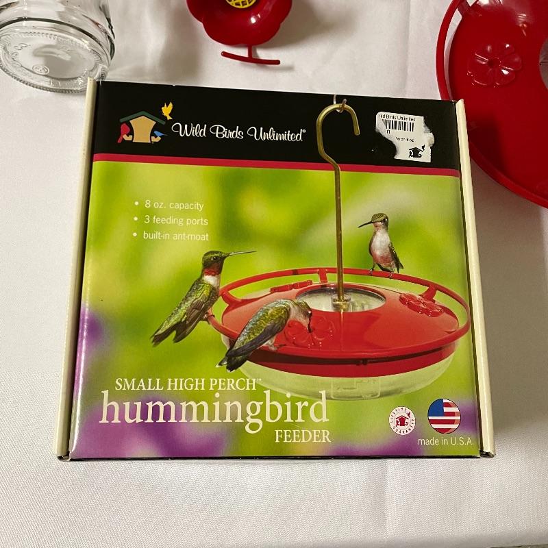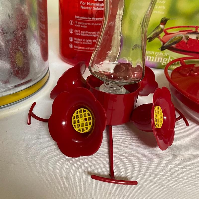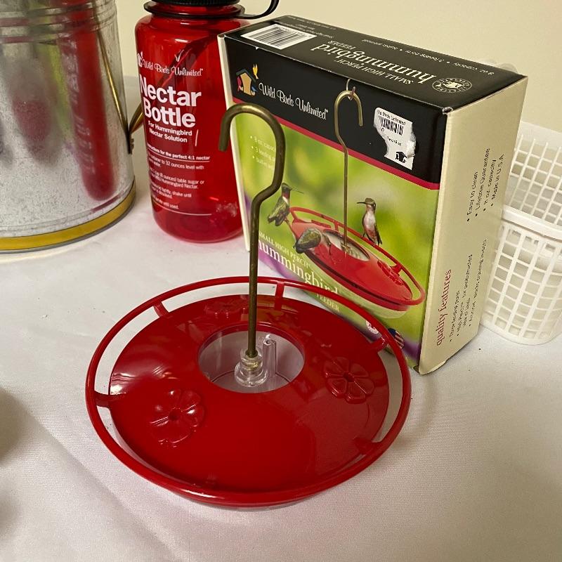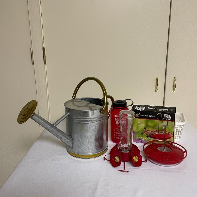 Welcome these little fliers to your yard with a small high perch hummingbird feeder, plus a second feeder with glass bottle for nectar. Lot also includes a plastic red nectar bottle. Just to add some more charm to your garden, a nice 8”d watering can that appear to be aluminum. See photos. Local pick up only.