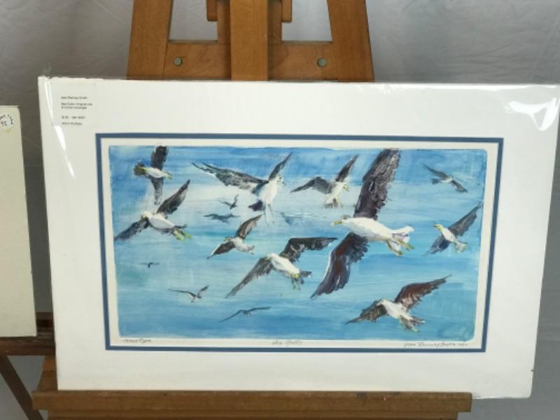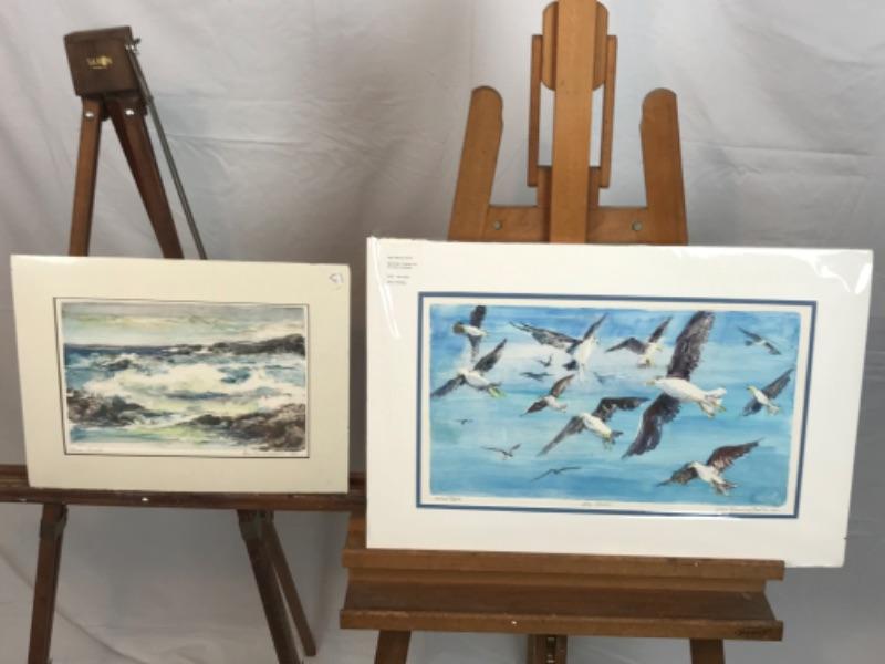 Pair of Jean Ranney Smith mono type art “Seagulls” is matted and measures 24”x16” and “Ocean” is matted and measures 16”x12”